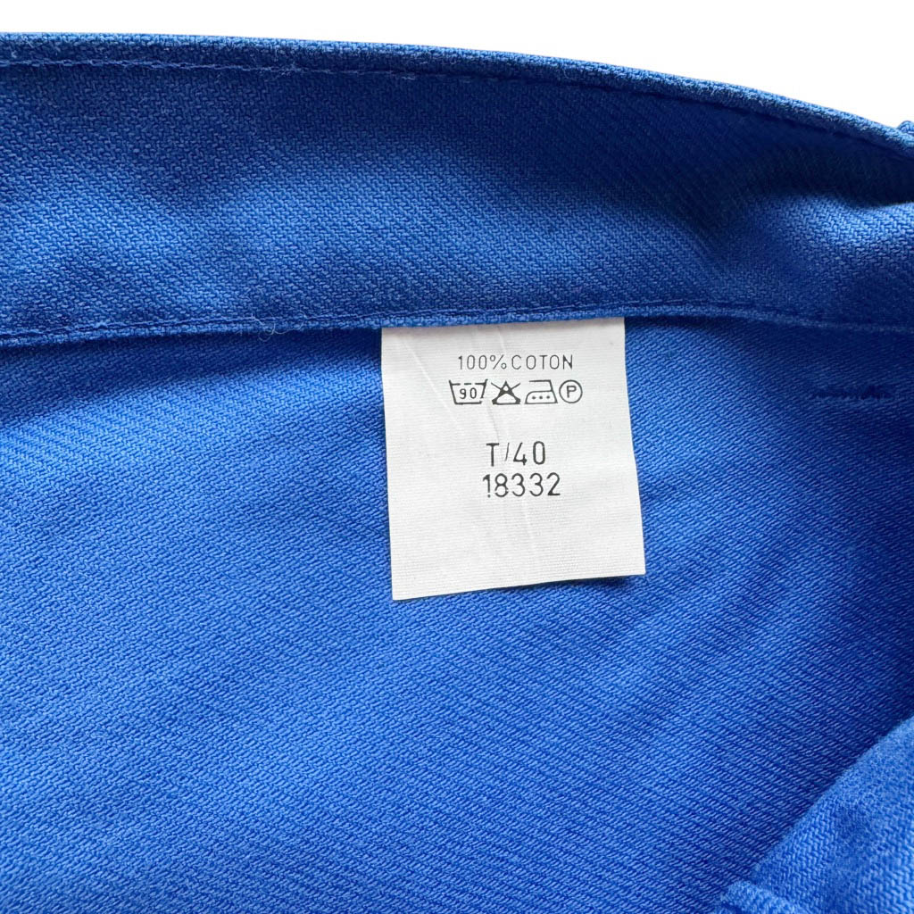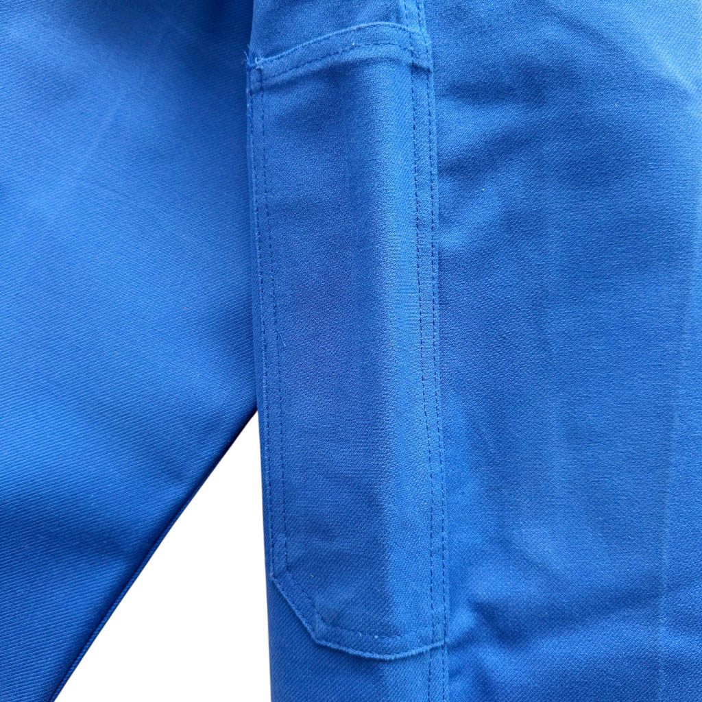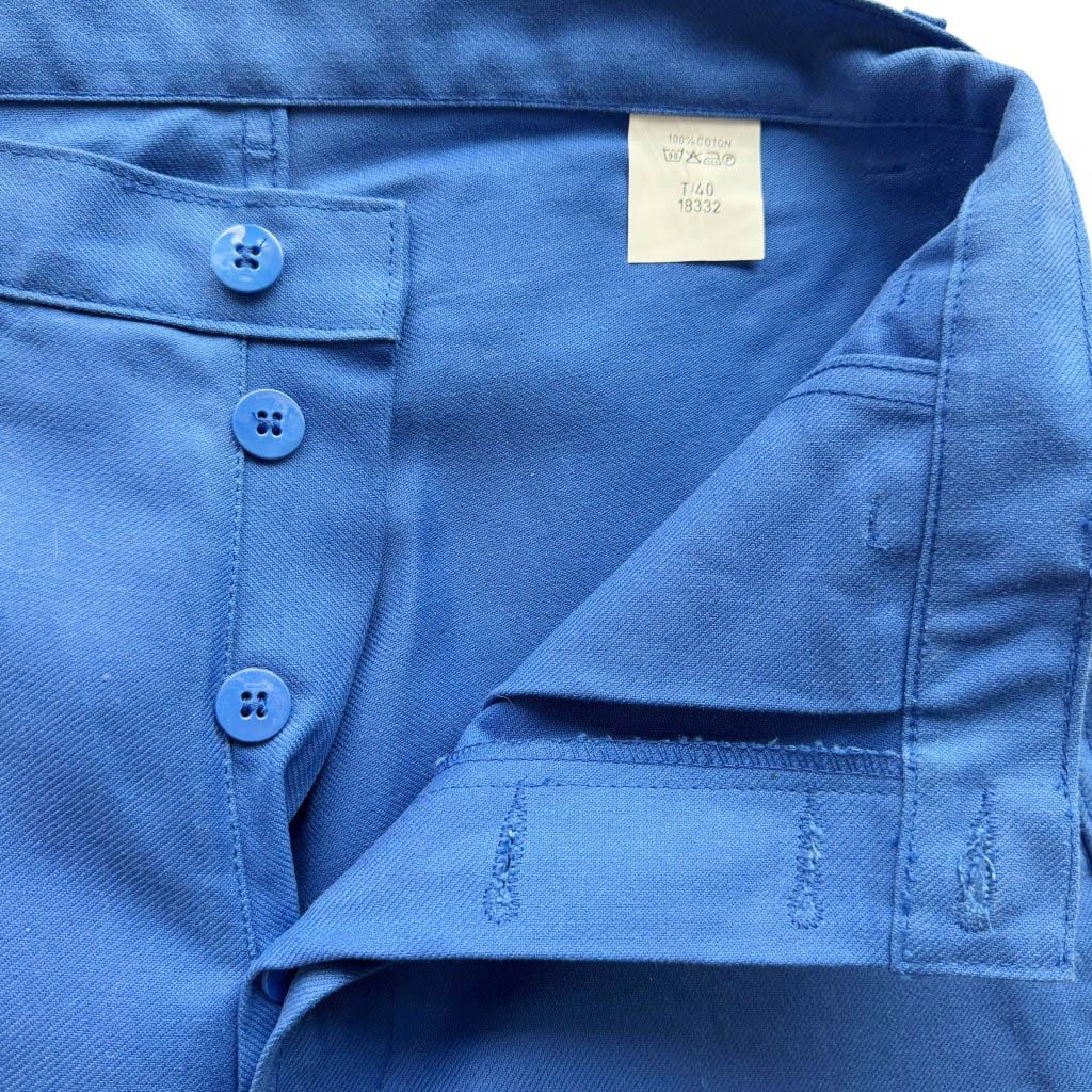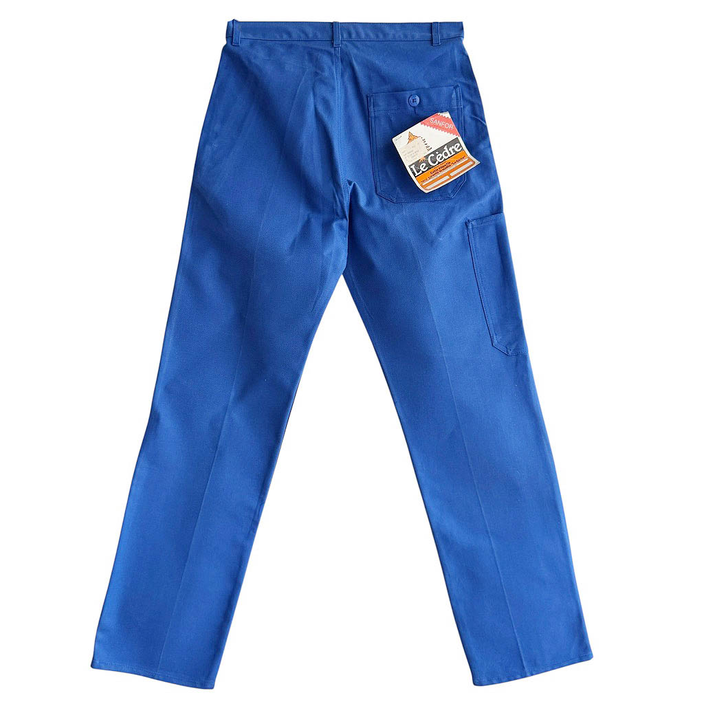 Pantalon coton bleu de travail Sanfor Elephant Paris Vintage Neuf d’époque, années 70, Taille haute 38 cm, hanches 50 cm, Longueur 109 cm, Longueur entrejambes depuis la taille 32 cm, Longueur jambe depuis la fourche 82 cm, Taille 40 / M
