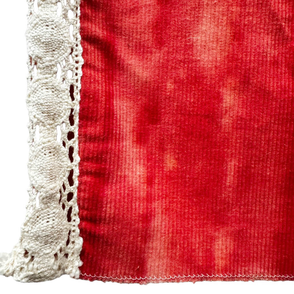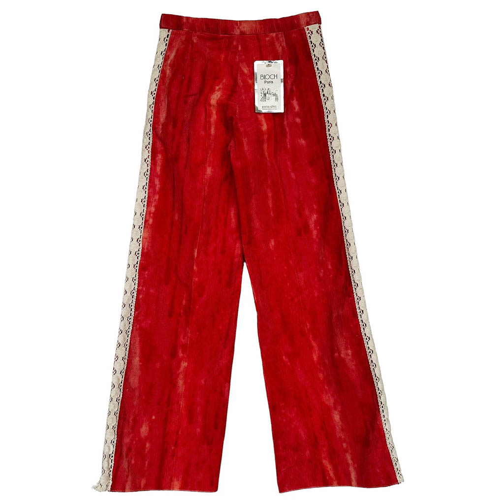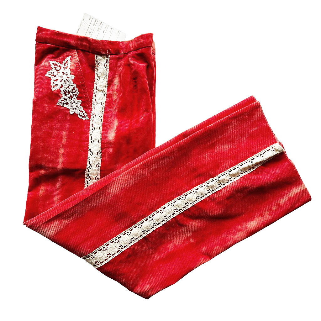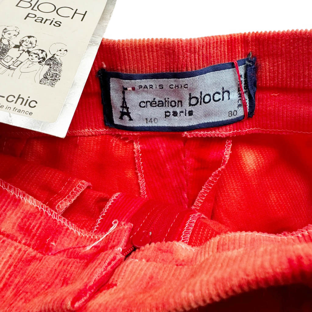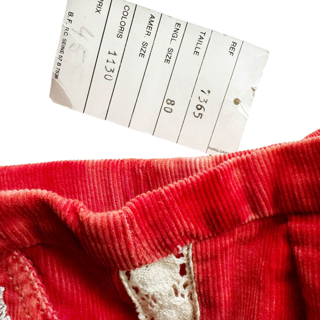 Pantalon kid pattes d’elephant corail Bloch Elephant Paris Vintage Années 70, dentelle coton et velours côtelé, Mesures à plat : Taille 30cm, Hanches 36cm, Longueur entrejambe depuis la taille 22cm, Longueur 95cm, 8ans