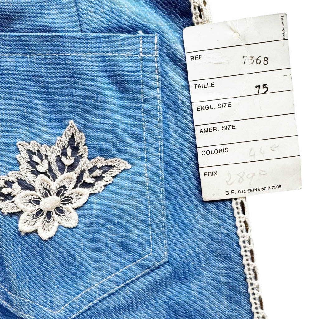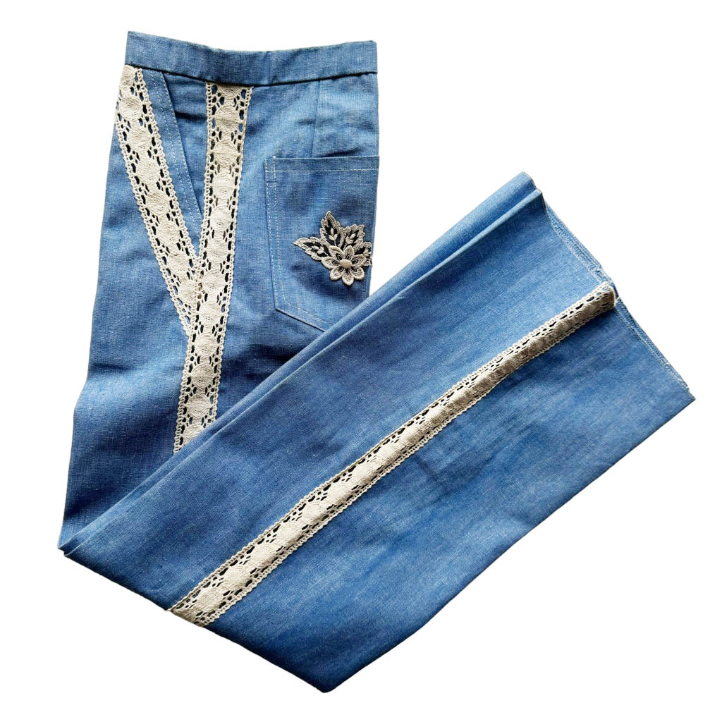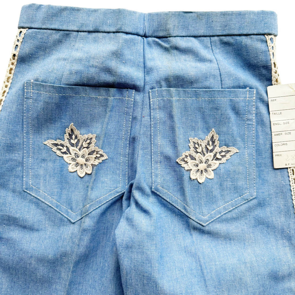 Pantalon kid pattes d’elephant jean Bloch Elephant Paris Vintage Années 70, dentelle coton et velours côtelé, Mesures à plat : Taille 31cm, Hanches 38cm, Longueur entrejambe depuis la taille 22cm, Longueur 92cm, 8/10ans