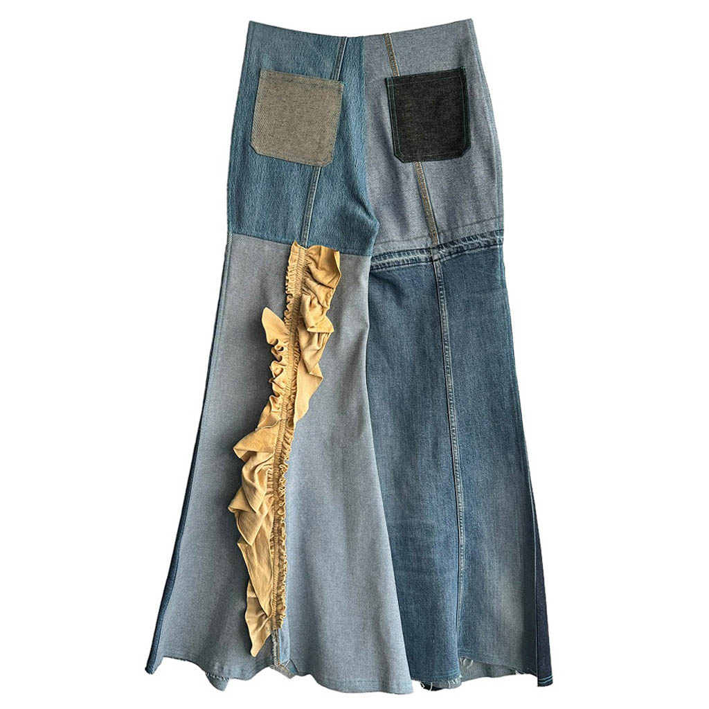 Pattes dEph patchwork jean zips et daim Elephant Paris Design Upcycling réalisé avec des matériaux anciens, denims coton, Pièce unique Made in France Taille haute 34cm, Hanches 42cm, Longueur entrejambes depuis la taille 32cm, Longueur 107cm, Taille 36/38