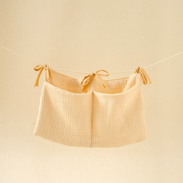 Cette pochette de rangement en gaz de coton est conçue pour s’accrocher facilement sur le bord du lit de bébé grâce à ses liens à nouer. Elle est l’accessoire idéal pour que vous puissiez ranger à portée de main les objets de votre bébé : tétines, doudous, histoire du soir.
