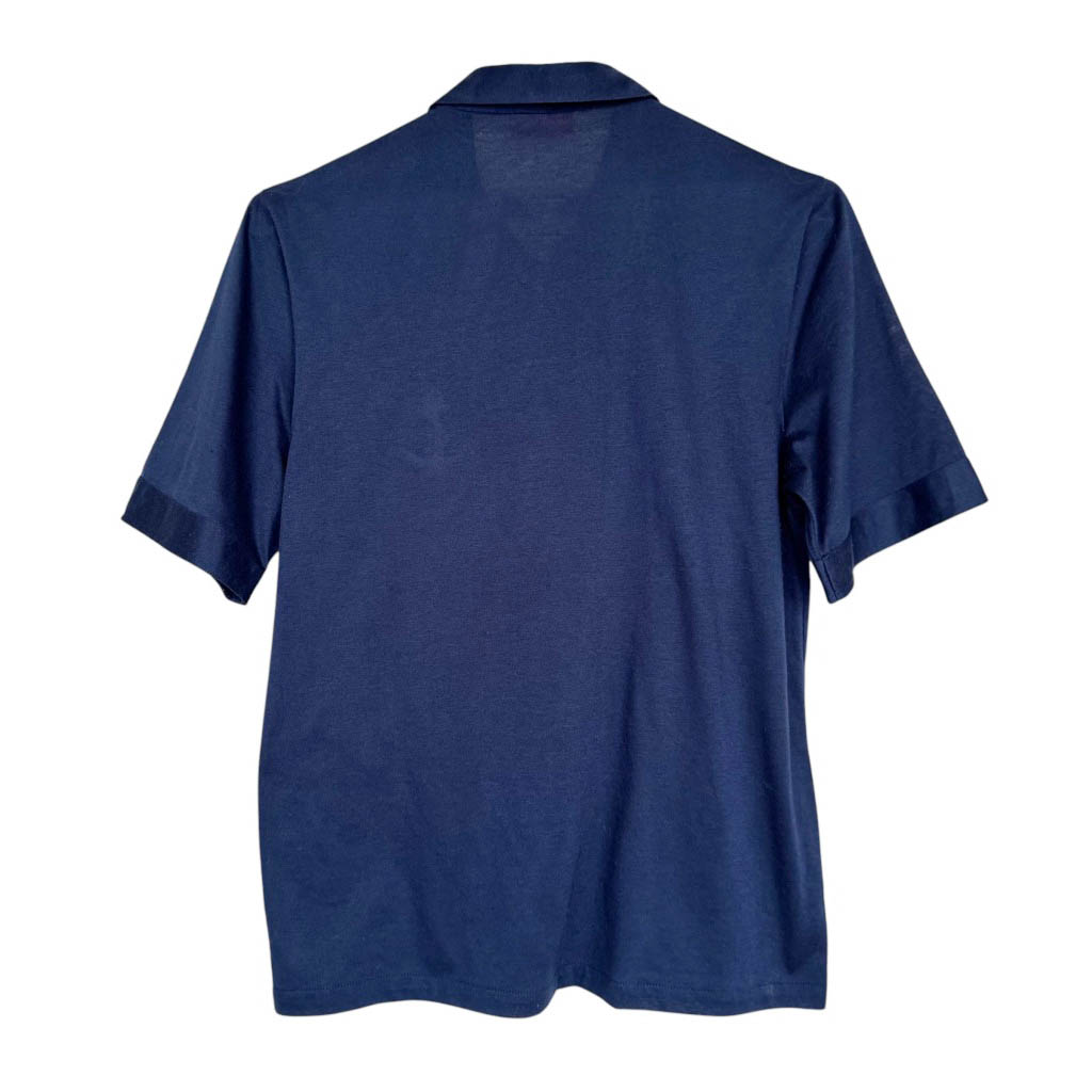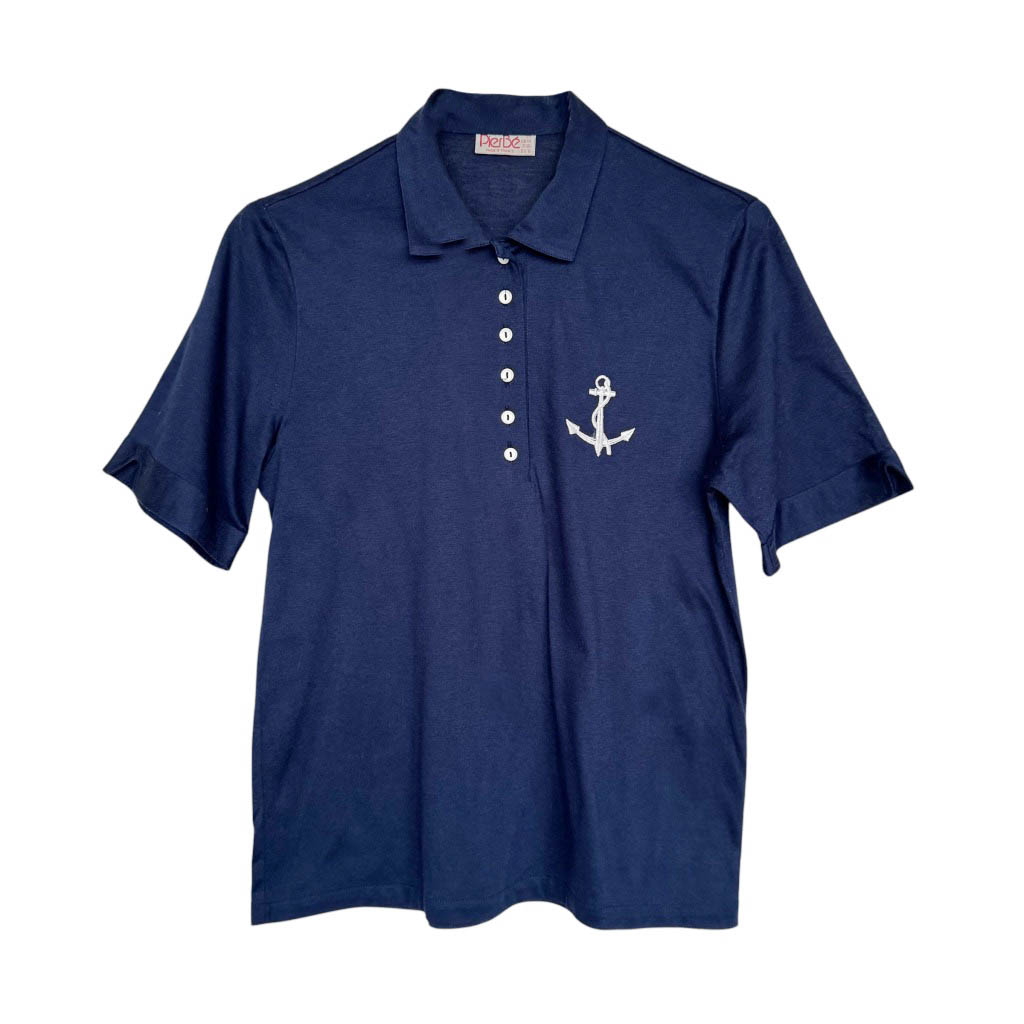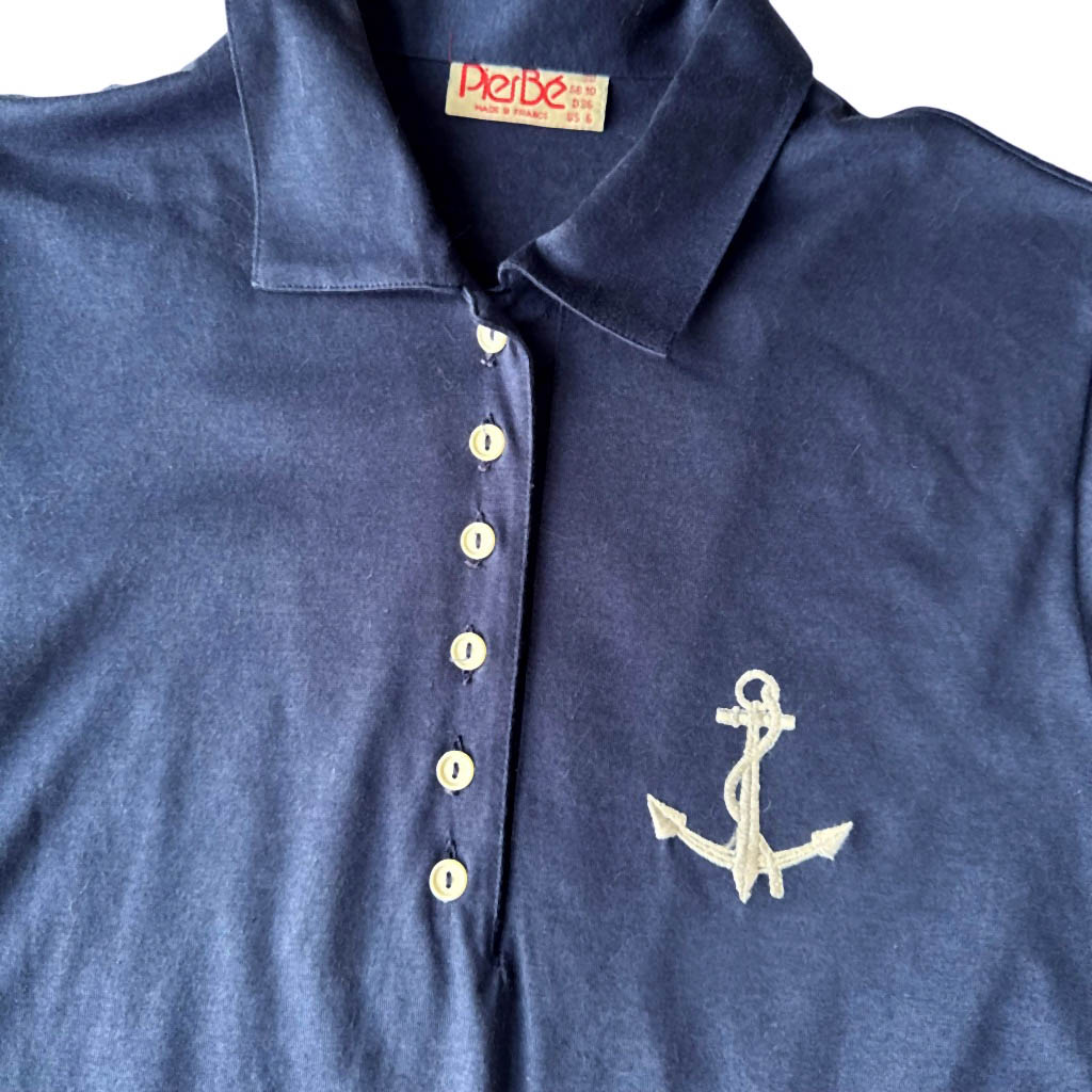 Polo ancre marine Pierbé coton Elephant Paris Vintage Polo en coton bleu marine fin et extensible de cette marque populaire Pierbé, vintage des années 70, avec une ancre brodée au blanc comme écusson Mesures prise à plat : Epaules 40cm, Poitrine 50cm, Longueur dos avec le col 63cm, Taille S/M