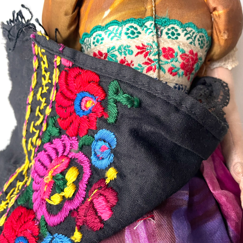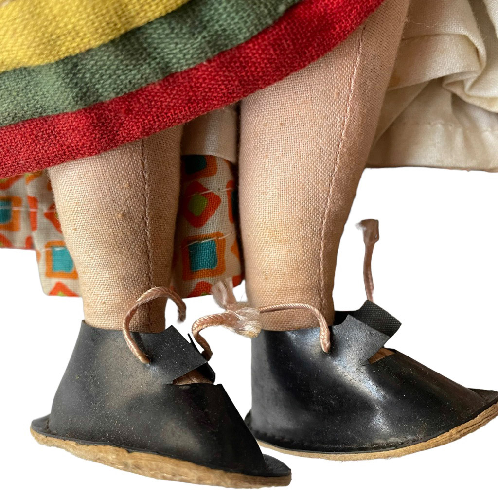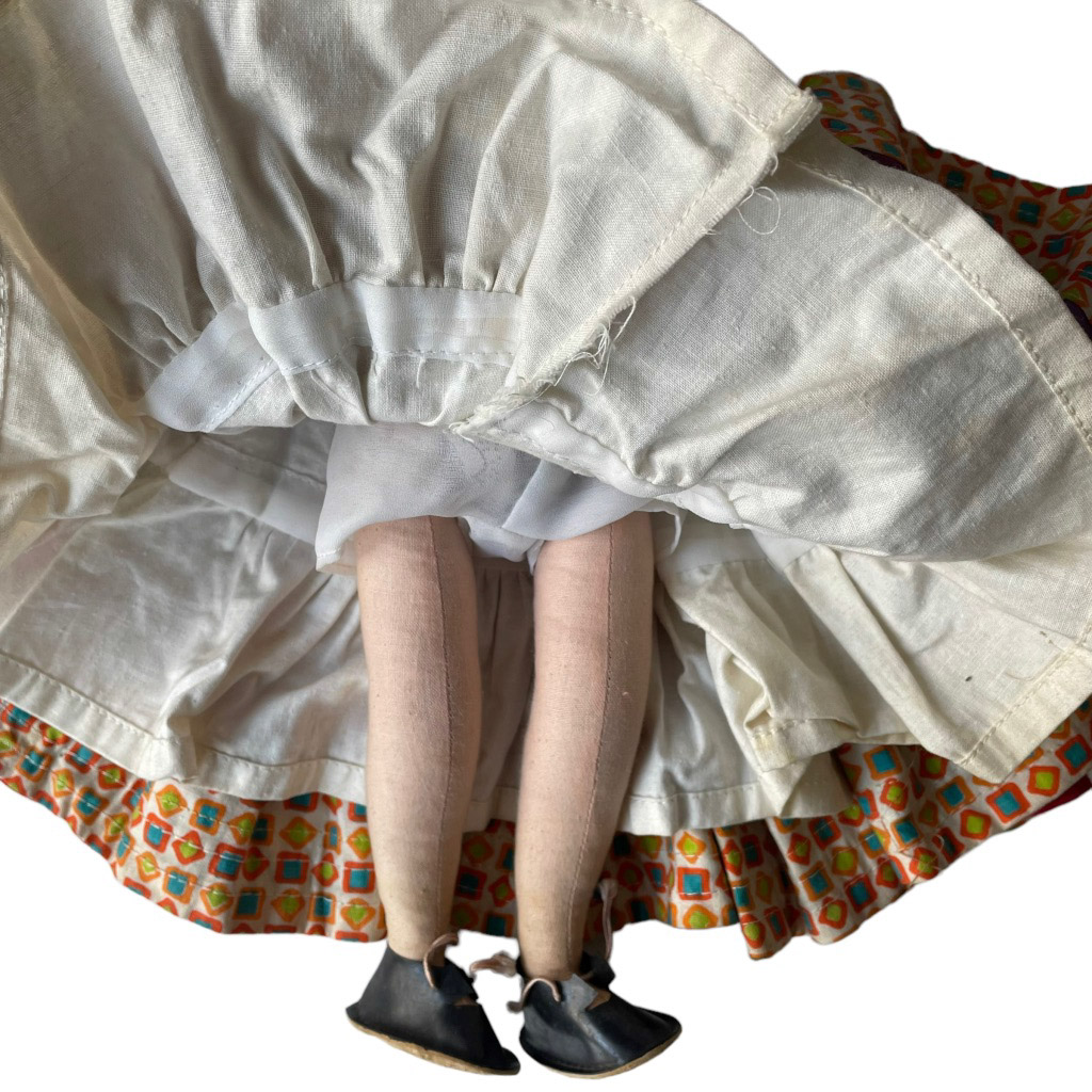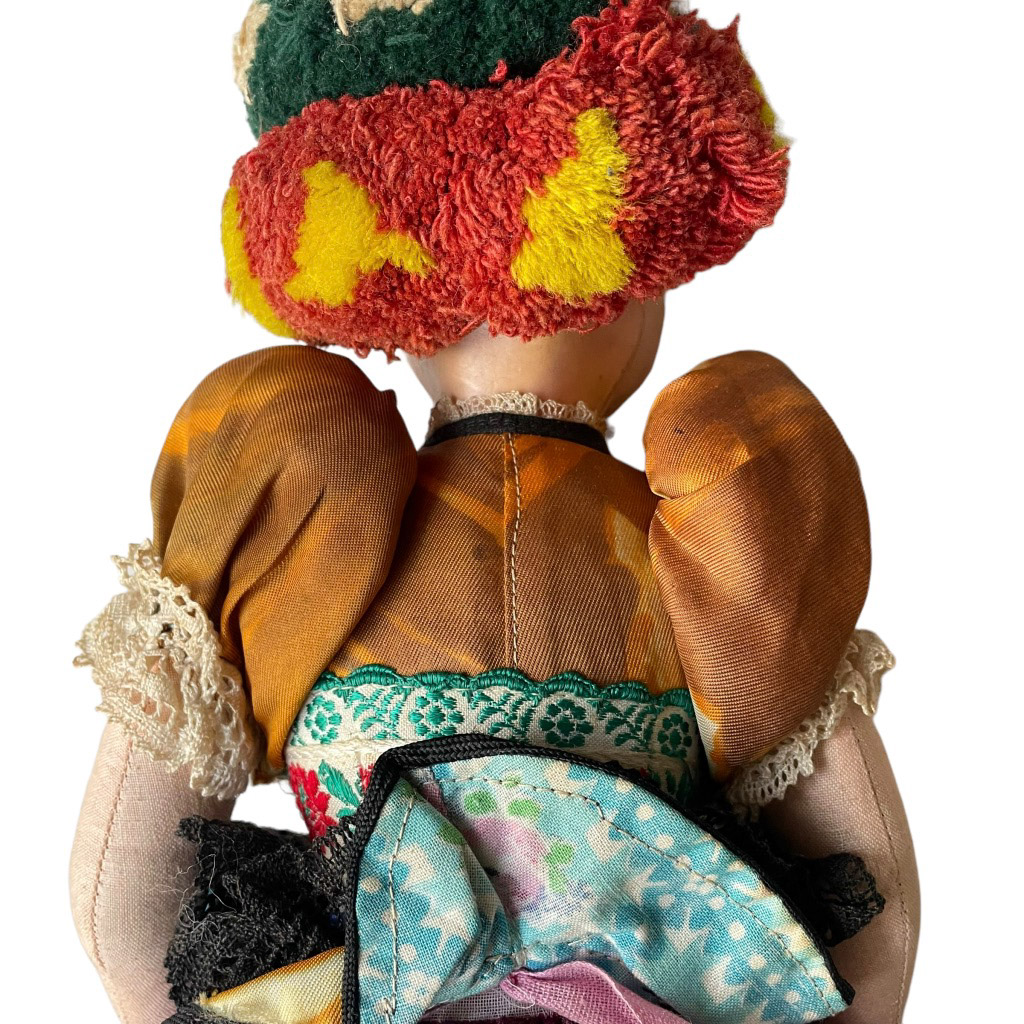 Poupée ancienne de vitrine, vintage 1940, hauteur 45cm, bon état général sauf la tête et une partie du bandeau, voir dernière photo