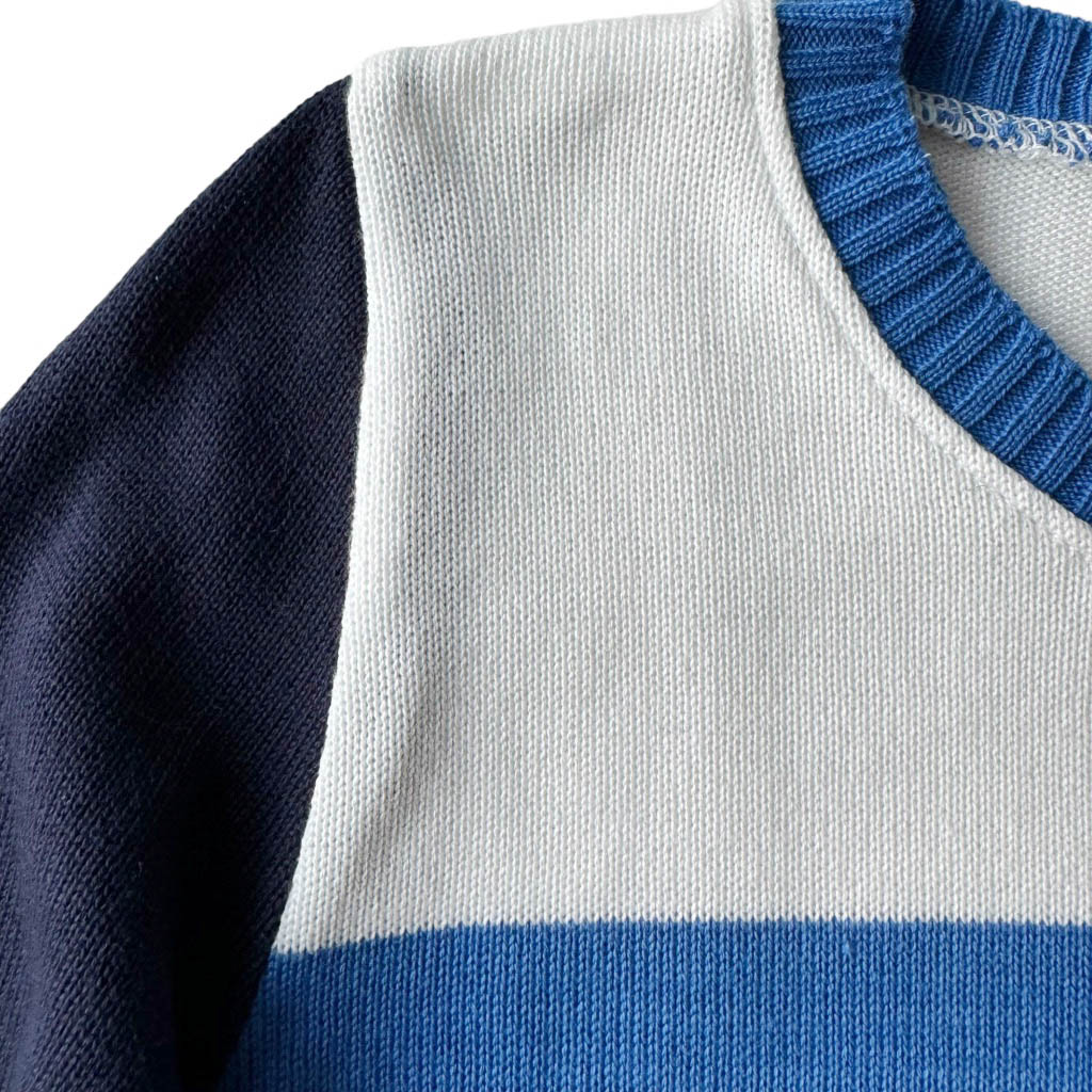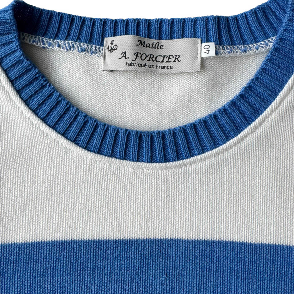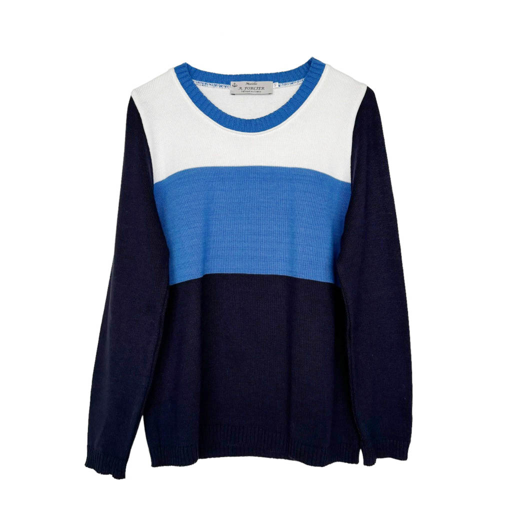 Pull rayé marine blanc bleu A.Forcier Elephant Paris Vintage Années 70, trois rayures dégradées du bleu marine au blanc, compose ce pull léger laine fine et coton, maille extensible belle qualité, coupe droite, made in france Mesures à plat : Epaules 40/45cm, Poitrine 47/59cm, Longueur dos 60cm, Taille globale M/ 38/40