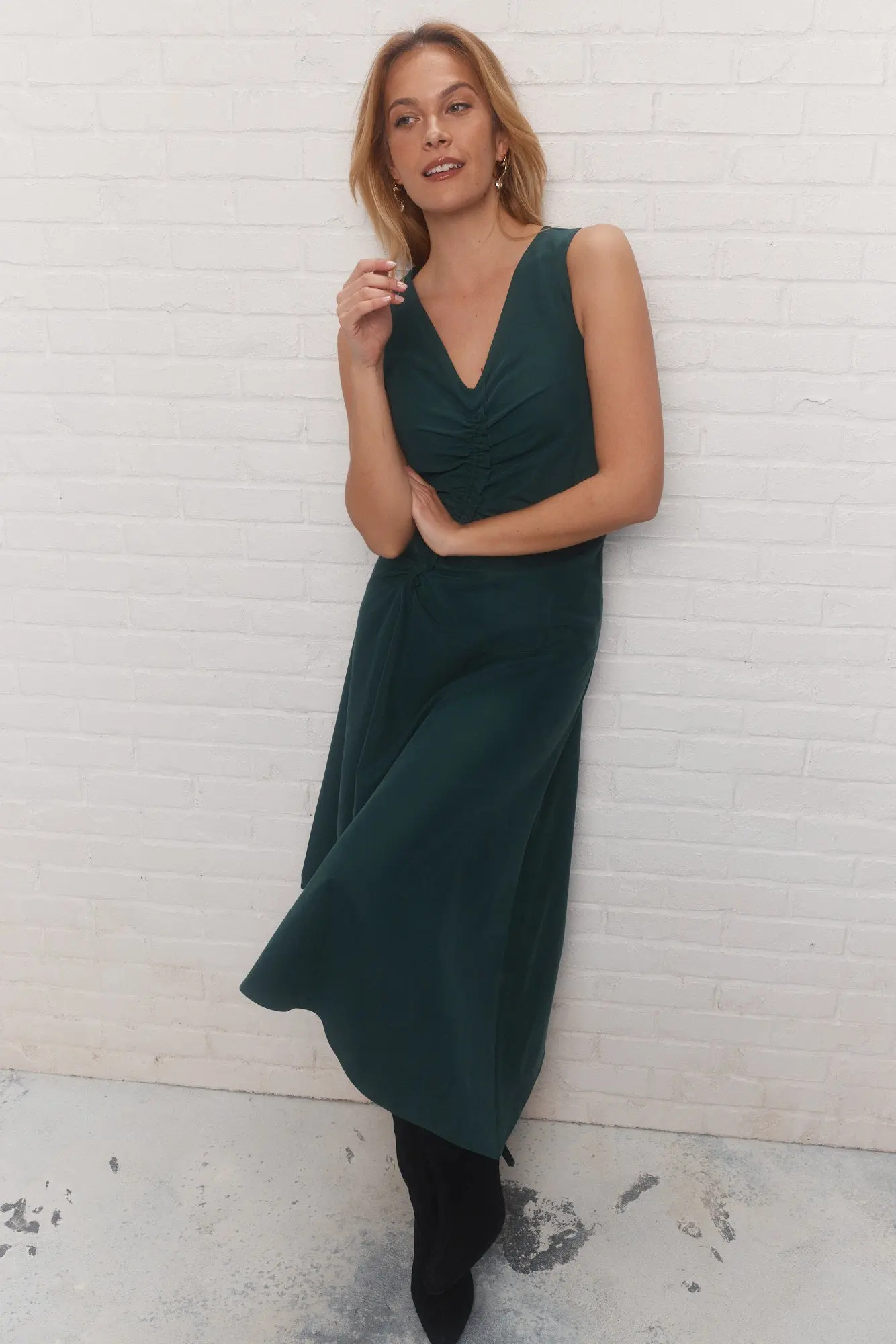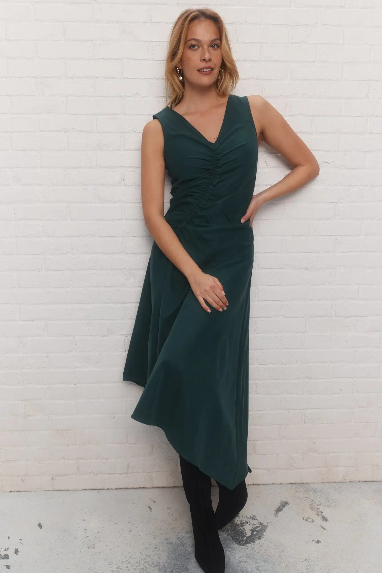 Féminité et confiance se rencontrent dans la robe longue asymétrique vert foncé Rata, une pièce d’art signée JOELLE. Voici la meilleure tenue pour vous démarquer lors de votre prochaine sortie! Sa couleur et ses découpes asymétriques la distinguent, tandis que son col en V et ses plis lui donnent un air très sophistiqué. Pour un look décontracté chic, portez-la avec une casquette et des espadrilles.