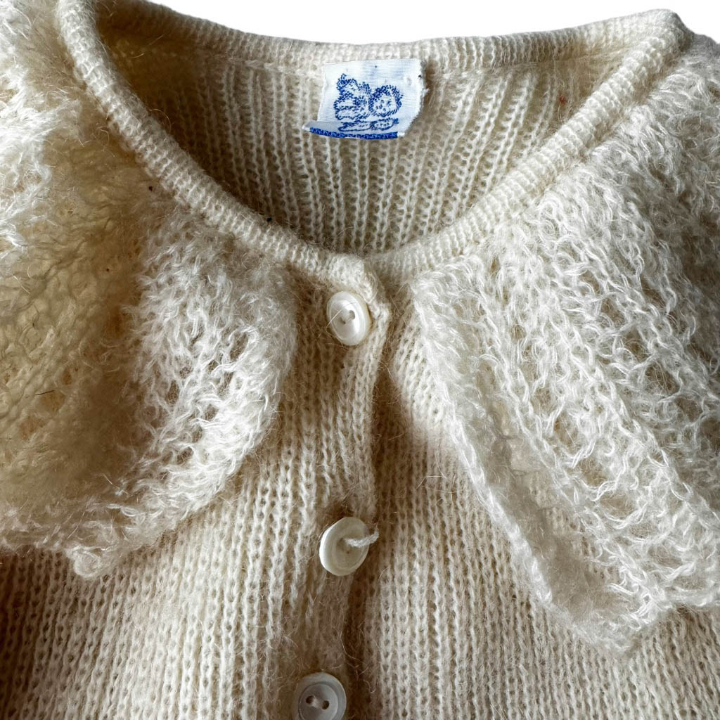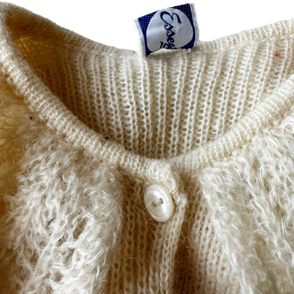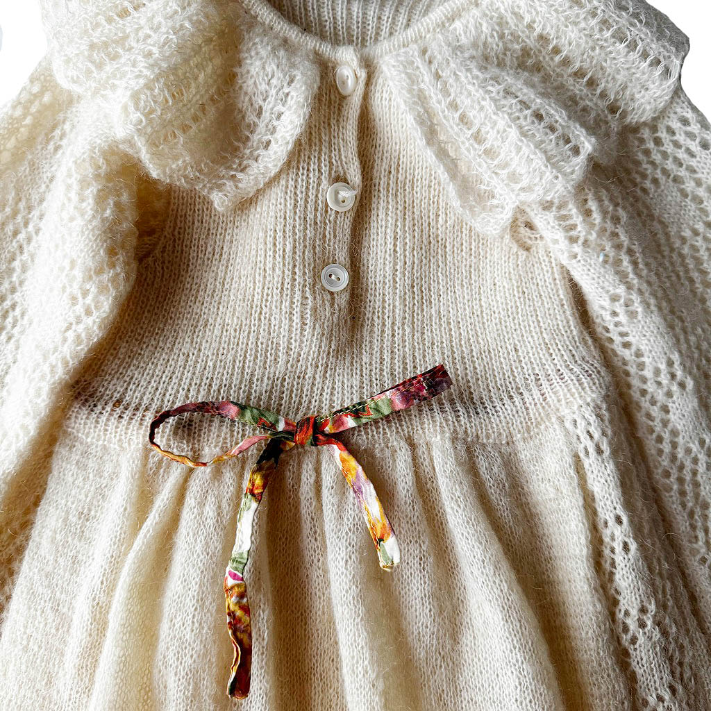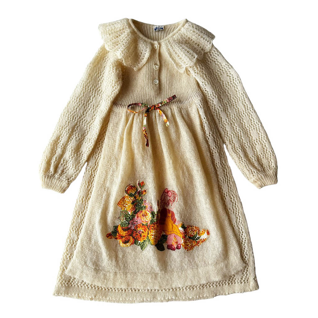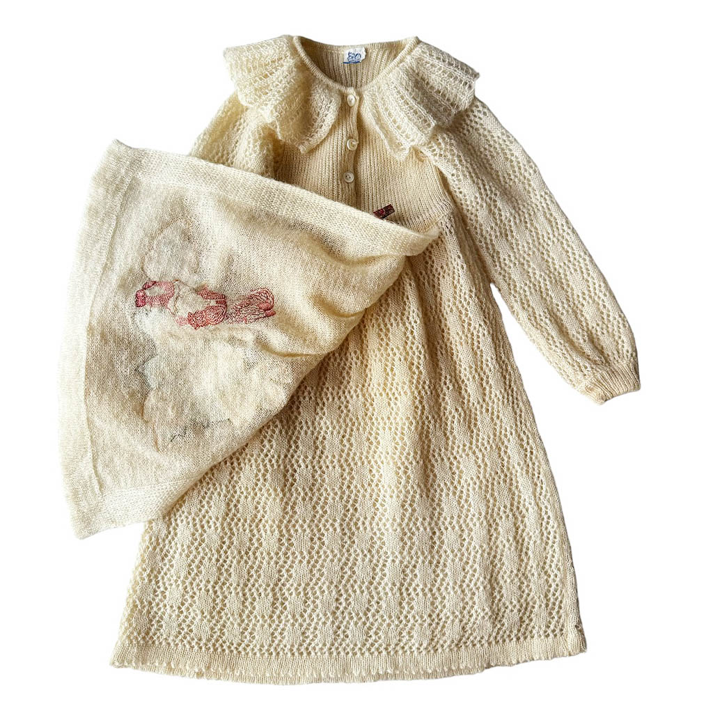 Robe bébé 24 mois Essegi 70s Robe tablier mohair Essegi 70s Elephant Paris vintage Neuve d’époque, années 70, Laine mohair et incrustations brodées en coton, neuve d’époque, Longueur dos 62cm Age présumé 24 mois