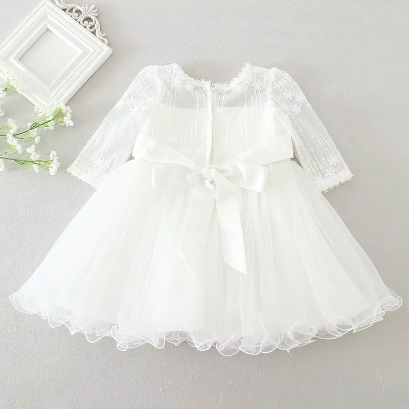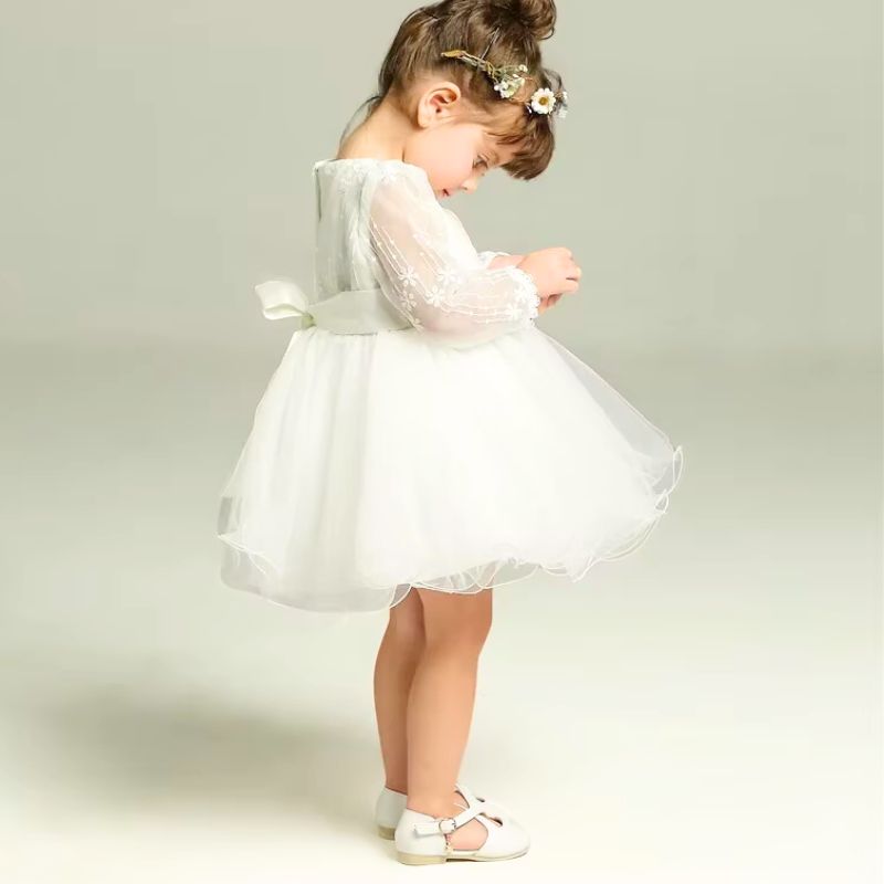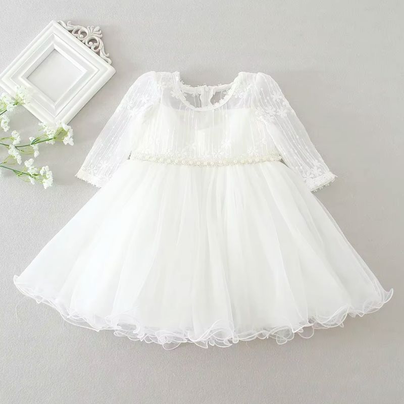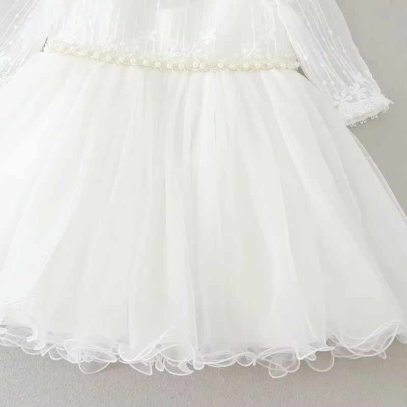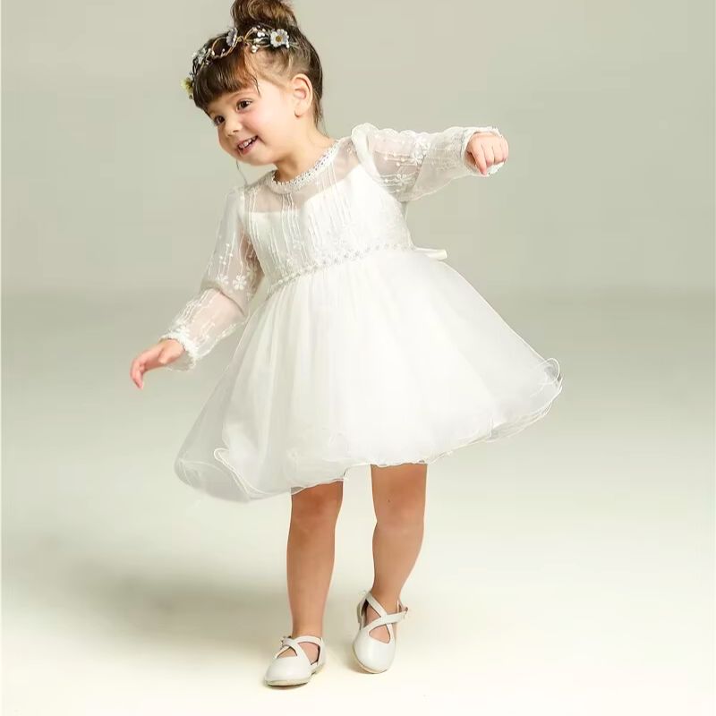 Découvrez une robe blanche de cérémonie qui incarne l’élégance absolue, idéale pour mariages, baptêmes et fêtes inoubliables. Avec ses manches longues en dentelle délicate, sa jupe en tulle fluide et ses perles raffinées à la taille, elle fera de votre petite princesse la véritable étoile de l’événement. Le corsage finement brodé et les manches transparentes ajoutent un charme intemporel, tandis que la jupe vaporeuse apporte une touche féérique et majestueuse.