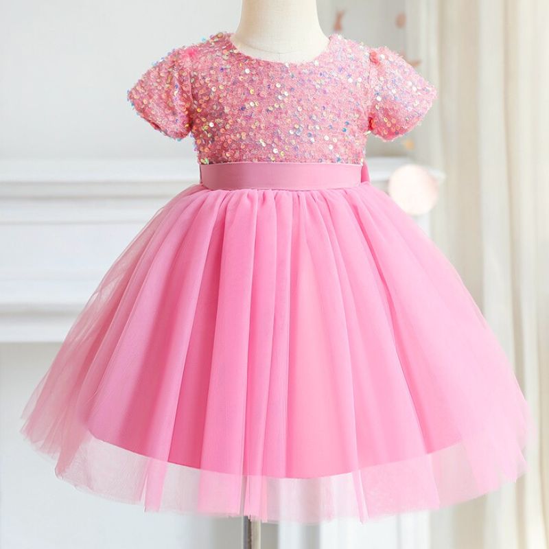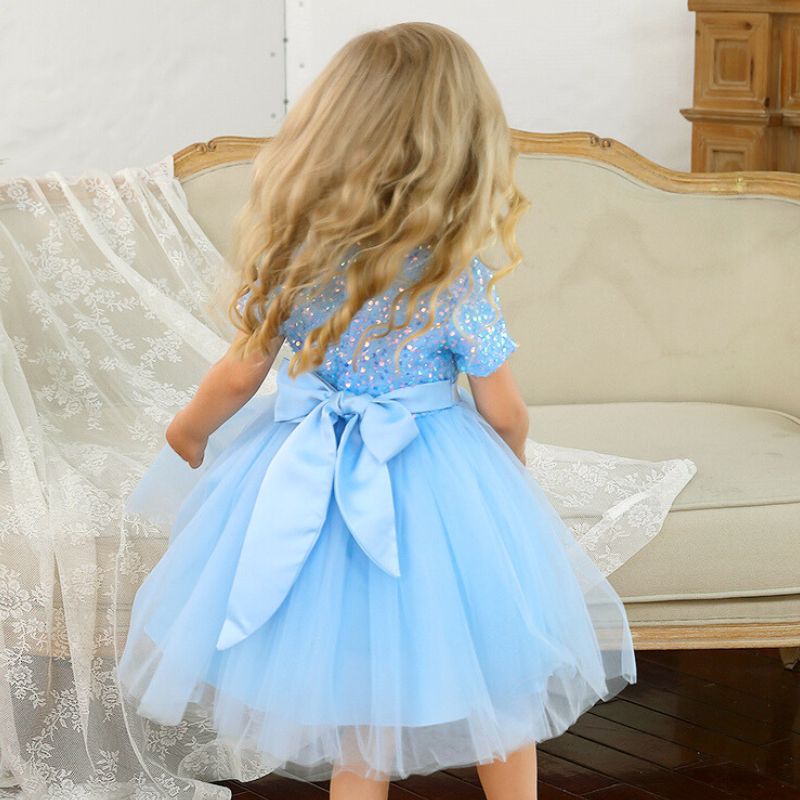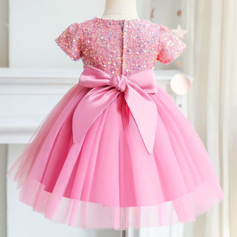 - Détails : Paillettes, nœud en satin, manches courtes
