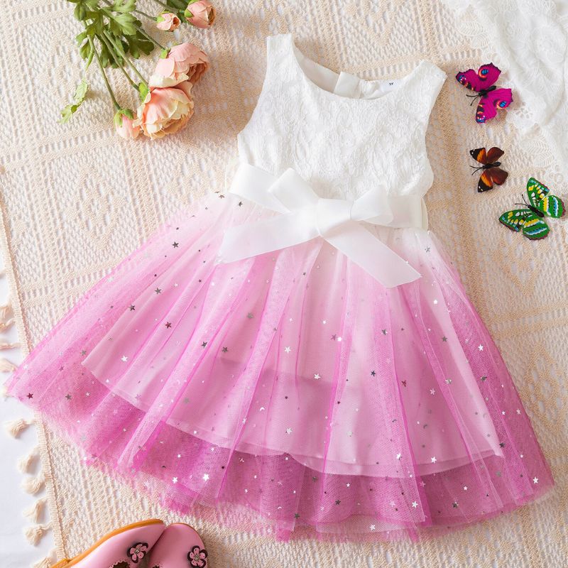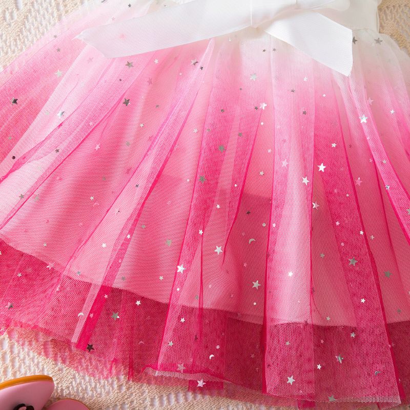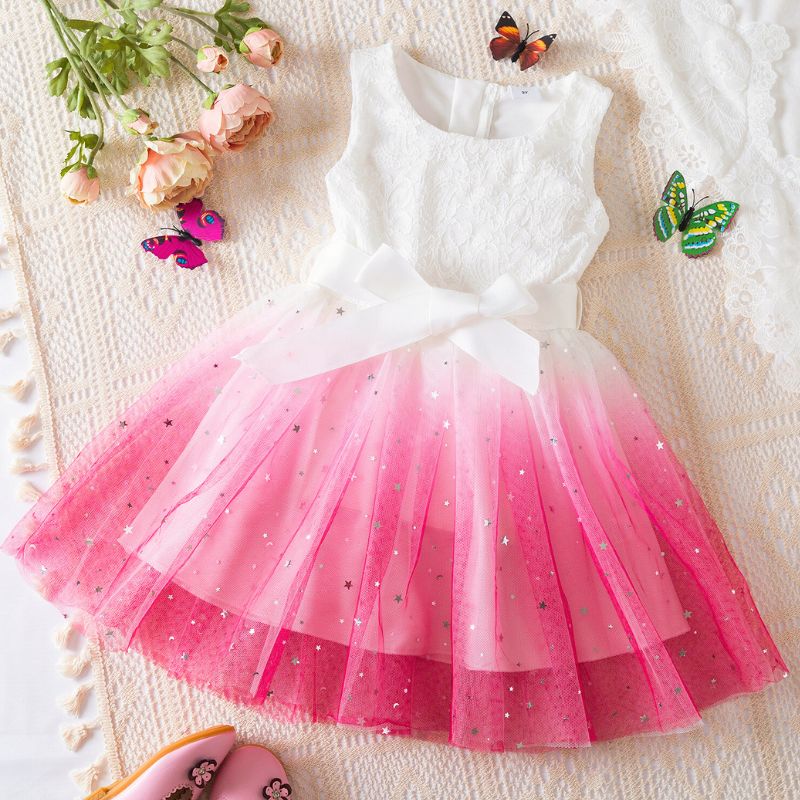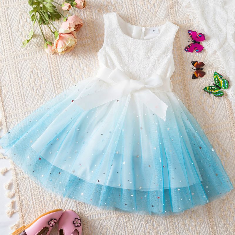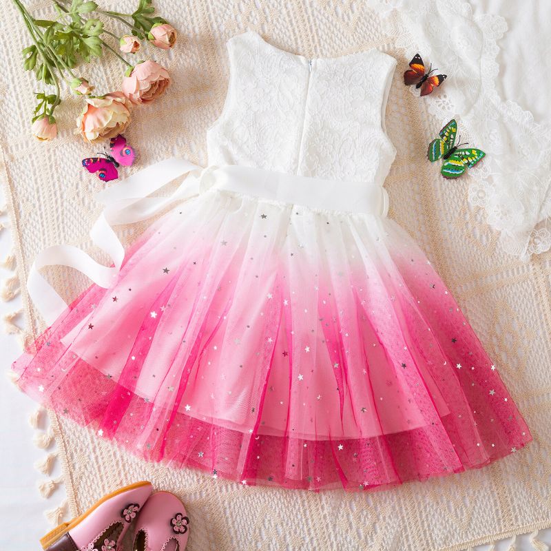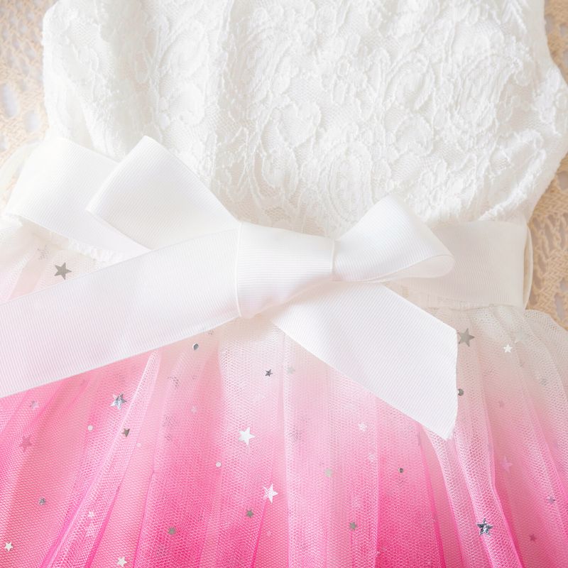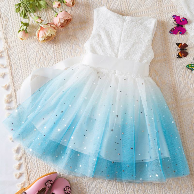 Laissez la magie opérer avec cette robe de cérémonie, spécialement conçue pour transformer votre petite fille en princesse lors de mariages, baptêmes ou autres moments enchantés. Ce modèle éblouissant allie un haut en dentelle blanche d’une finesse exquise à une jupe en tulle pailleté qui évoque un doux rêve féérique. Le tulle léger se décline dans un dégradé délicat, du blanc vers des nuances de rose tendre ou de bleu ciel, parsemé de petites étoiles argentées qui dansent à la lumière, ajoutant une touche de magie scintillante.