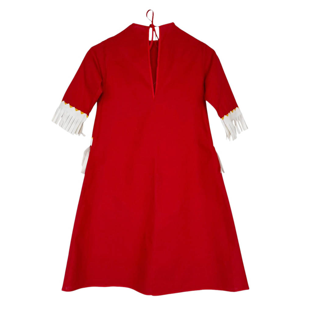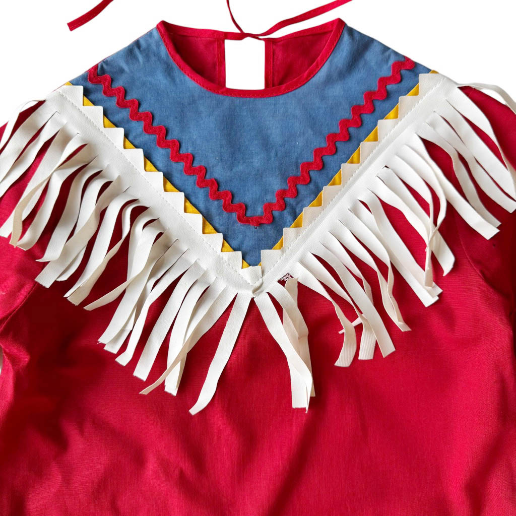 Robe indienne coton et frange enfant Elephant Paris Vintage Déguisement de belle qualité et belle façon, années 7 0, en coton et franges en vinyl, croquet rouge formant le plastron, se noue dans la nuque, Mesures prises à plat : Epaules 2 9 c m, Poitrine 3 6 c m, Taille 3 8 c m, Longueur dos 8 2 c m, Taille X S / S