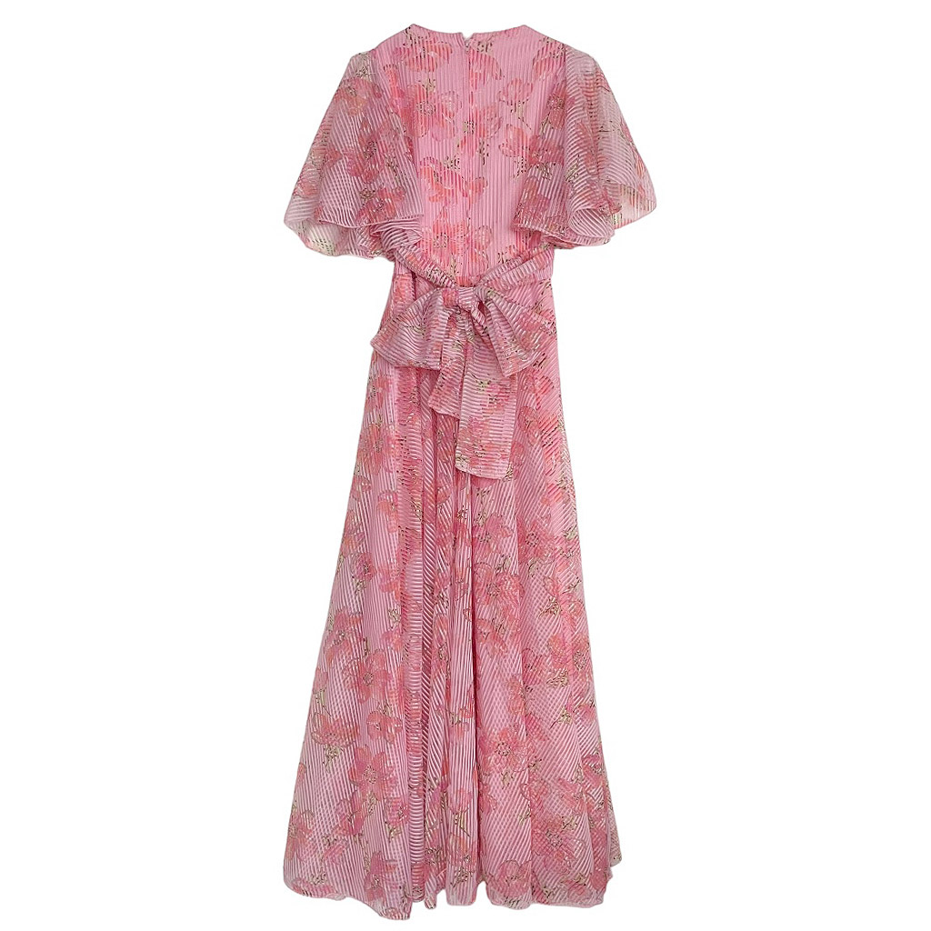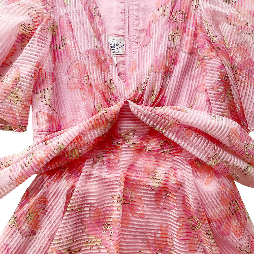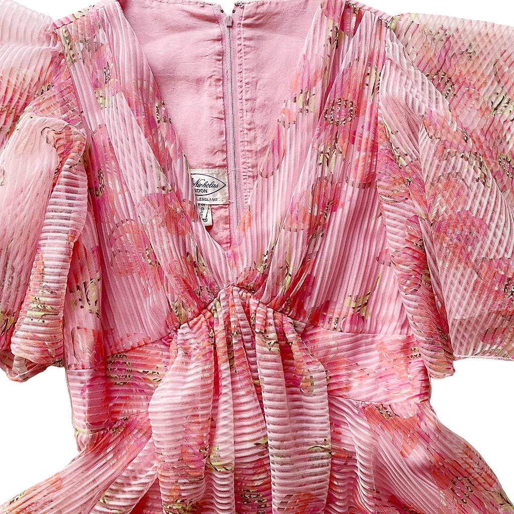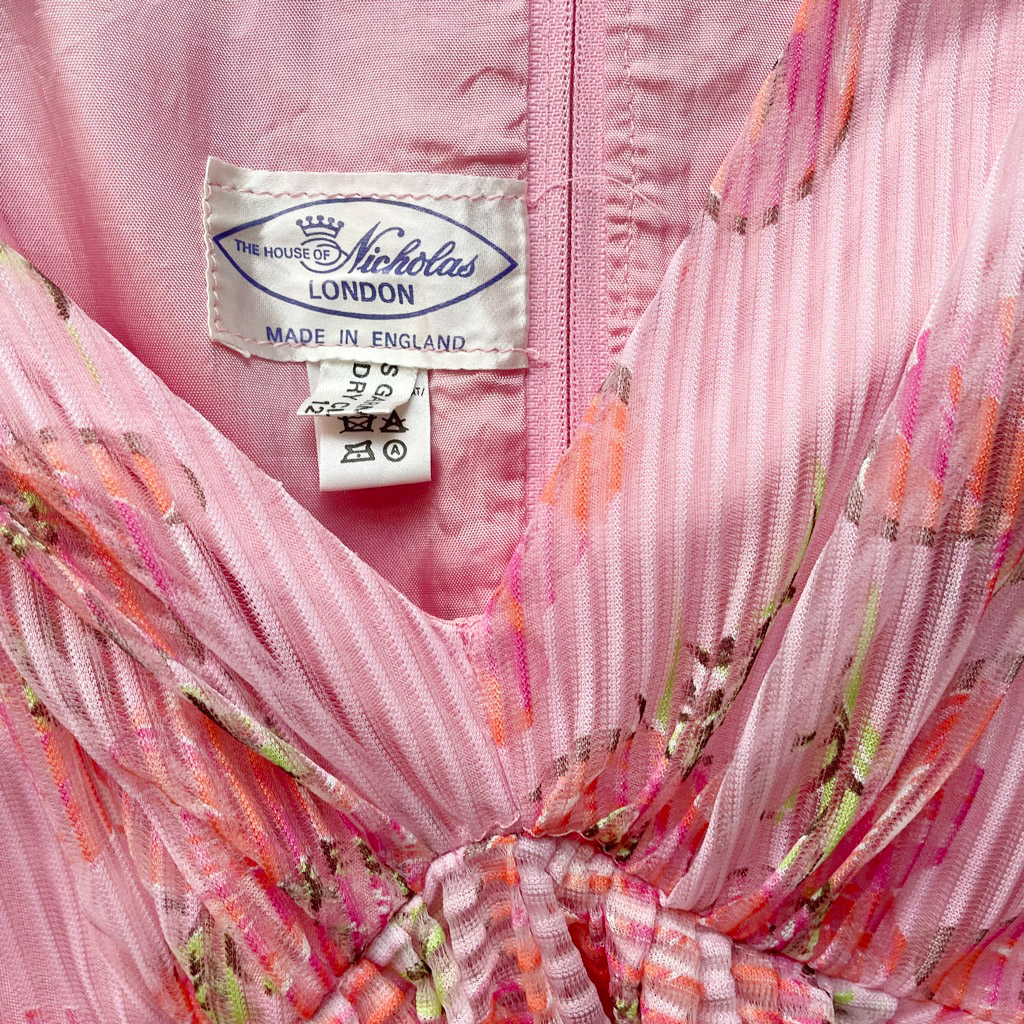 Robe longue rose Nicholas London Robe longue rose pastel en nylon rayé et ajouré Nicholas London, années 70s, doublée, zippée dans le dos, décolletée en v, Taille S Elephant Paris Vintage Mesures à plat : Epaules 31cm, Poitrine 40cm, Taille 36cm, Longueur dos 140cm, Taille 36