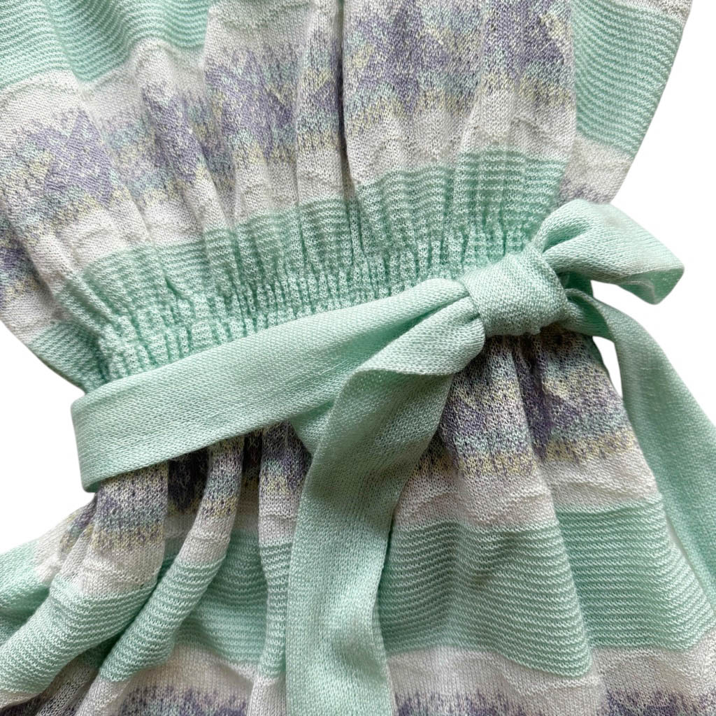 Robe maille fine Ted Lapidus tricots Elephant Paris Vintage Robe pastel en maille fine et légère semi-transparente, ceinturée, taille marquée élastique, vintage des années 80, coton, Mesures à plat : Epaules 66cm, Poitrine 67cm, Taille élastique 33/53cm, Longueur dos 123cm, Taille 38, Neuve d’époque