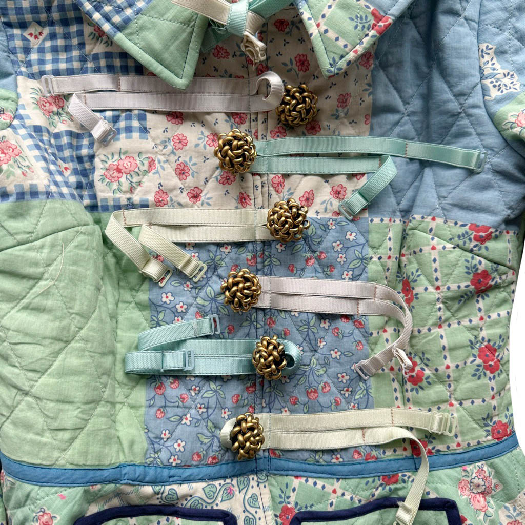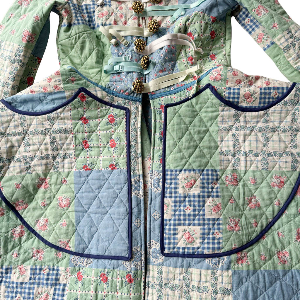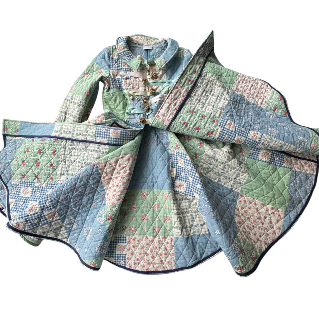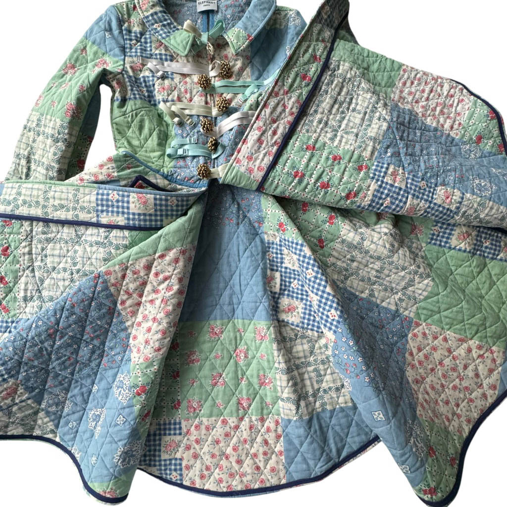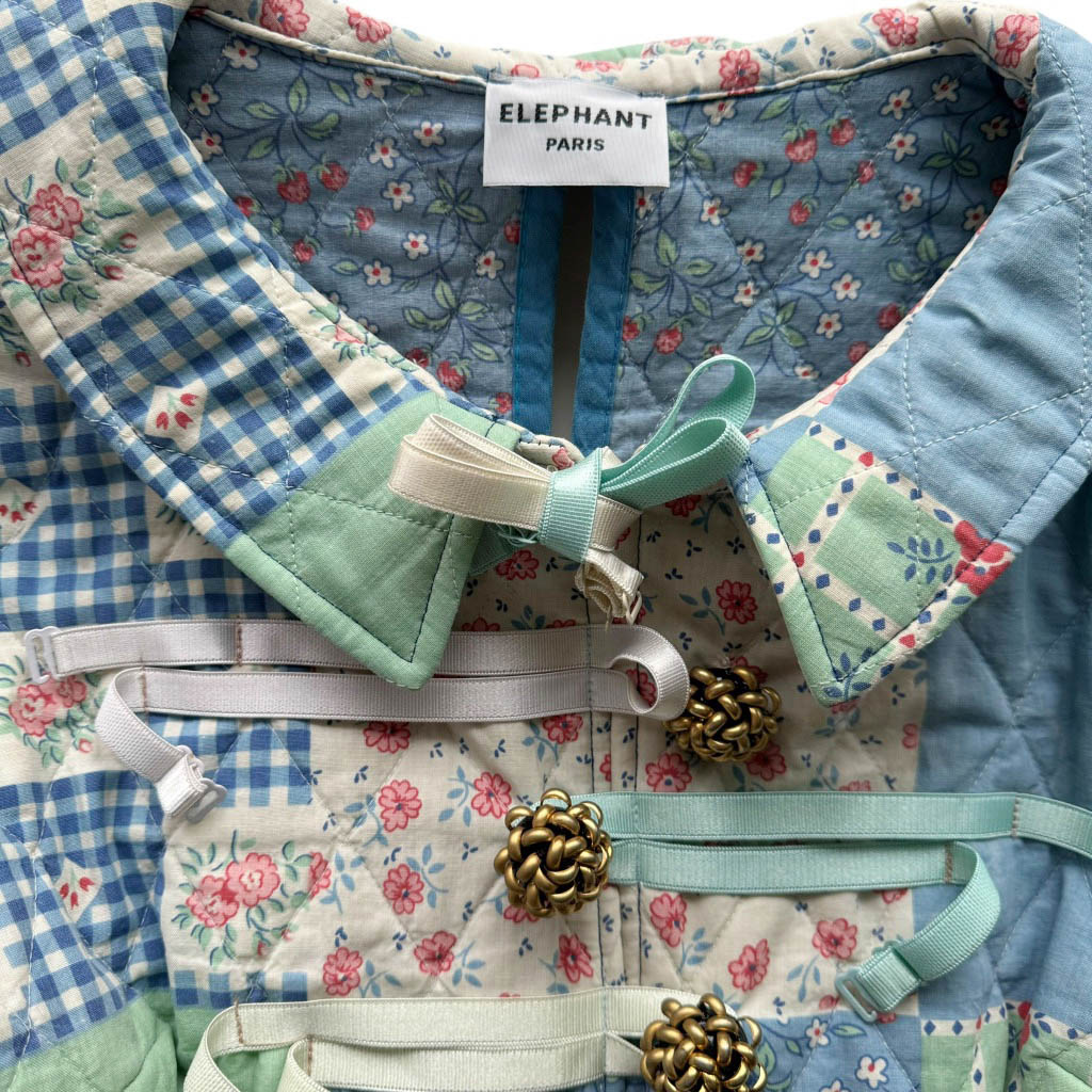 Robe-manteau coton matelassé Elephant Paris Design réalisé avec des matériaux anciens, coton matelassé fin des années 70, deux grandes poches plaquées devant, finitions gansées au biais de coton couleur marine, gros boutons bijoux en métal doré Pièce unique Made in France, Taille 36 / S