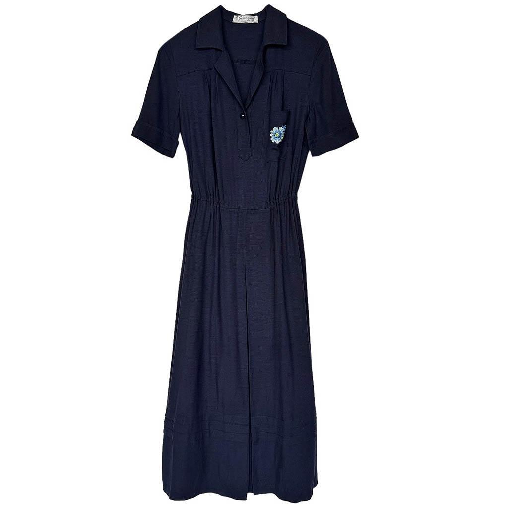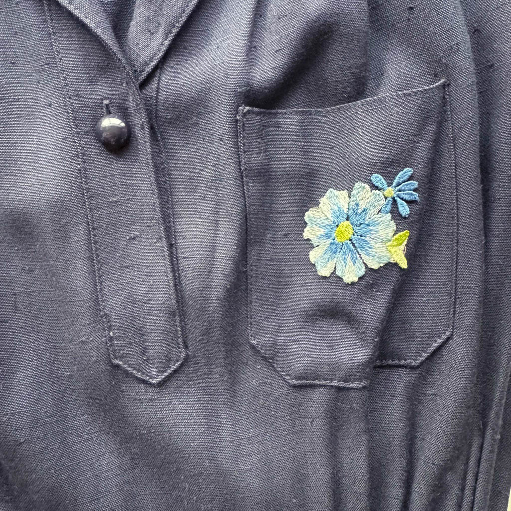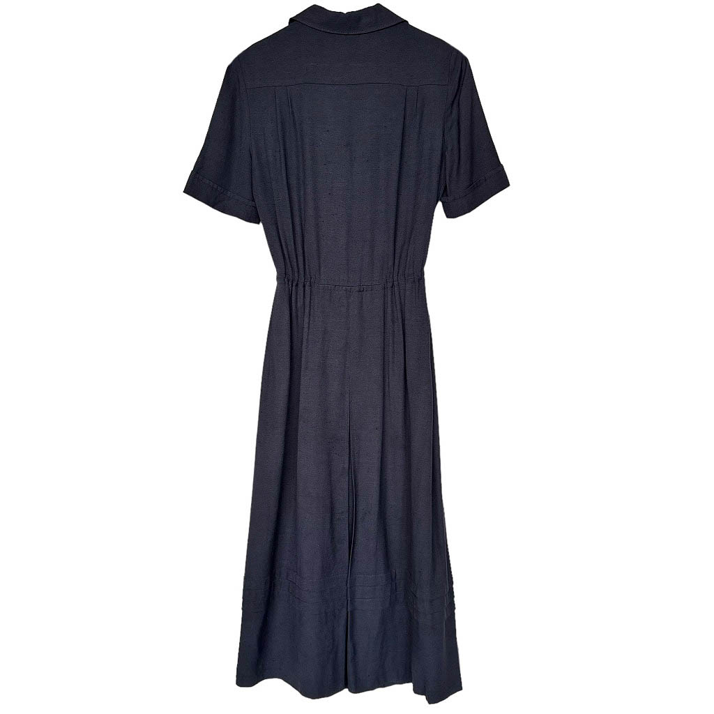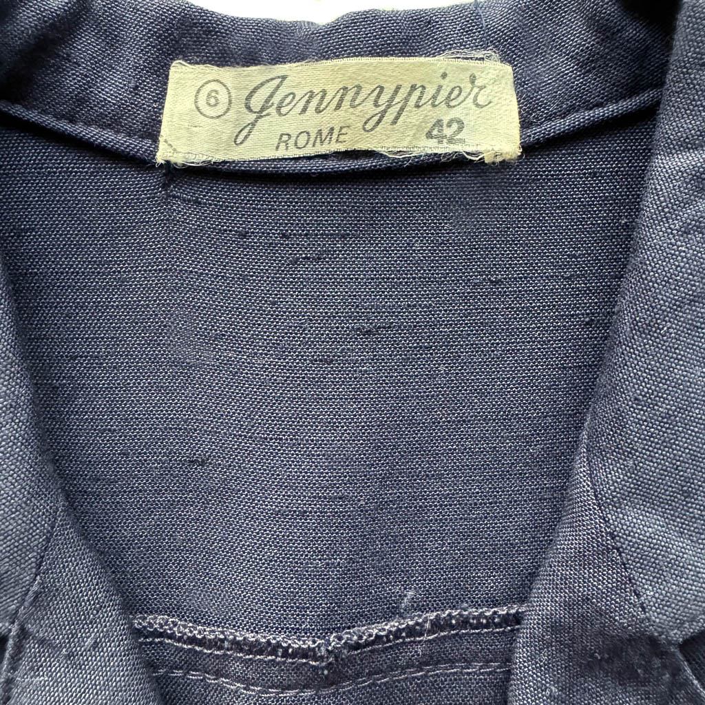Robe marine Jennypier Elephant Paris Vintage Années 70, coton et lin, Mesures à plat : Epaules 36cm, Poitrine 47cm, Taille élastique 27/37cm, Longueur dos sans le col 114cm, Taille 36/S