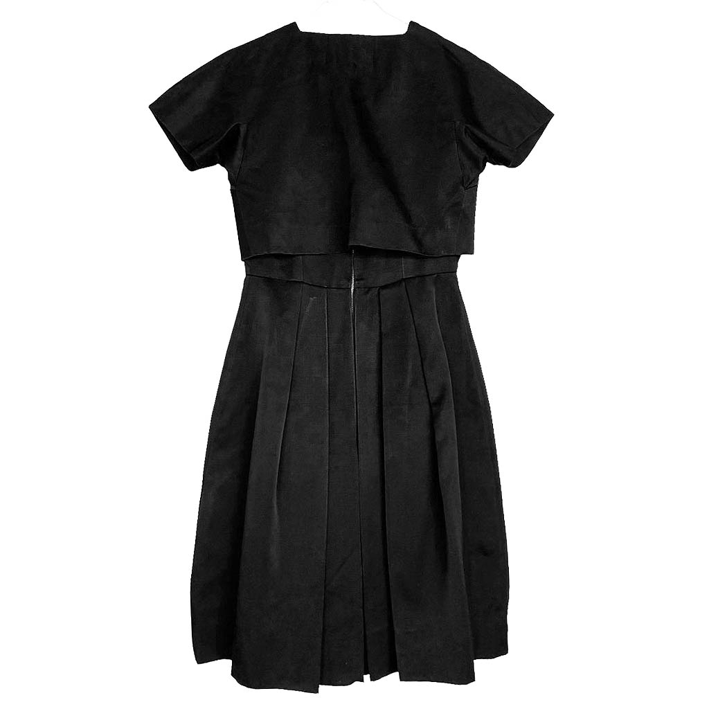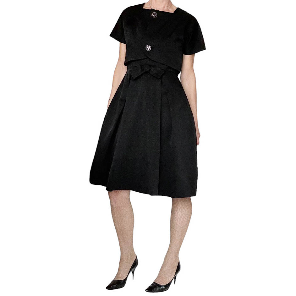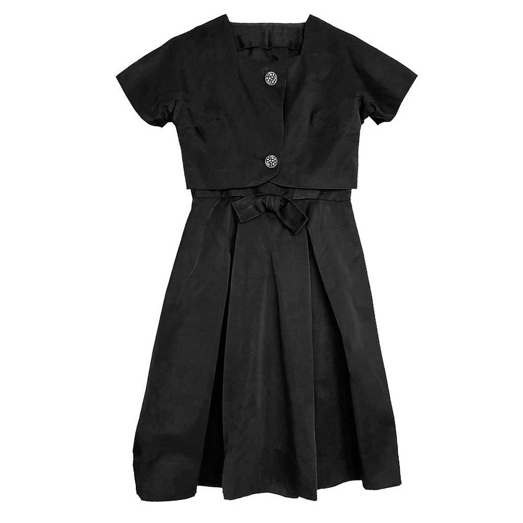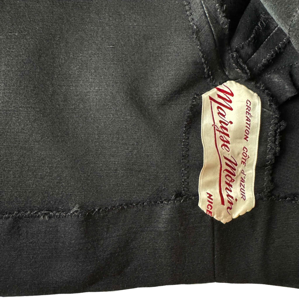 Robe noire bolero Maryse Monin 50s en satin rigide et coton, boutons bijoux, Elephant Paris vintage Taille mesure à plat 36cm, Taille 36/S