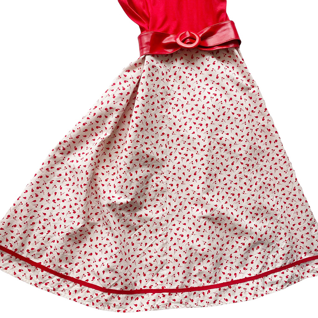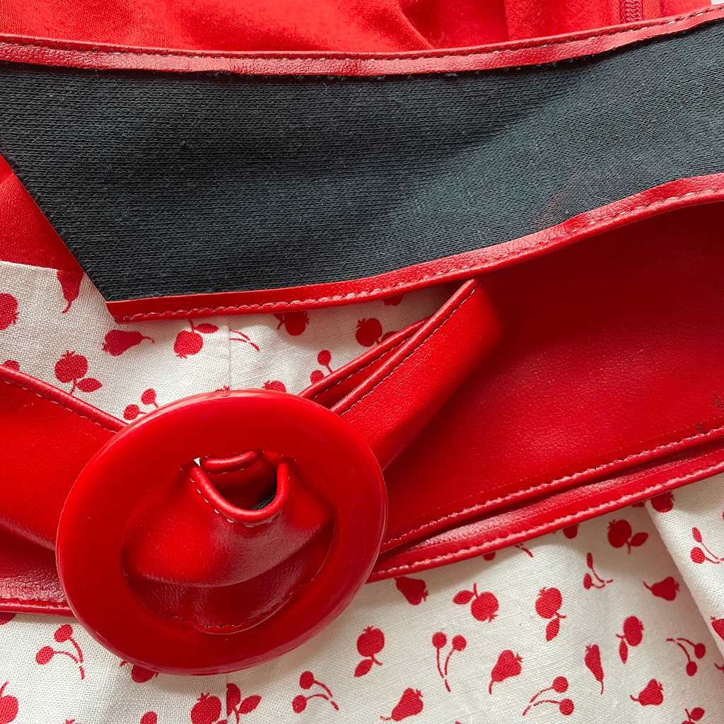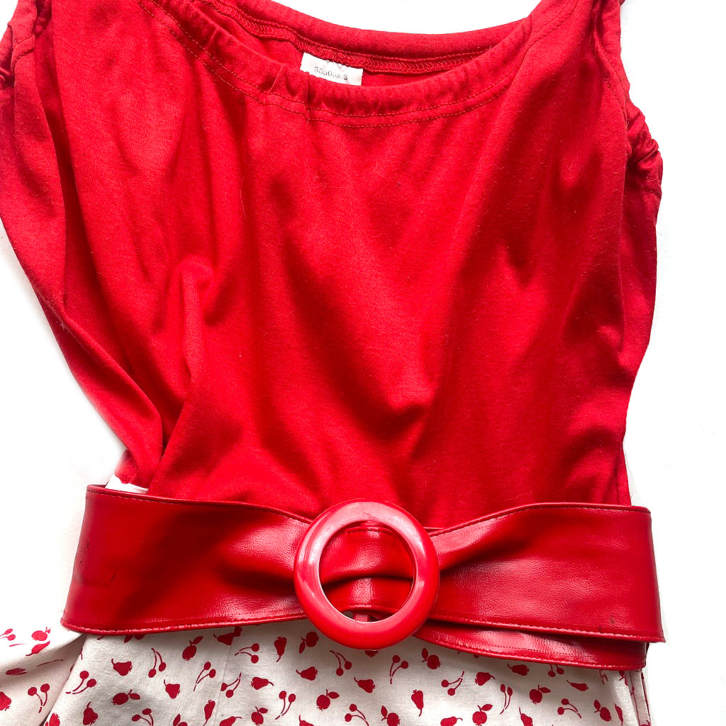 Robe rouge et blanc 70s, buste en fin jersey de coton extensible, doublée, bretelle réglables, ceinture vinyl, taille 36/38 Elephant Paris Vintage