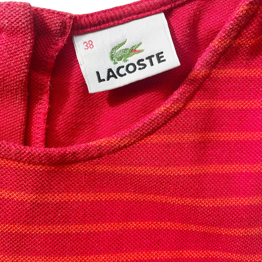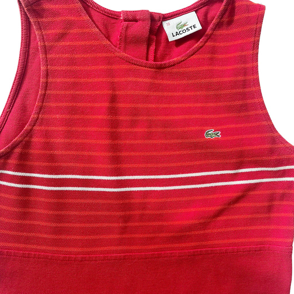 Robe rouge Lacoste coton à grain Elephant Paris Vintage 90s, bon état, manches sport débardeurs, rayures sur le devant haut, taille S/M Mesures à plat : Epaules 29cm, Poitrine 40cm, Longueur dos 90cm, Taille 36/38