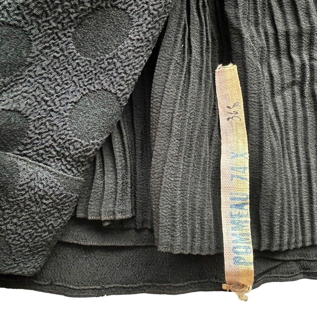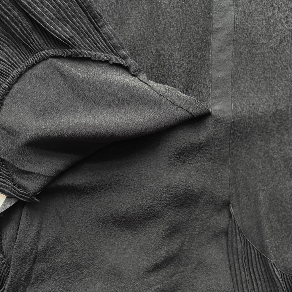 Robe soie noire 1930 Pommeau Elephant Paris Vintage Jolie robe mi-longue en crêpe de soie noir, vintage des années 1 9 3 0, décolleté arrondi, taille marquée, toutes les finitions sont faites à la main, robe d’atelier parisien ou français, très bon état général Robe d’atelier noire en soie des années 1930, griffée Pommeau, à l’élégance fluide et au raffinement discret. Sa coupe taille haute allonge la silhouette, tandis que les manches longues en soie plumetis et le bas plissé évoquent le savoir-faire et l’esthétique de l’entre-deux-guerres. Une pièce rare, intemporelle et précieuse. Mesures prises à plat : Epaules :…