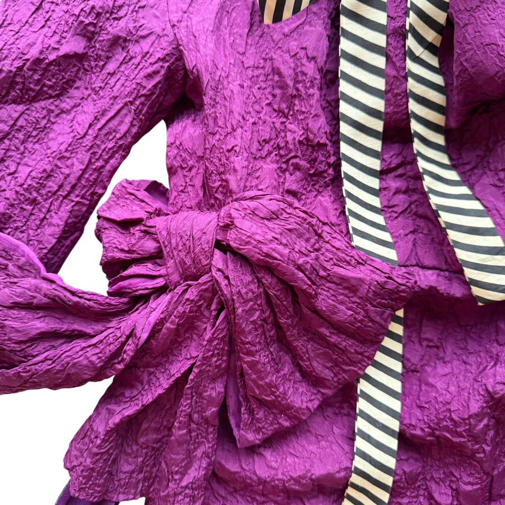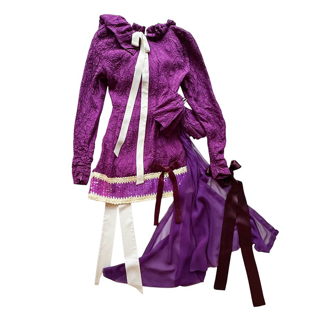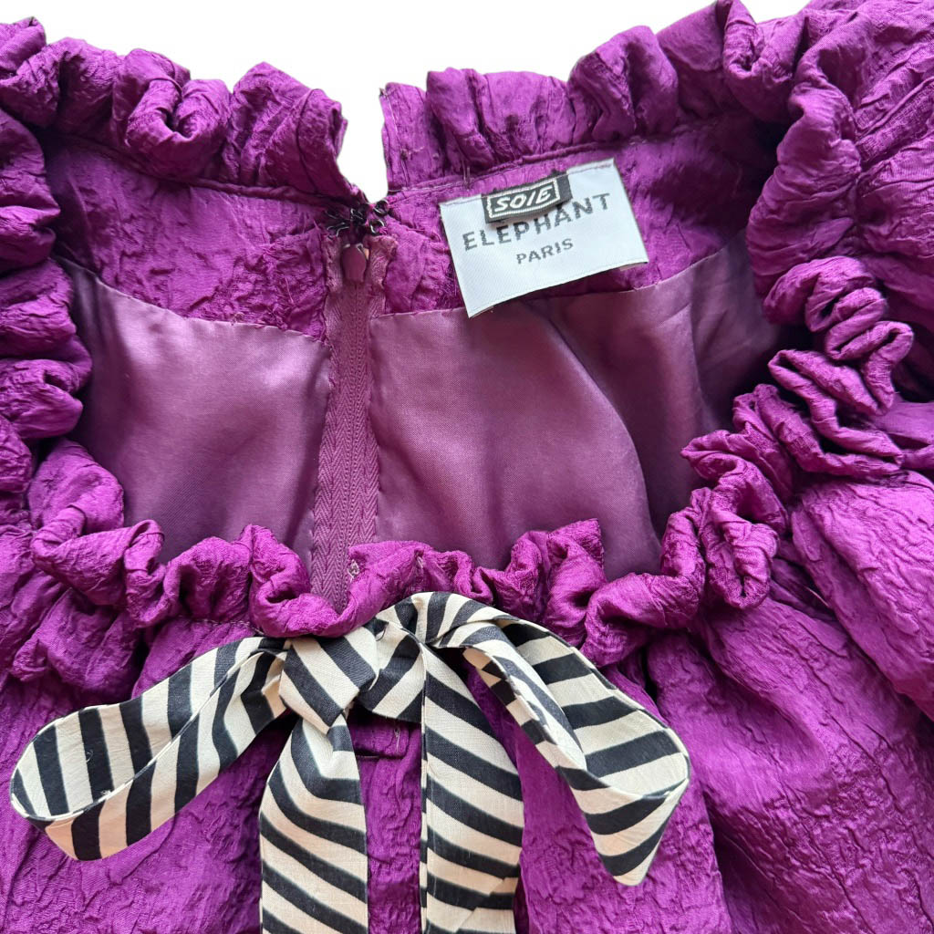 Robe soie Prune Elephant Paris Design Travail d’upcycling réalisé sur une robe en soie gauffrée stretch des années 80, avec des matériaux anciens : sequins stretch, rubans en soie et carrées mousseline de soie Pièce unique Made in France Mesures à plat : Epaules 40 cm, poitrine 55 cm, Taille ceinturée 36 cm, Taille libre 52 cm, Longueur dos 72 cm, Taille S/M