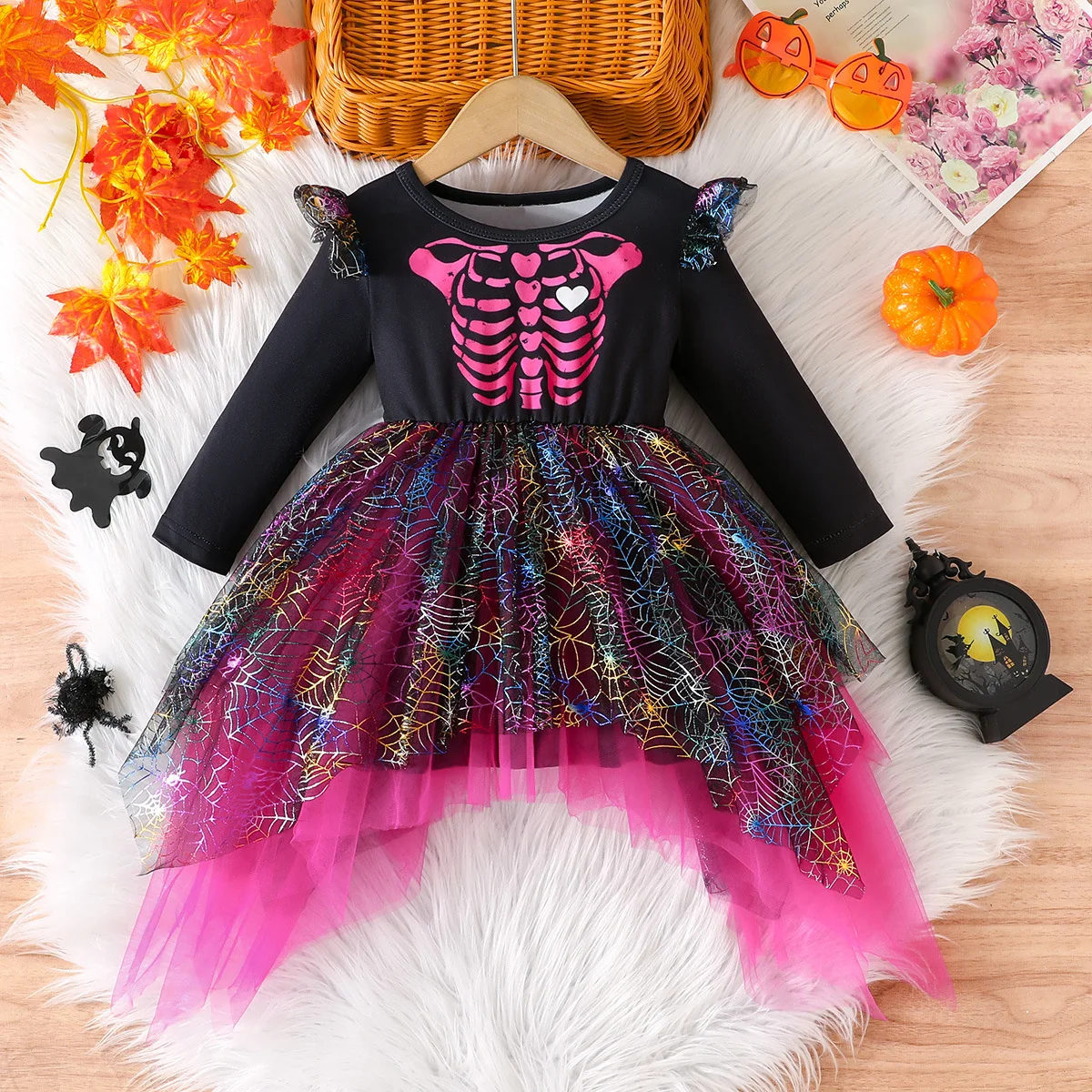 Cette robe spectaculaire réinvente le thème du squelette avec une touche ultra-glamour ! Avec son squelette rose fuchsia orné de cœurs et sa jupe tutu à double couche avec toiles d’araignées dorées scintillantes, cette tenue crée un look Halloween audacieux et inoubliable.