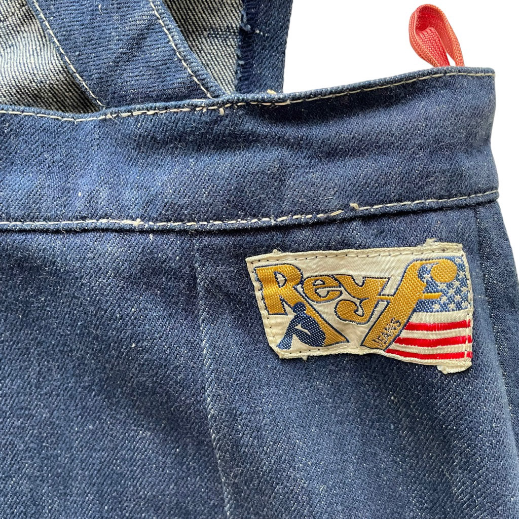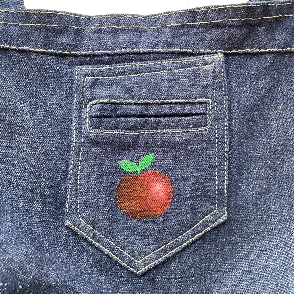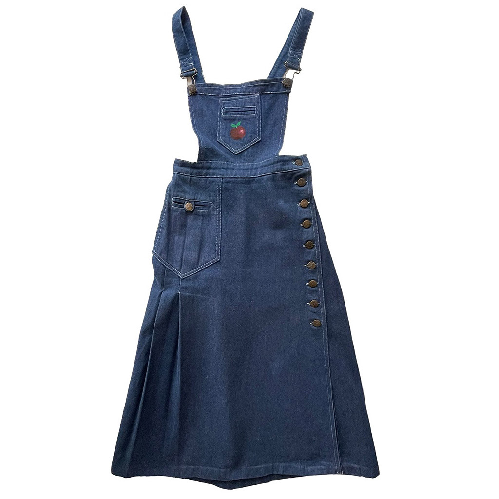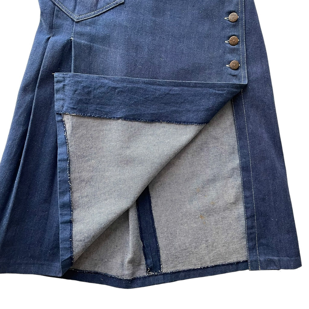 Robe tablier Reyf jeans Elephant Paris Vintage années 70, motifs peint à la main, boutonnée, plissée et fendue sur le côté, taille XS/S Rares traces à l’intérieur, voir dernière photo