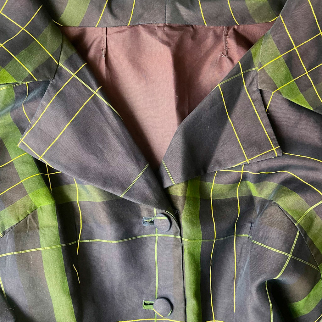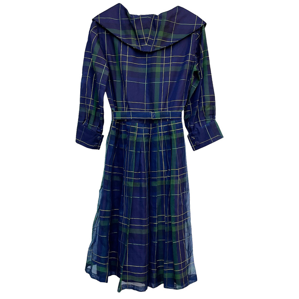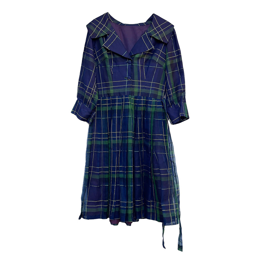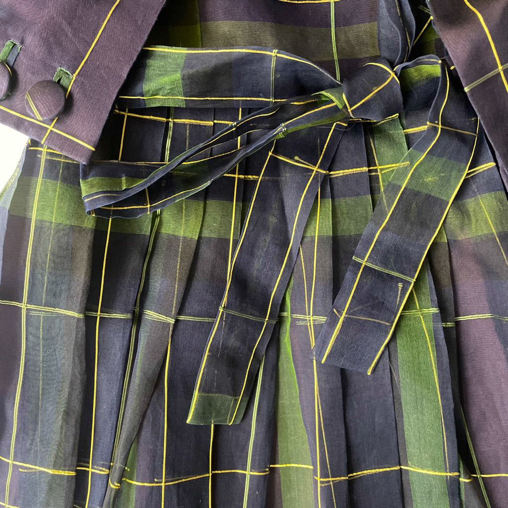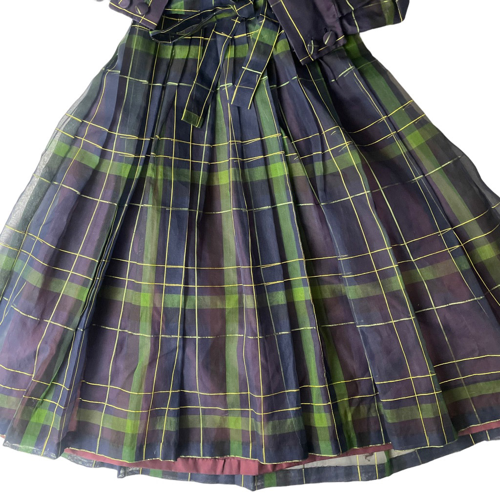 Robe tartan organza soie 50s Elephant Paris vintage années 50, jupe plissée, boutonnée devant, ceinturée, doublée Elephant Paris Vintage Mesures à plat : Epaules 42cm, Poitrine 48cm, Taille 36cm, Longueur dos 107cm, Taille globale 36