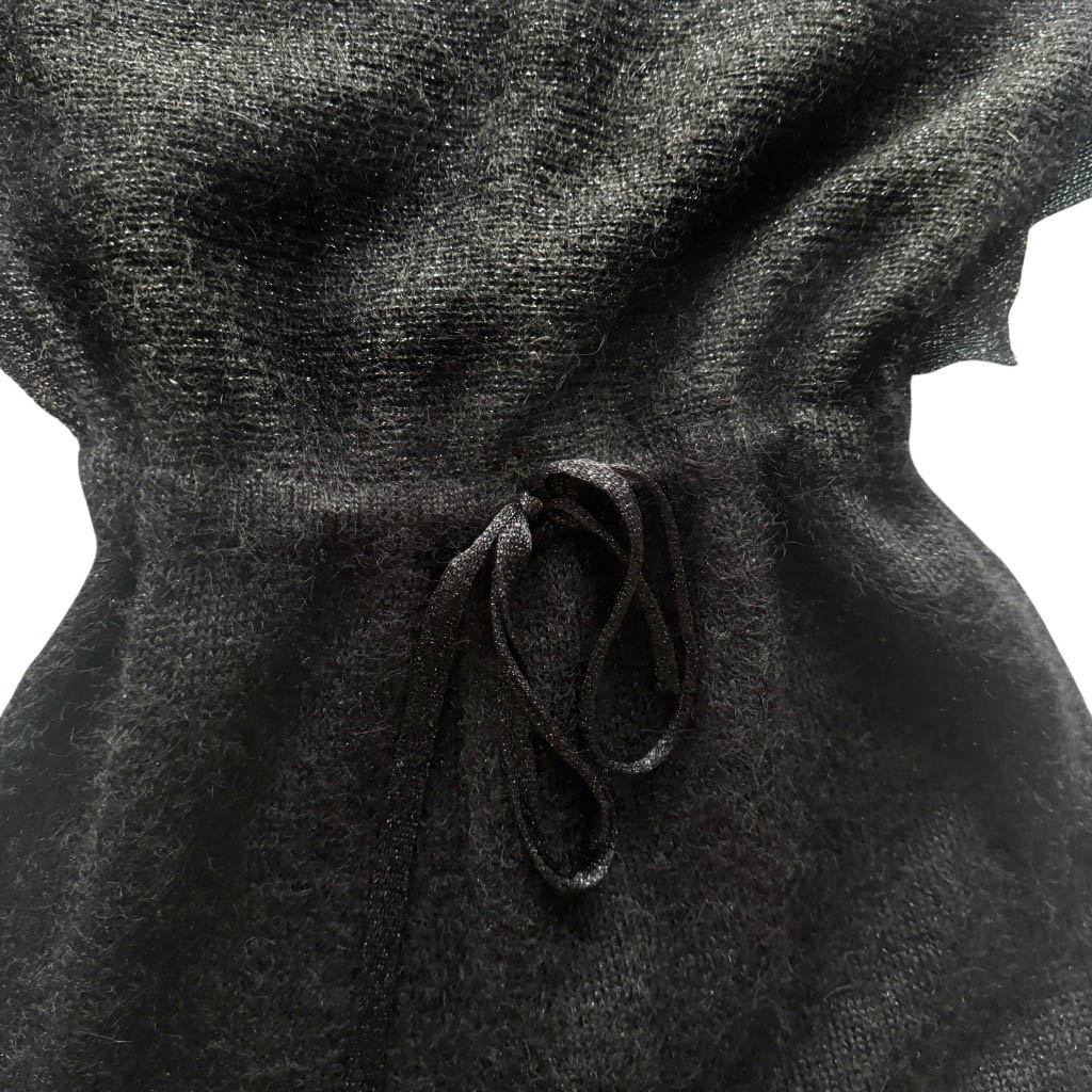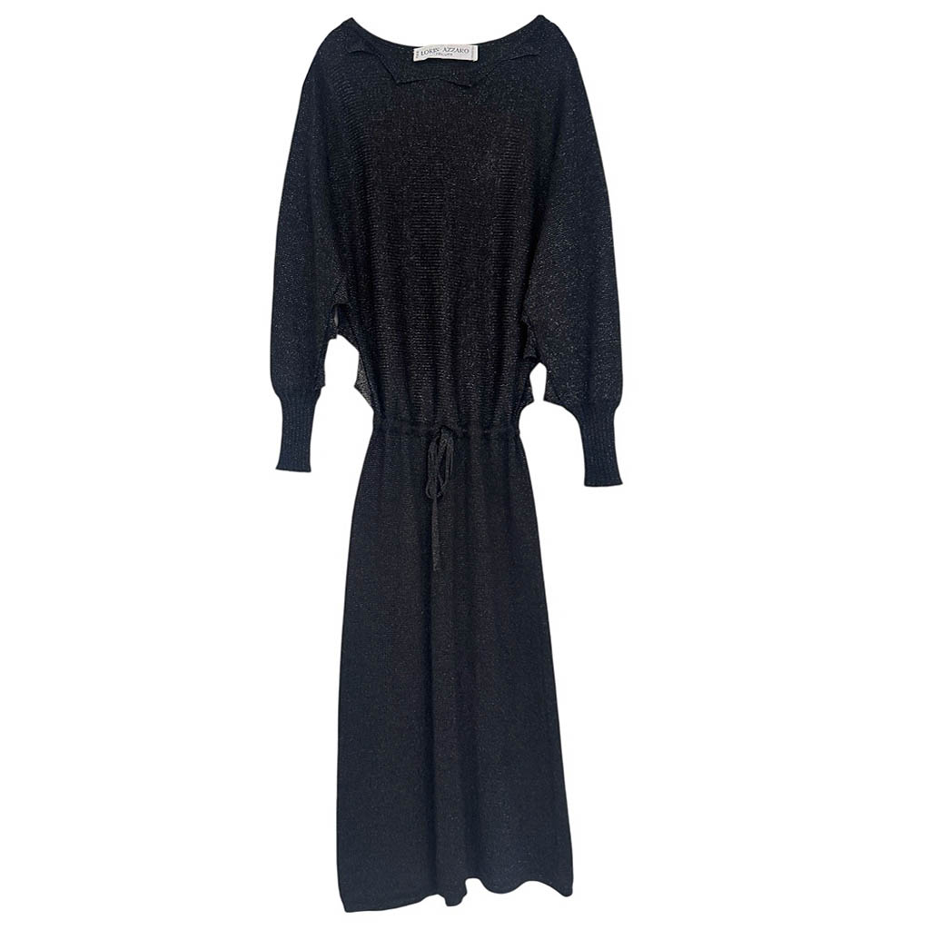 Robe tricot Loris Azzaro Elephant Paris Vintage Robe longue en tricot noir signée Loris Azzaro, à la maille fine et au tombé fluide. Sa coupe souple, resserrée à la taille, épouse le mouvement du corps avec sensualité et élégance. Une pièce à la fois confortable et sophistiquée, emblématique du chic glamour propre à la maison Azzaro. Créateur franco-italien emblématique, Loris Azzaro a marqué la mode dès les années 1960 par son glamour sensuel, ses robes fluides, ses mailles élégantes et son goût pour une féminité libre, solaire et assumée. Mesures prises à plat : Epaules : taille unique, Poitrine :…