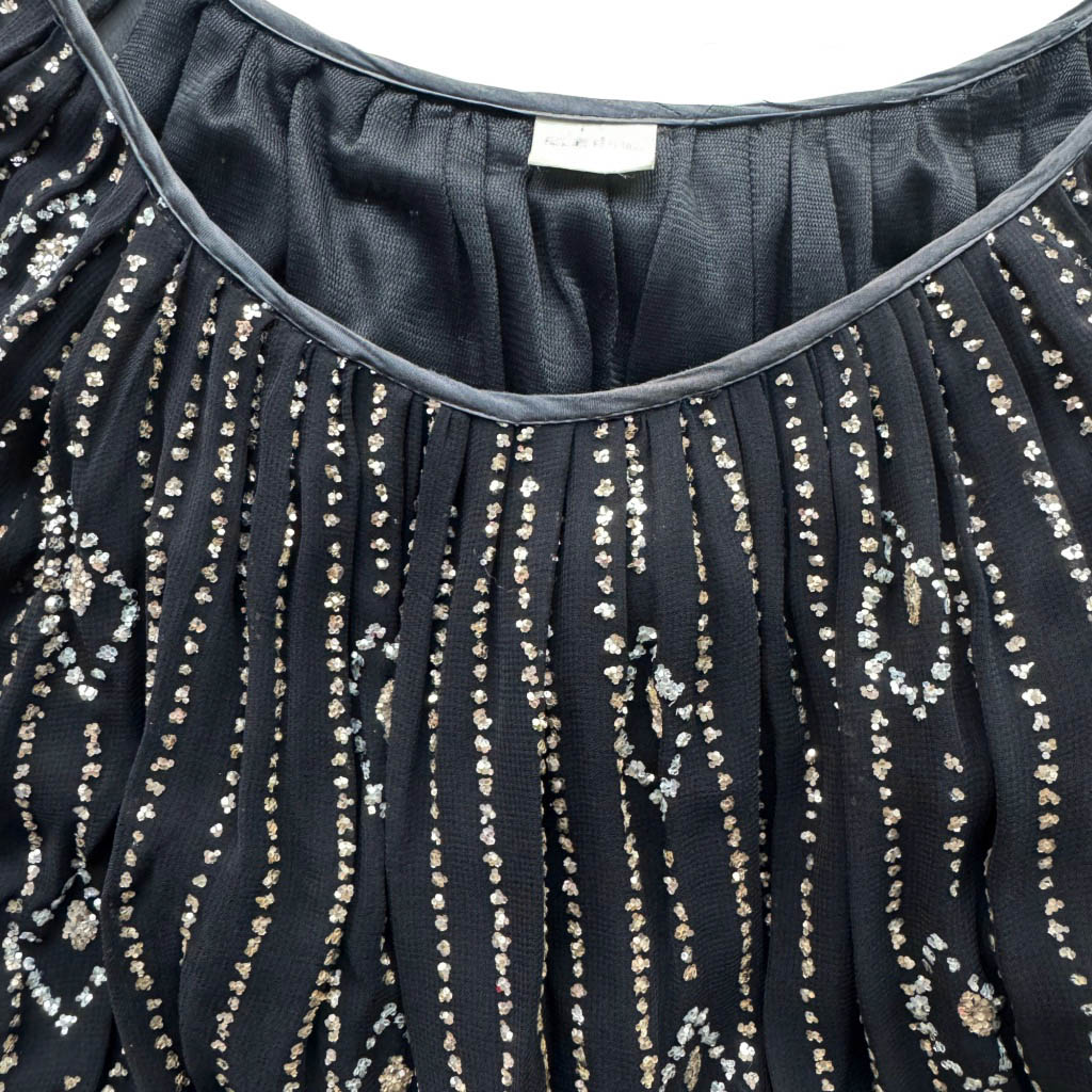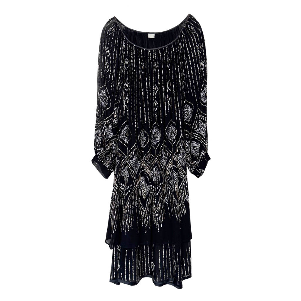 Robe voile noire paillettes Elephant Paris Vintage Sublime robe fluide datant du début des années 1 9 8 0, voile viscose, décolleté très arrondi, manches trois-quart avec poignet, incrustation de sequins au motif art nouveau Mesures prises à plat : Poitrine : 6 0 c m, Longueur dos 9 6 c m, Taille globale : S / M – 36 / 38