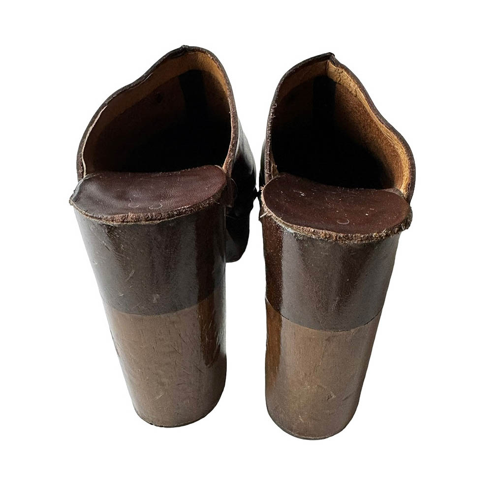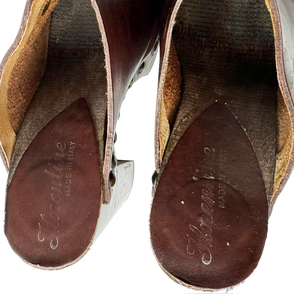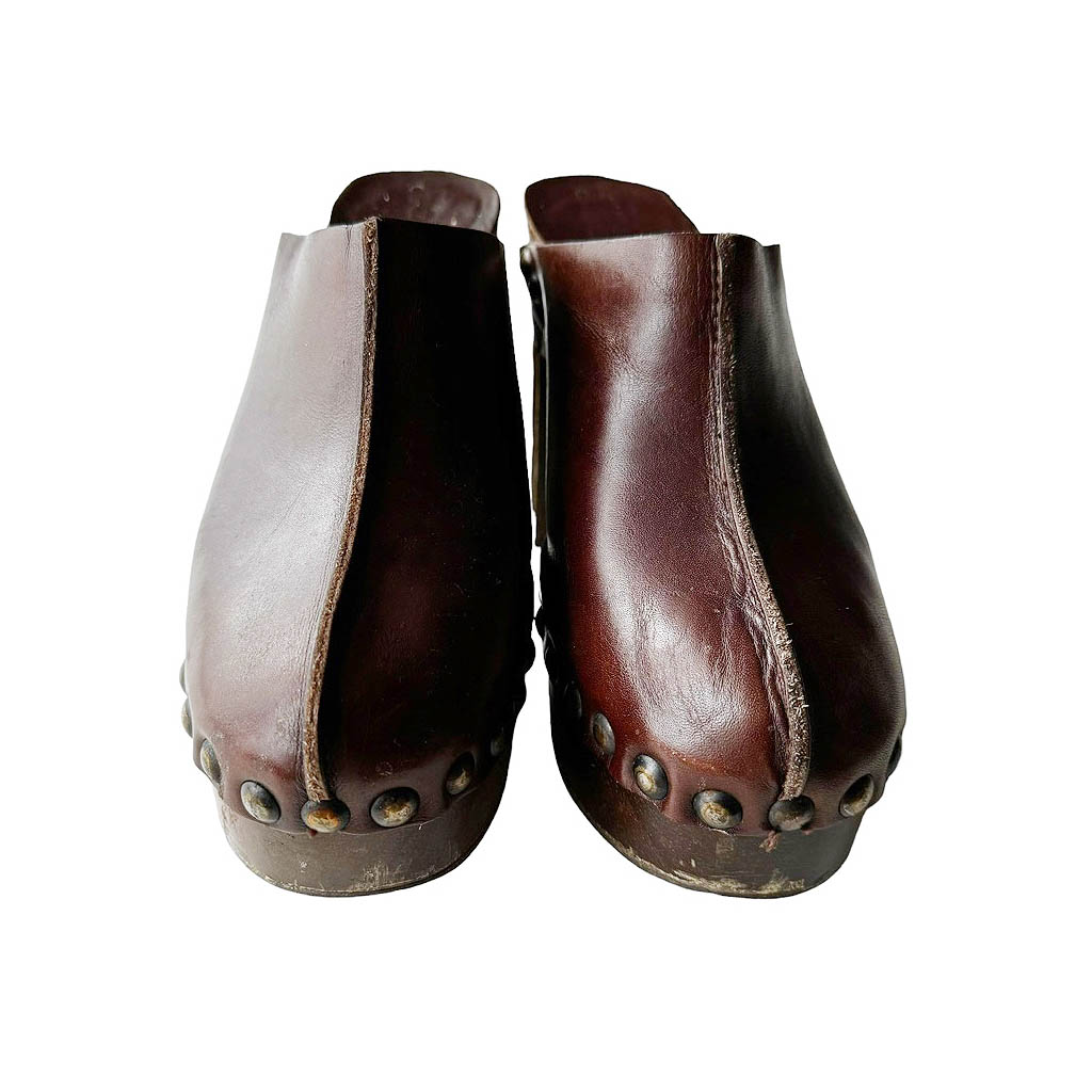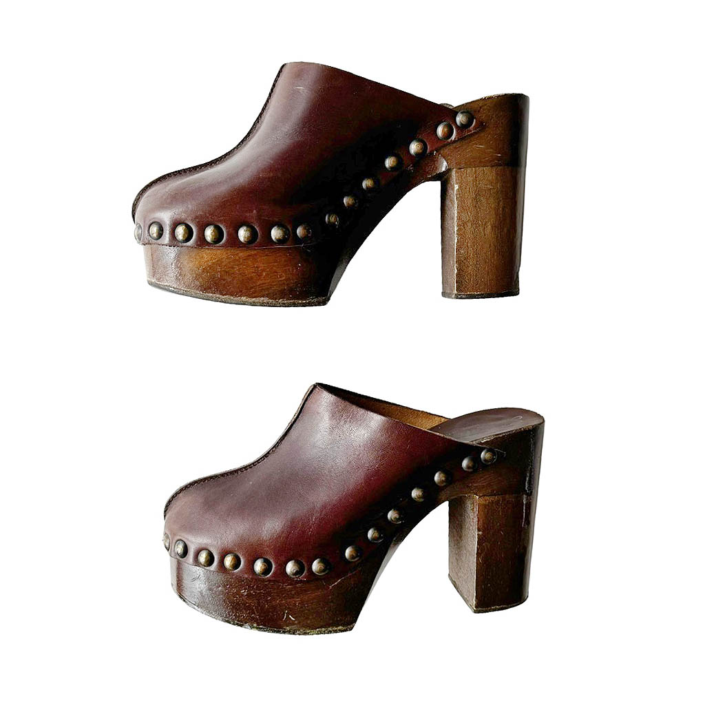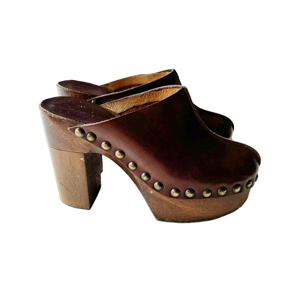 Sabots bois cuir Florentine Elephant Paris vintage Années 70, Semelle bois et dessus cuir clouté, Pointure 8, 38/39, hauteur plateau 3,2cm, hauteur talon 11,5cm