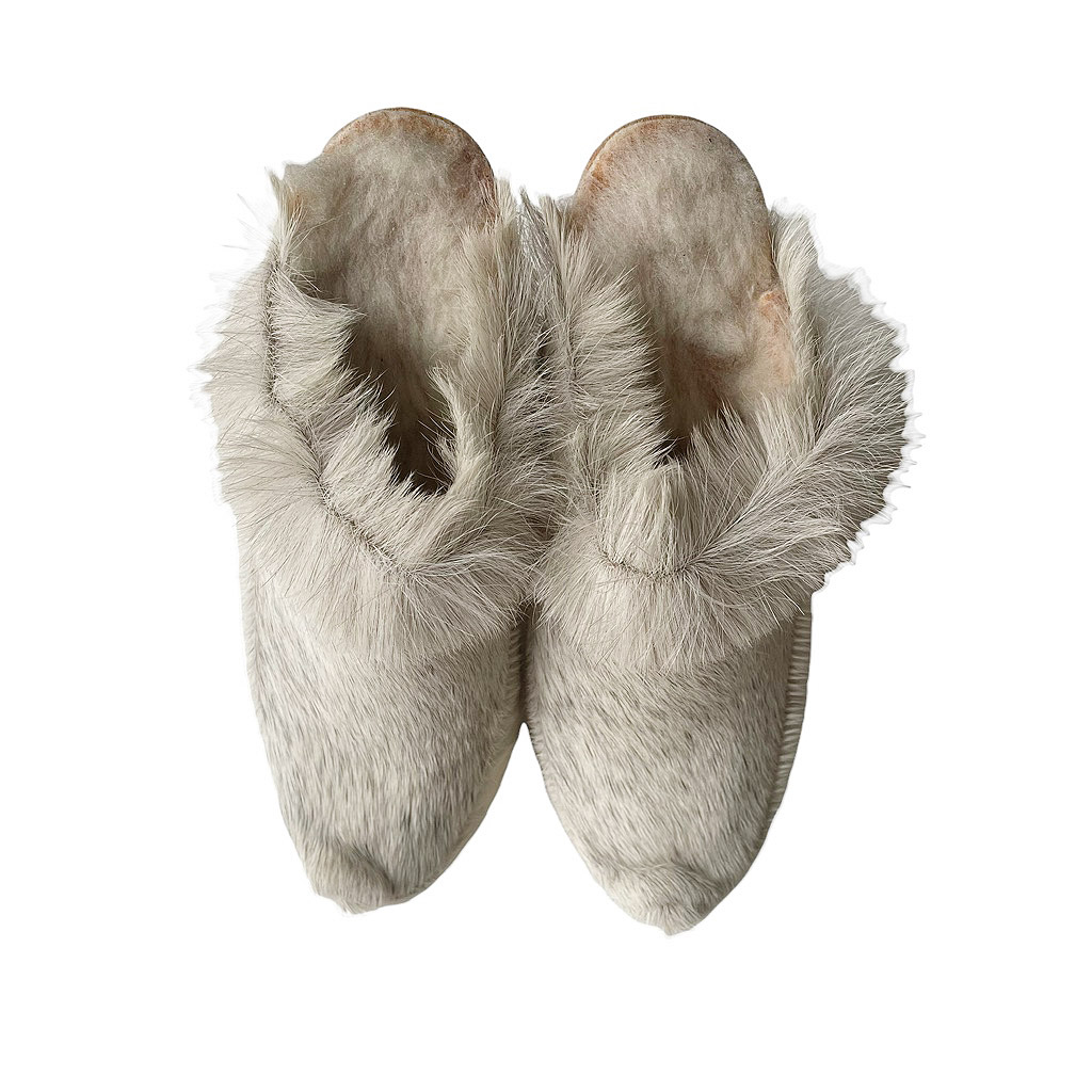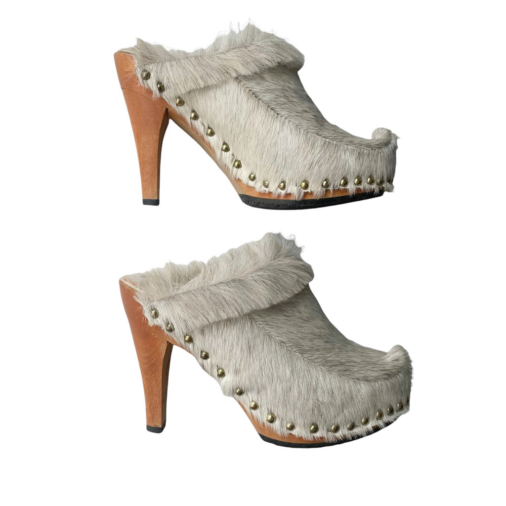 Sabots cloutés en fourrure vintage années 70, neufs d’époque, pointure 36, hauteur talon 10,5cm, semelle en bois, fourrure de chèvre