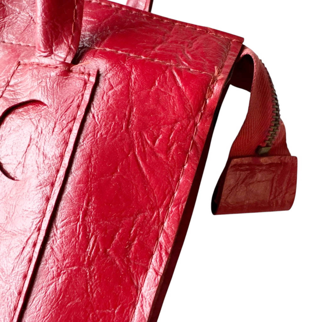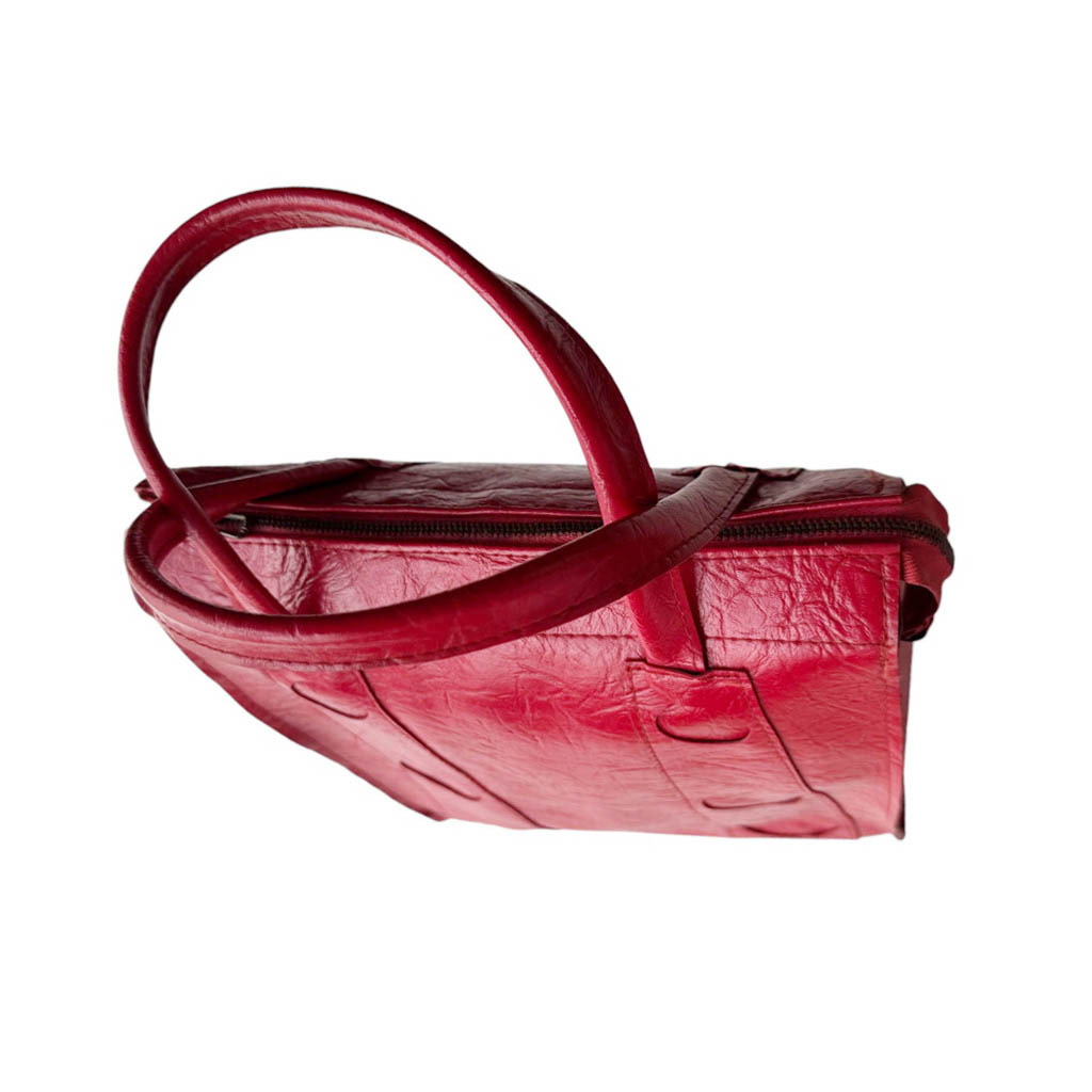 Sac 70s vinyl rouge Elephant Paris Vintage Sac à main cabas en vinyl rouge vif typique des années 70, découpes géométriques dans le vinyl, fermeture à glissière sur le haut du sac, très bon état, Dimensions : 27 cm X 35 cm, profondeur 13 cm