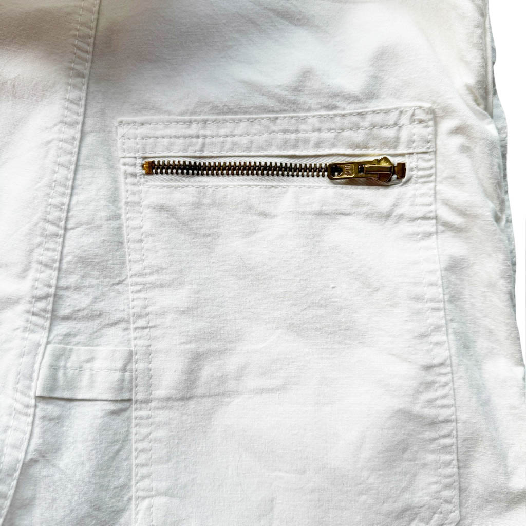 Salopette blanche Adolphe Lafont Elephant Paris Vintage des années 70, coton semi-épais, six poches charpentier plaquées et surpiquées, dont une zippée au dos, et deux poches zippées sur le tablier, zips Eclairs métal dorés, Bretelles en partie élastiques amovibles par boutonnage dos, Mesures prises à plat : Taille 34 cm, Hanches 50 cm, Longueur devant 60 cm, Longueur jambe depuis la fourche 31 cm, Taille 36 / S légère marque de pliage sur la cuisse avant droite, voir photo