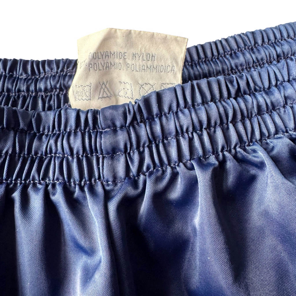 Short satin marine arena Elephant Paris Vintage des années 70, satin de polyamide et nylon, taille élastique, légèrement fendu de chaque côté Mesures prises à plat : Taille élastique 29/50cm, Longueur devant 28cm, Longueur dos 33cm, Taille S/M / 36/38, neuf d’époque