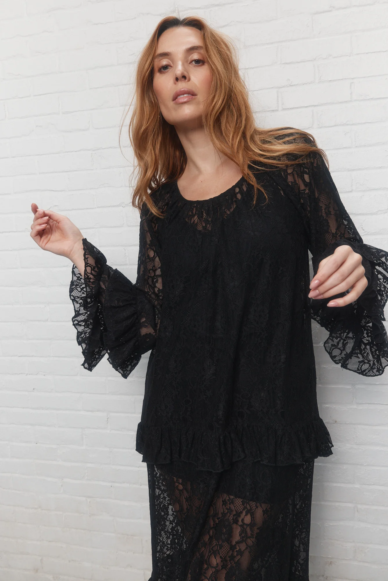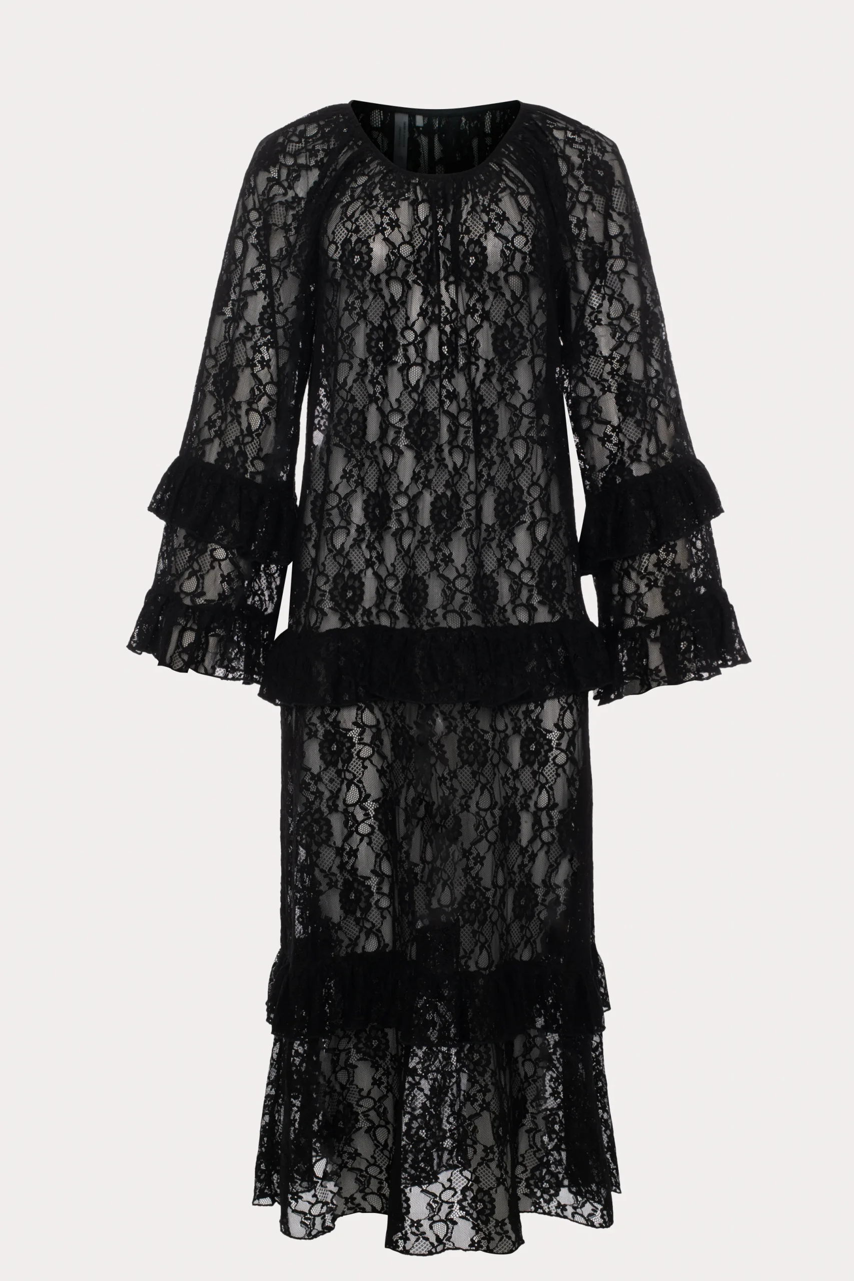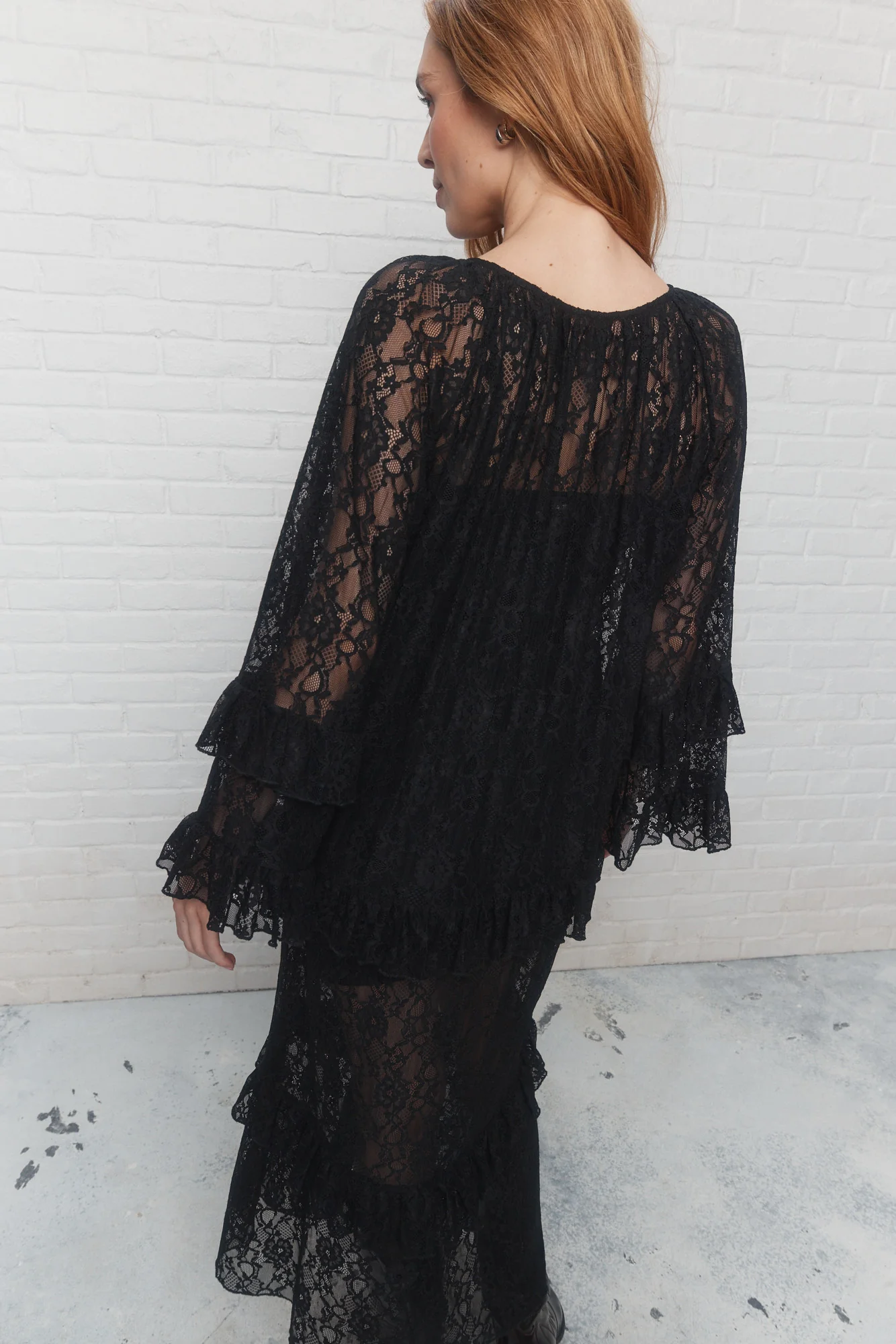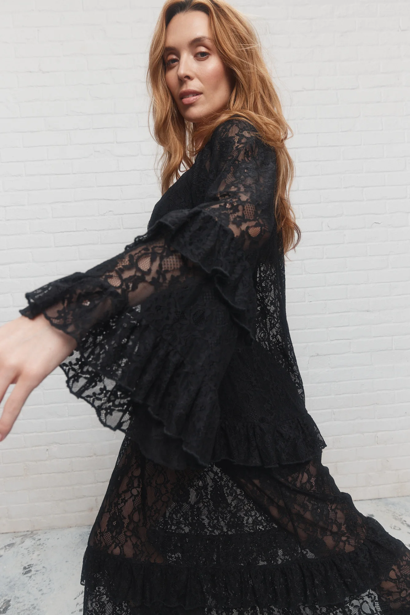 Romantique et boho-chic, voici la robe noire en dentelle Skyler. Unique, elle fera tourner les têtes grâce à sa transparence, ses volants et ses manches évasées.