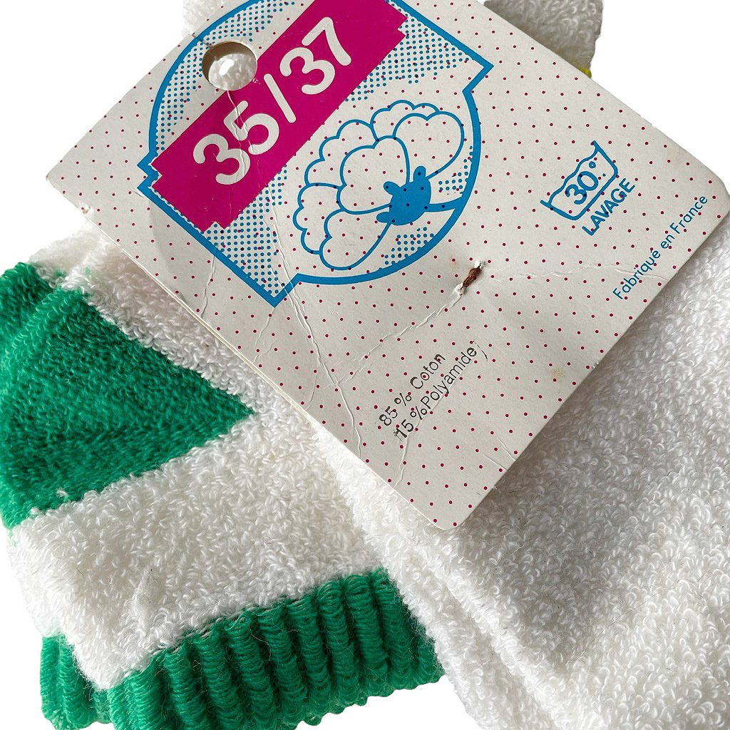 Socquettes Olympia 80s en éponge blanche, verte et jaune, neuves d’époque, Elephant Paris Vintage du 35 au 37.