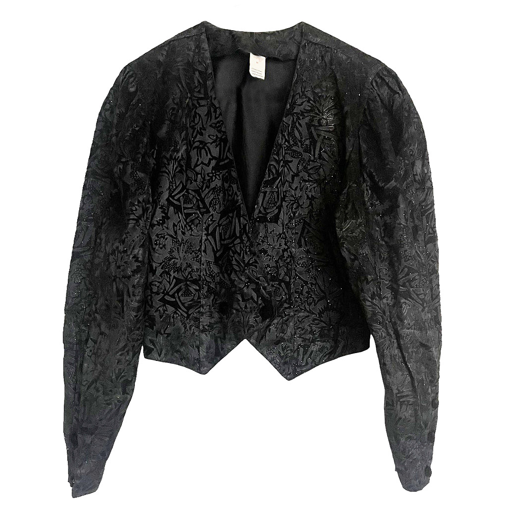 Spencer taffetas damassé Orsay noir vintage Elephant Paris Vintage années 80 Mesures à plat : Epaules 40cm, Poitrine 49cm, Longueur dos 46cm, Taille globale 40