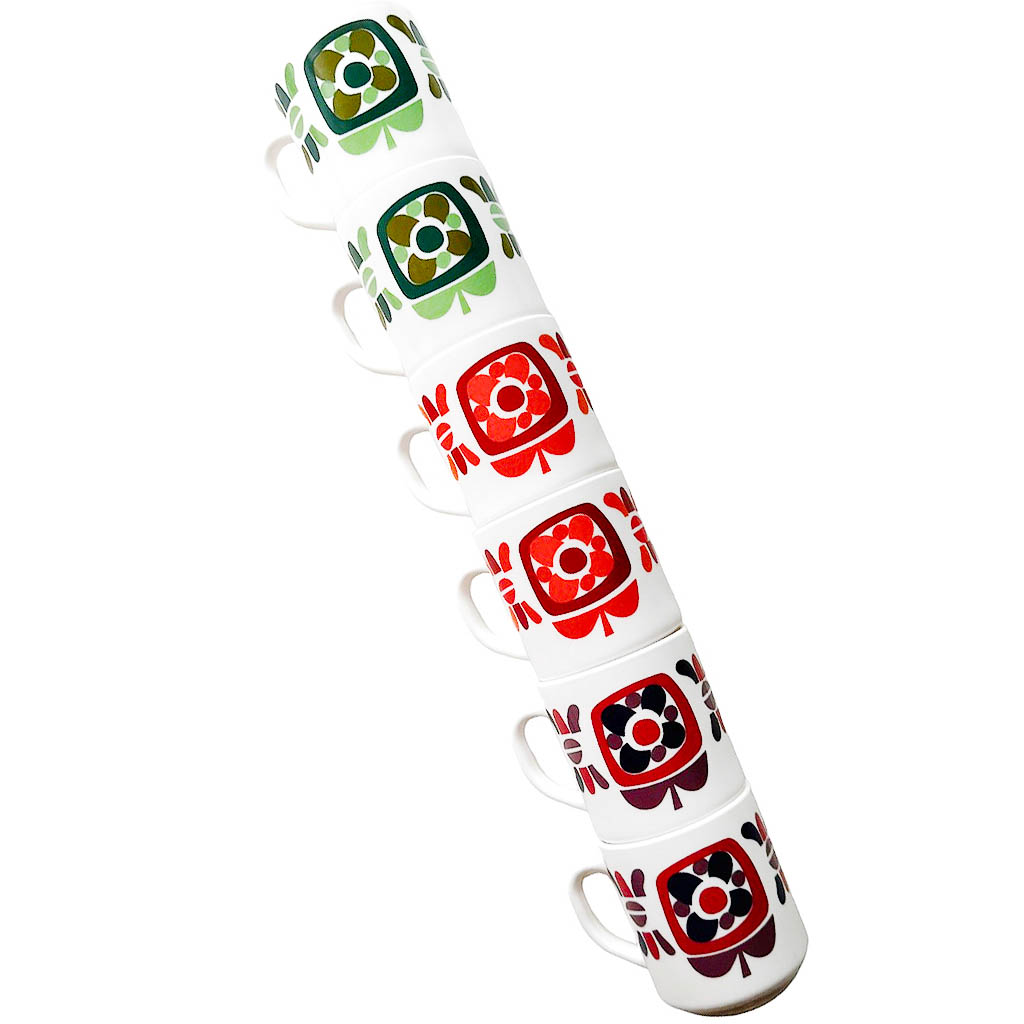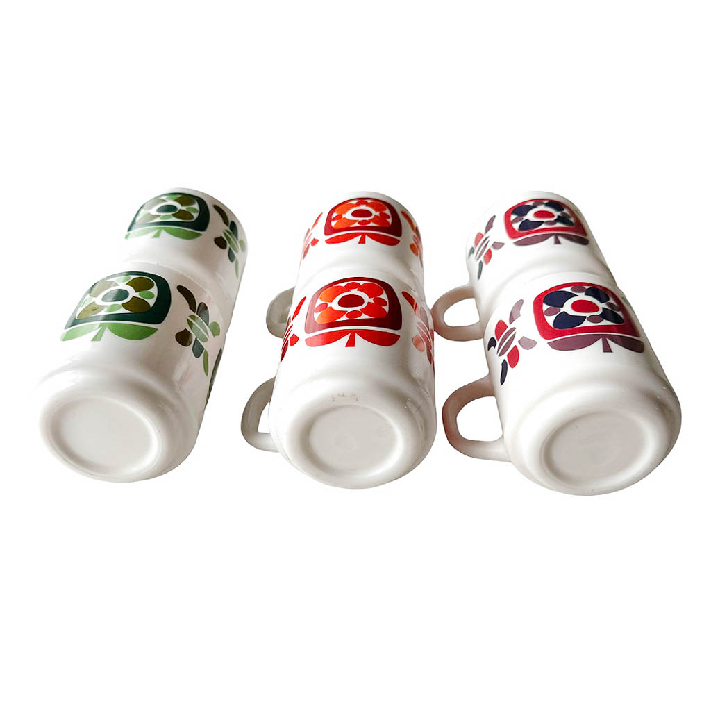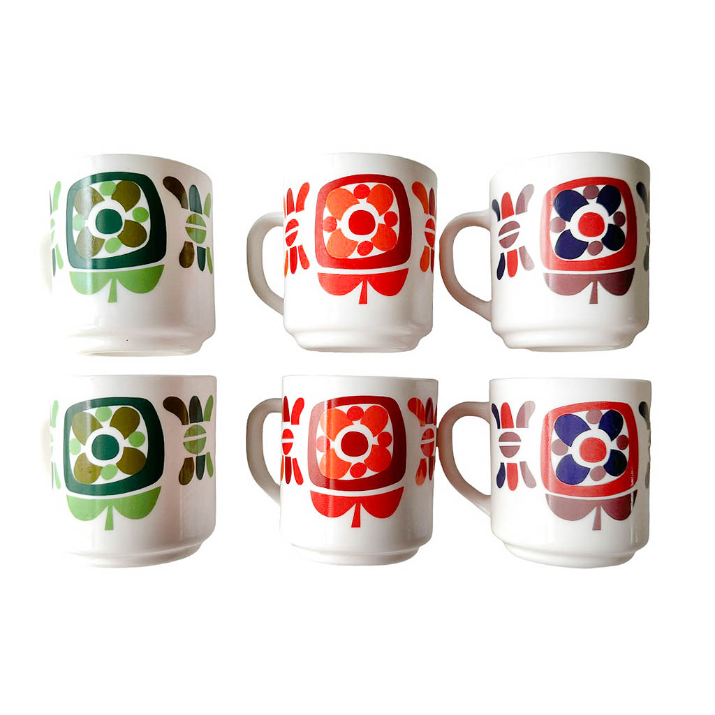 Tasses Mobil 70s Arcoroc Elephant Paris vintage Modèle créé par le designer Jean-Charles Meunier en 1972. Dimensions : hauteur 9 cm, diamètre au buvant 7,5 cm, largeur jusqu’à l’anse 11 cm.