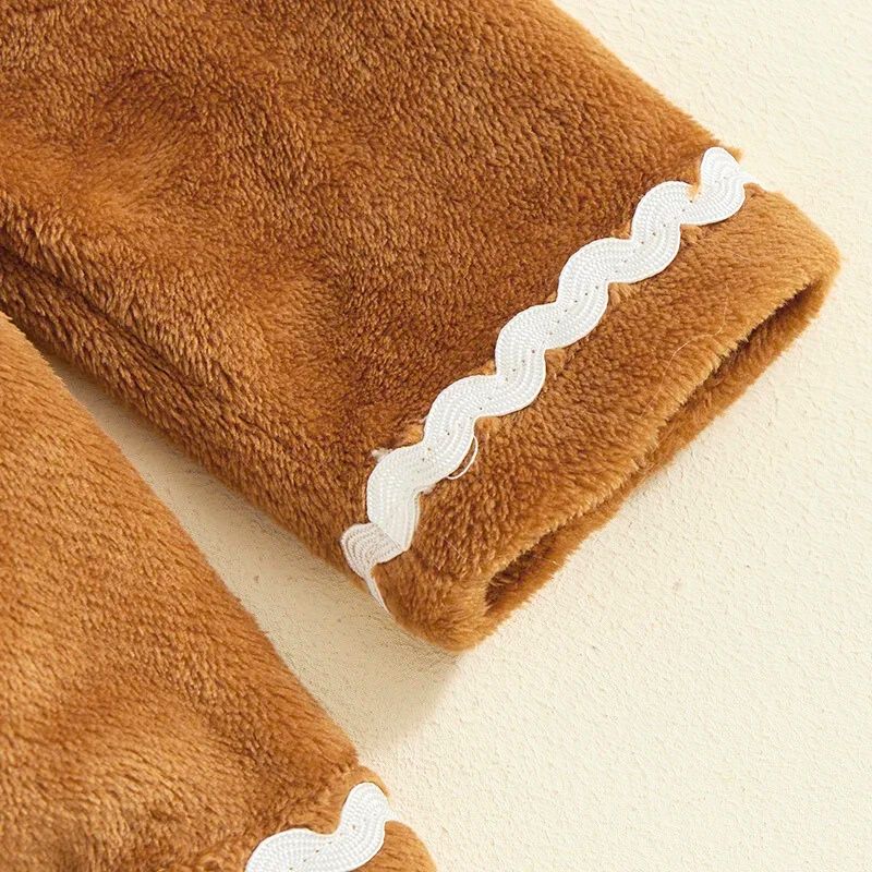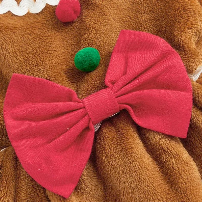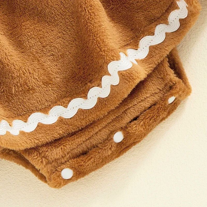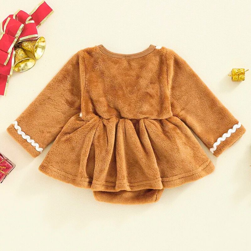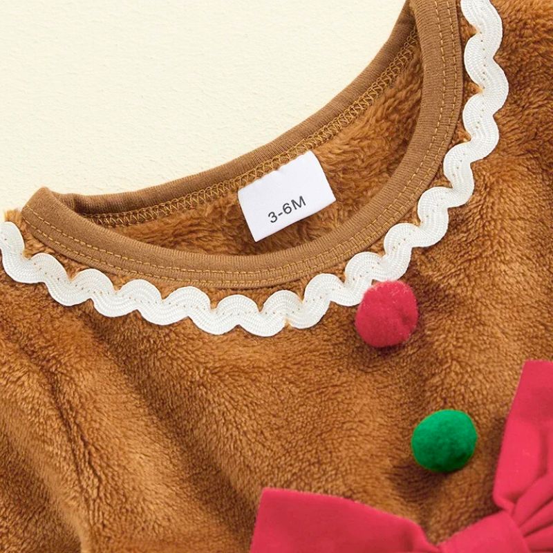 Cette tenue de Noël pour bébé fille est idéale pour apporter une touche de magie et de douceur aux fêtes de fin d’année. Inspirée du célèbre bonhomme pain d’épice, cette robe moumoutée en marron est ornée de petits détails festifs, comme un nœud rouge vif et des bordures blanches en zigzag. Conçue pour être confortable, cette tenue est dotée de manches longues pour tenir votre bébé bien au chaud tout en restant adorable.