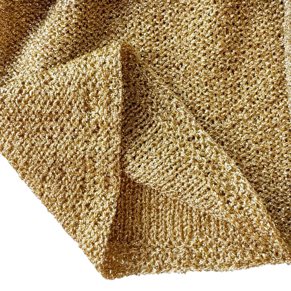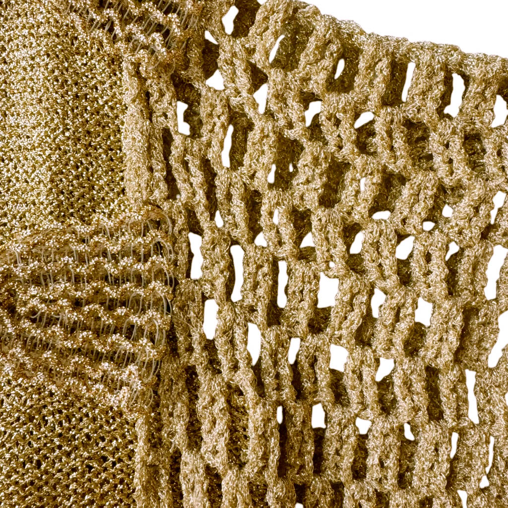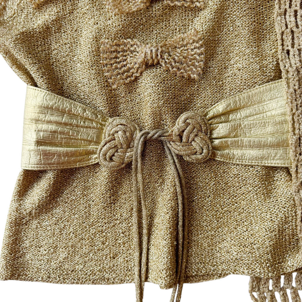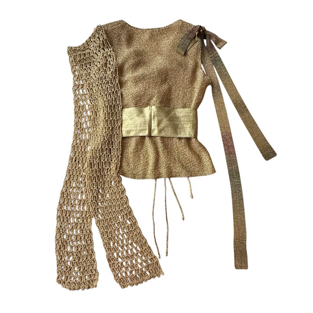 Top lurex gold et cuir Elephant Paris Design Design réalisé avec des matériaux anciens, maille lurex tricotée point jersey, et empiècement manche crocheté maille lurex, ceinture cousue en cuir années 80 Pièce unique Made in France Taille S / M, 38 /38 /40