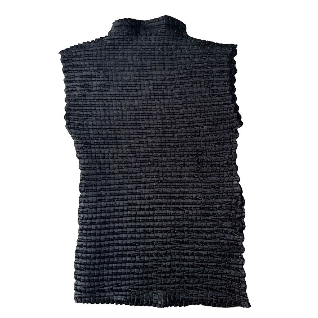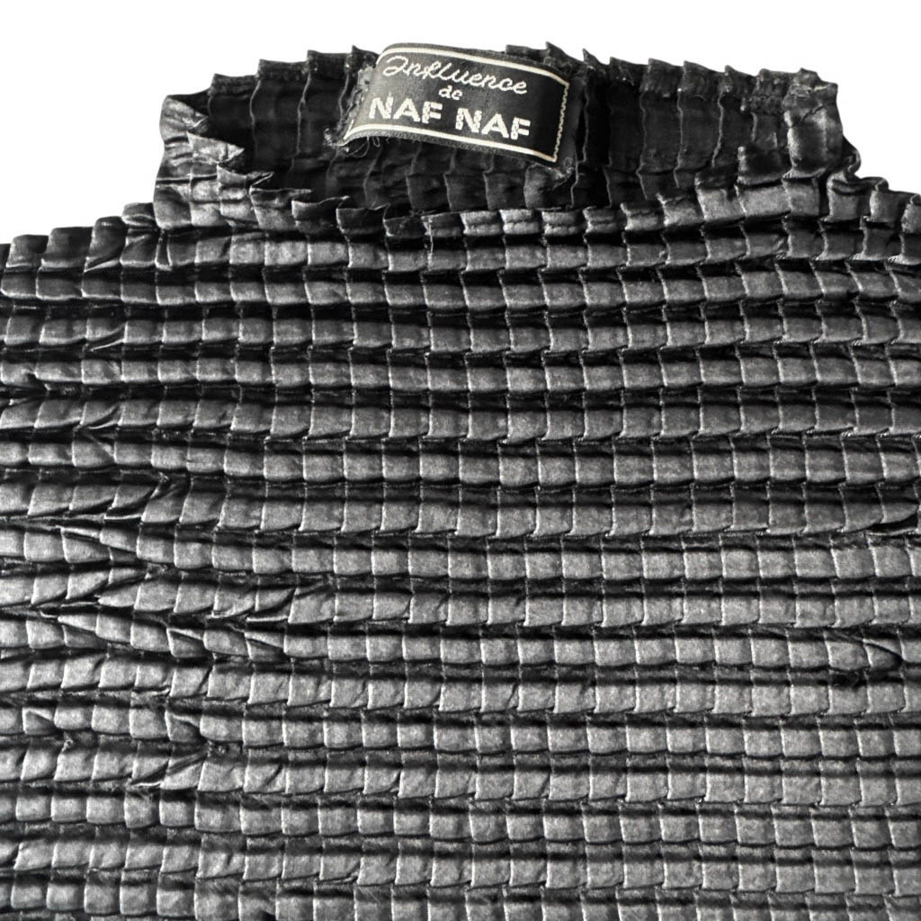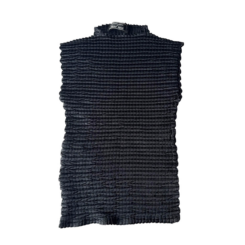 Top satin noir gauffré Naf Naf Elephant Paris vintage Datant de la fin des années 1 9 9 0, début des années 2 0 0 0. top sans manches, col cheminée, en satin gaufré, matière très agréable et très souple, extensible, de la marque Influence de Naf Naf Mesures prises à plat : Epaules 3 4 / 5 4 c m, Poitrine : 3 0 / 6 0 c m, Taille : 3 0 / 6 0 c m, Longueur dos avec le col : 5 1 / 6 1 c m, Taille globale : S / M