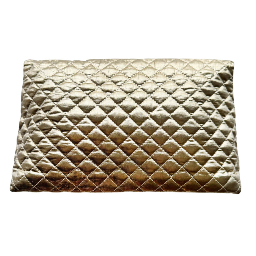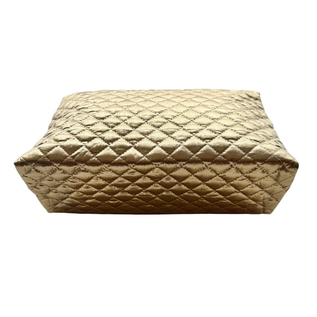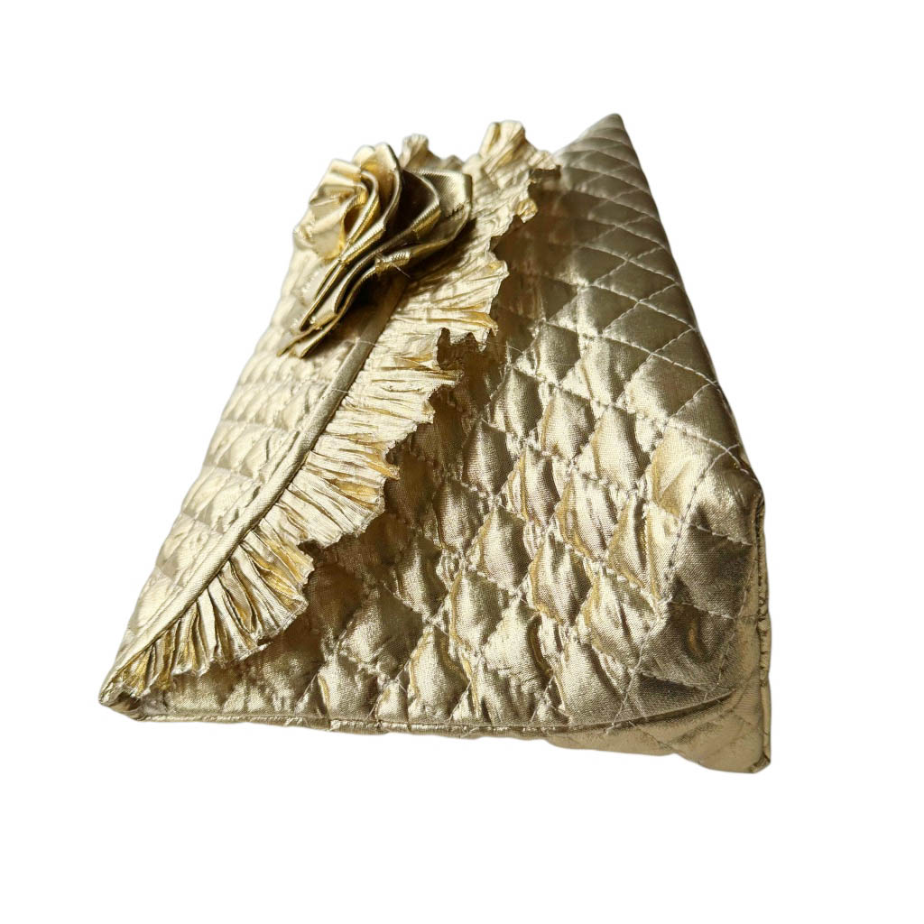Trousse de toilette lamé m c fremau Elephant Paris Vintage Trousse de toilette en lamé doré matelassé de la marque m.c fremau, avec une rose d’or, vinyl à l’intérieur, Vintage des années 80, dimensions : 28cm X 17cm, Profondeur 10cm, fermeture crochet en métal doré