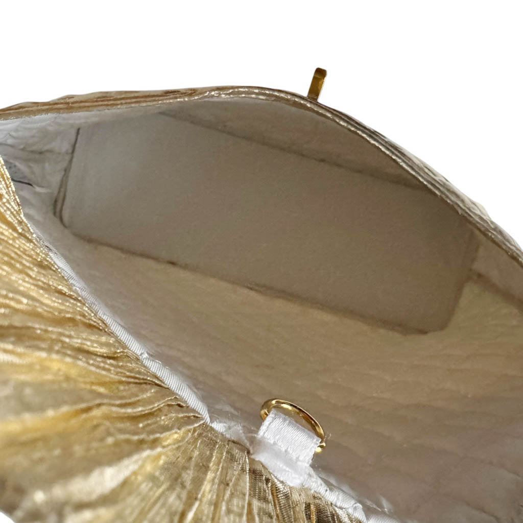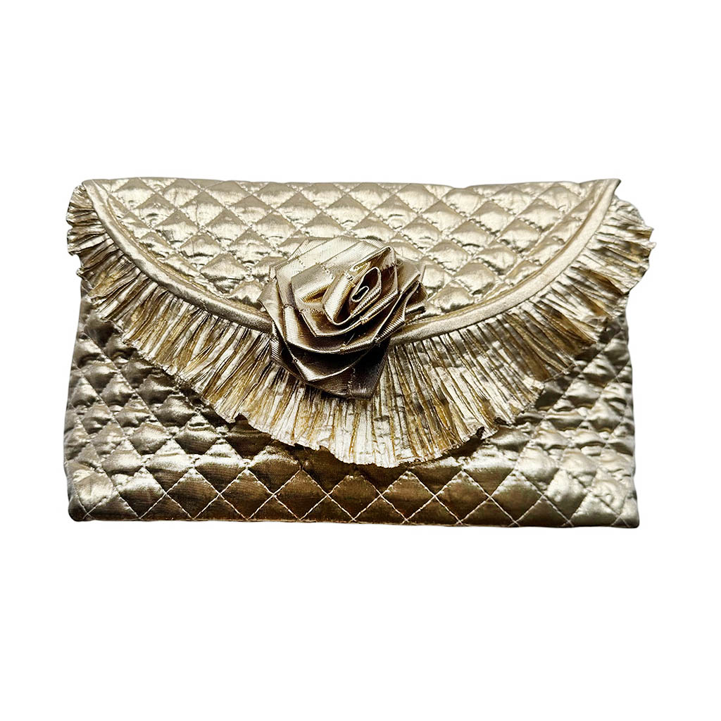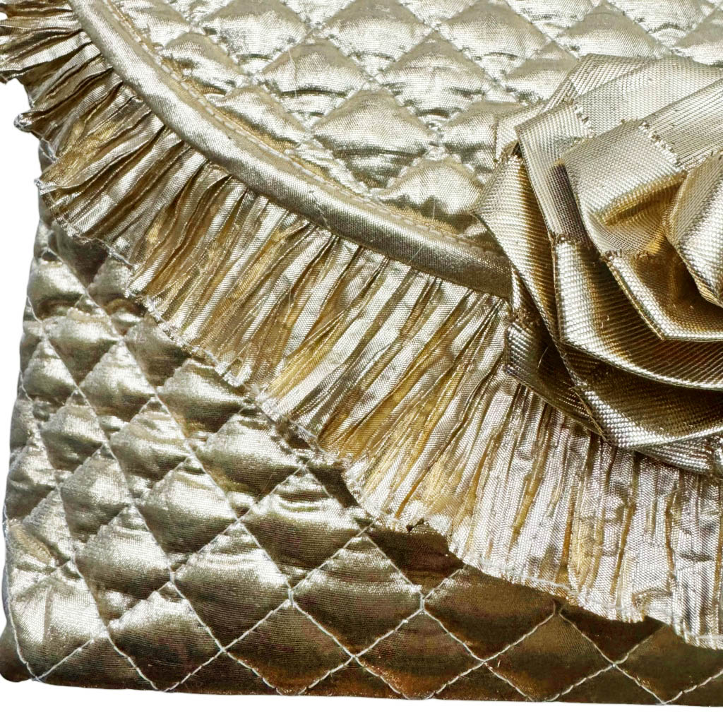 Trousse de toilette lamé m c fremau Elephant Paris Vintage Trousse de toilette en lamé doré matelassé de la marque m.c fremau, avec une rose d’or, vinyl à l’intérieur, Vintage des années 80, dimensions : 28cm X 17cm, Profondeur 10cm, fermeture crochet en métal doré