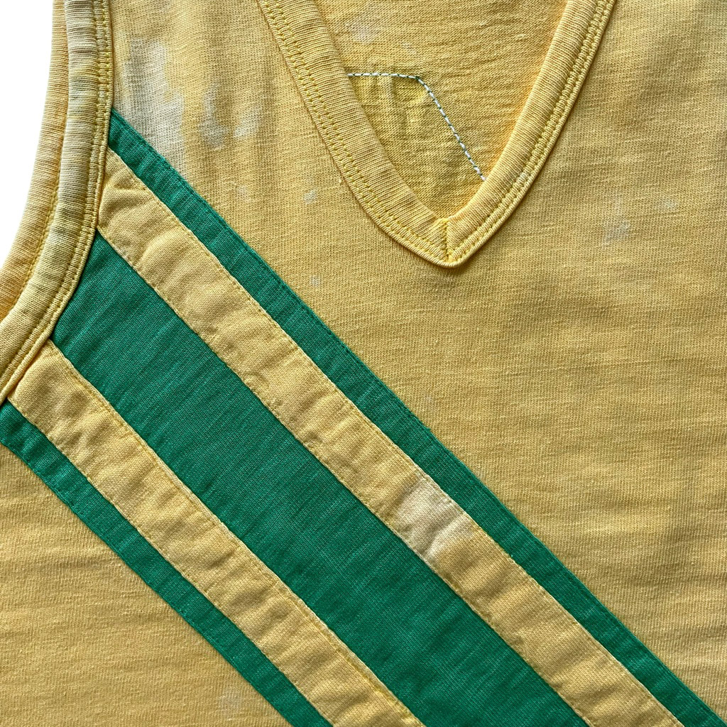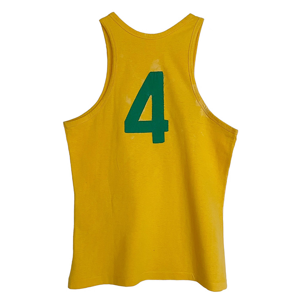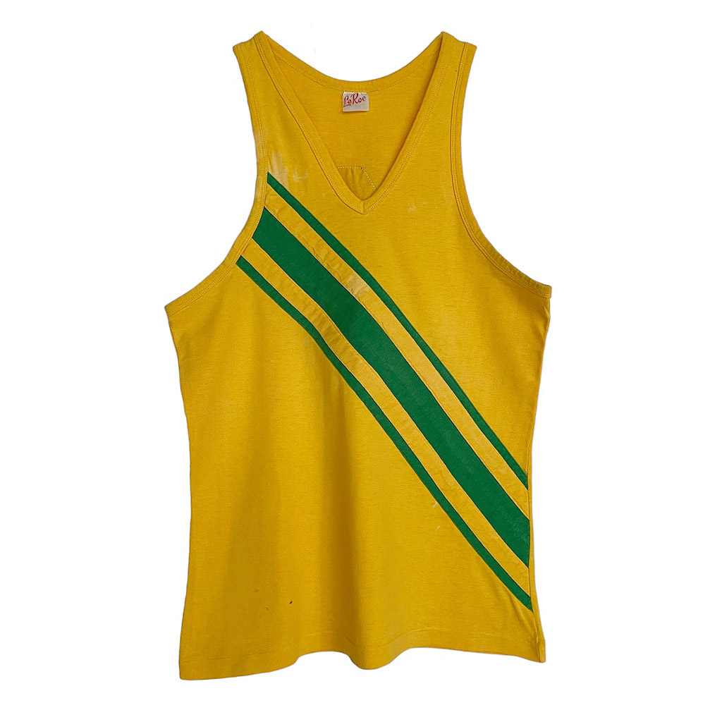 Tshirt débardeur Le Roc coton jaune et rayures vertes numéroté 4 dans le dos vintage 50s Elephant Paris, encolure en V, quelques marques de décoloration (voir photos), Taille M Mesures à plat : Epaules 25cm, Poitrine 50cm, Longueur dos 63cm, Taille 38/40