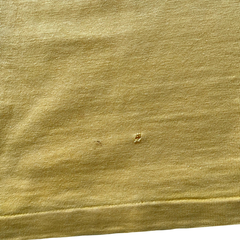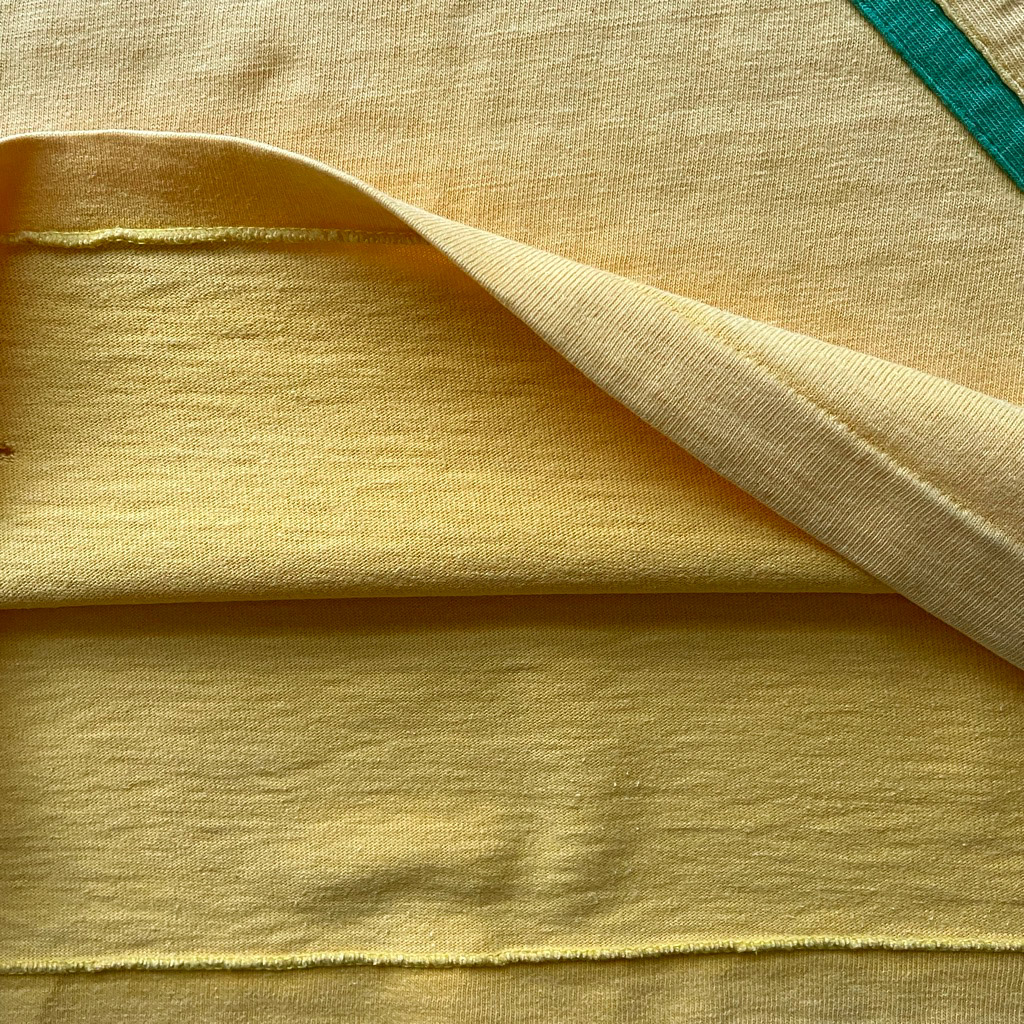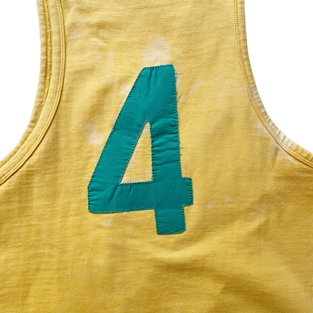 Tshirt débardeur Le Roc coton jaune et rayures vertes numéroté 4 dans le dos vintage 50s Elephant Paris, encolure en V, quelques marques de décoloration (voir photos), Taille M Mesures à plat : Epaules 25cm, Poitrine 50cm, Longueur dos 63cm, Taille 38/40