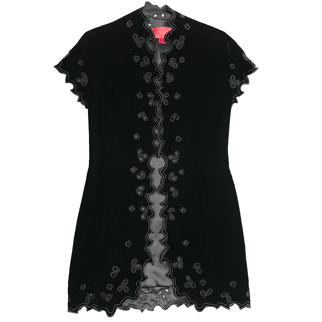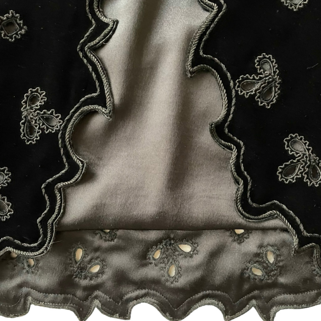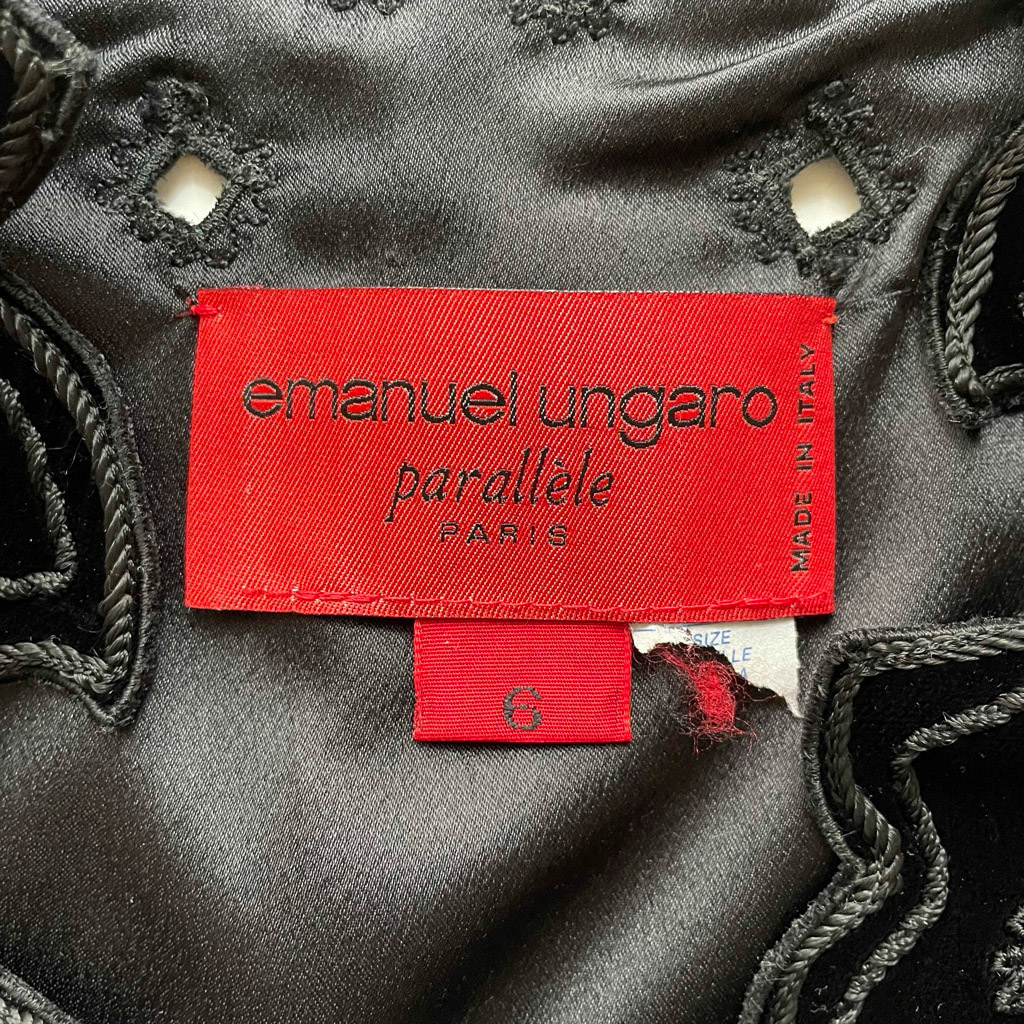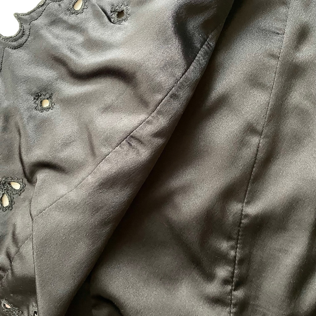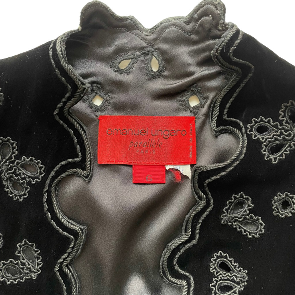 Ungaro robe gilet velours soie ajourée Elephant Paris Vintage doublée en satin de soie, possibilité d’ajouter un lacet, Taille S/M Mesures à plat : Epaules 33cm, Poitrine 47cm, Longueur dos 84cm, Taille 36/38