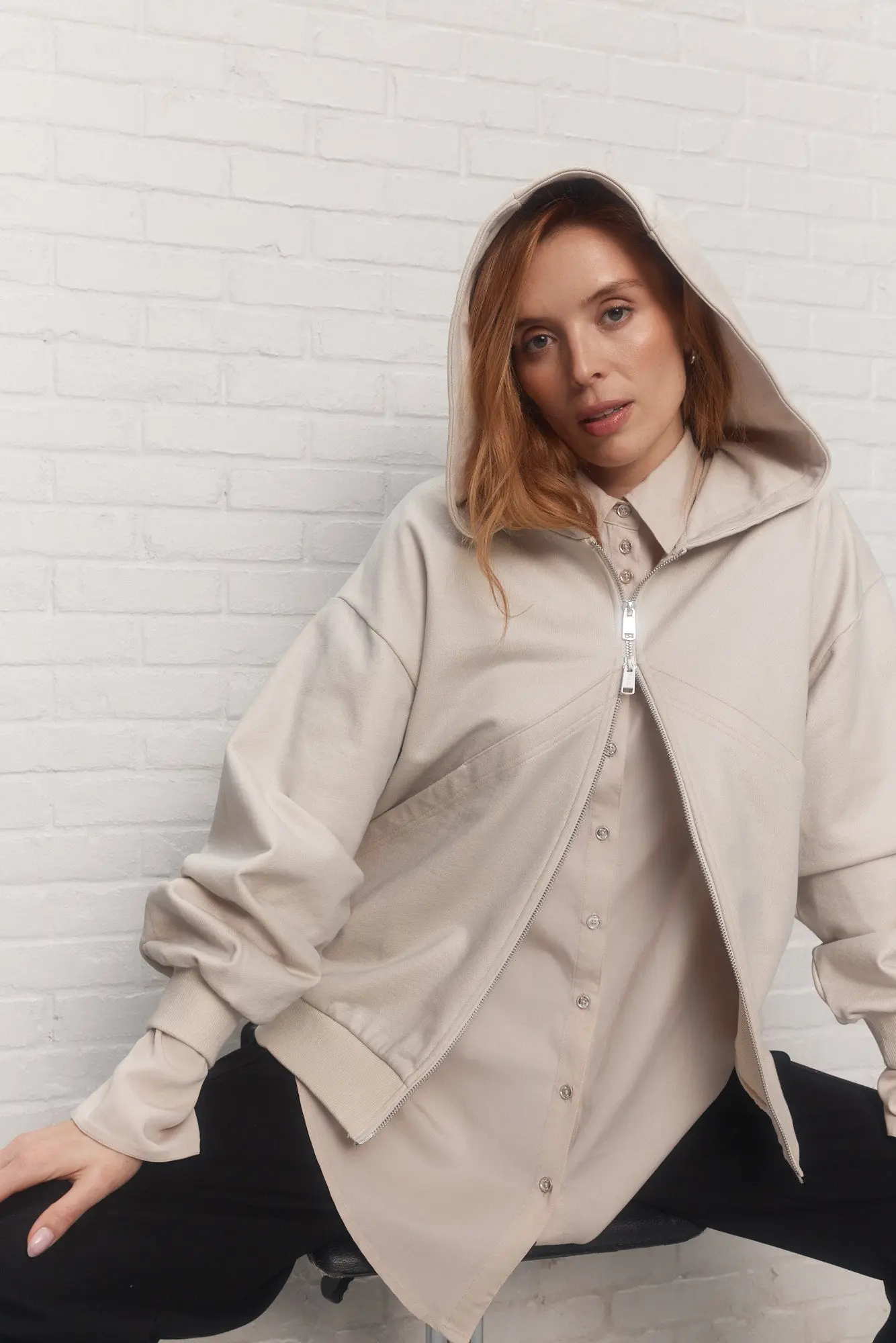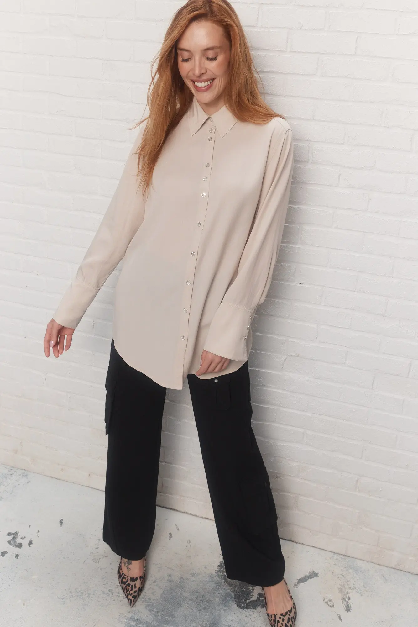 – Portez la chemise beige ample boutonnée, déboutonnée sur une base essentielle ou sous un chandail.