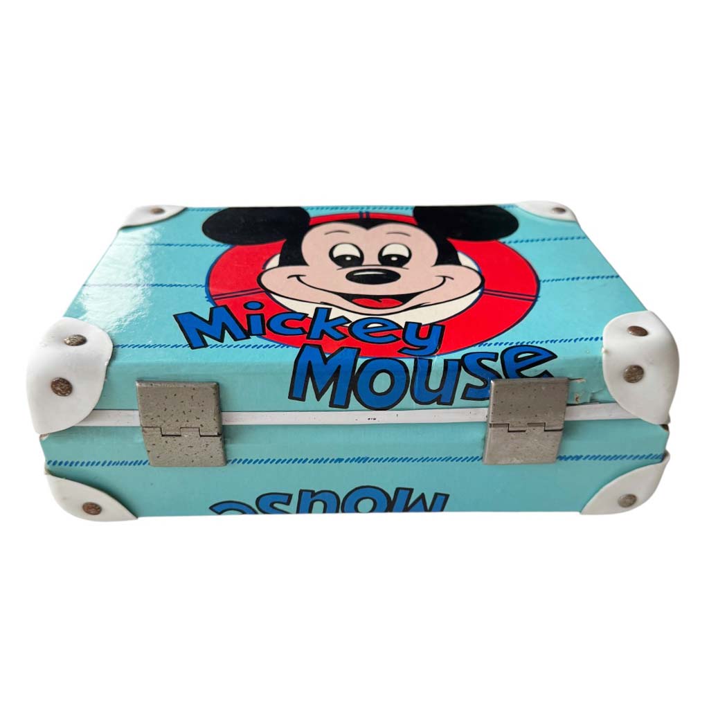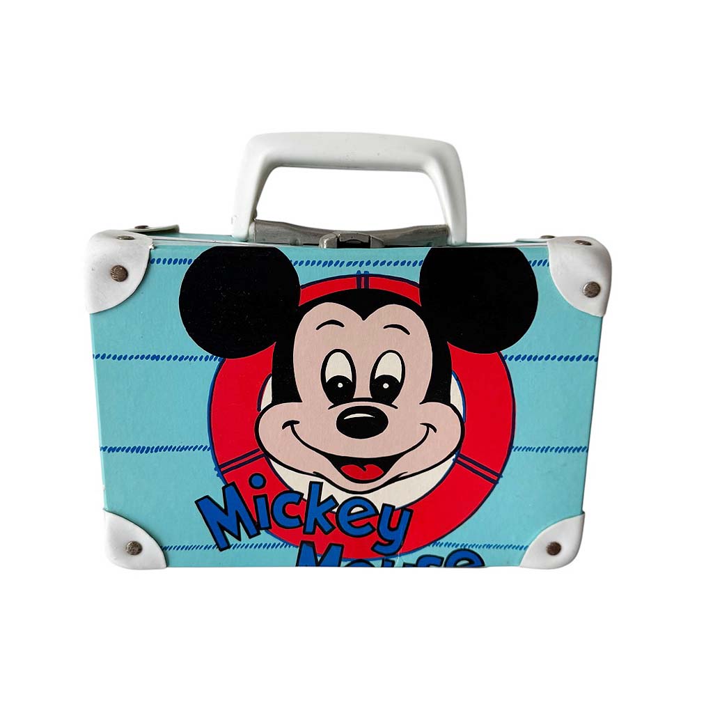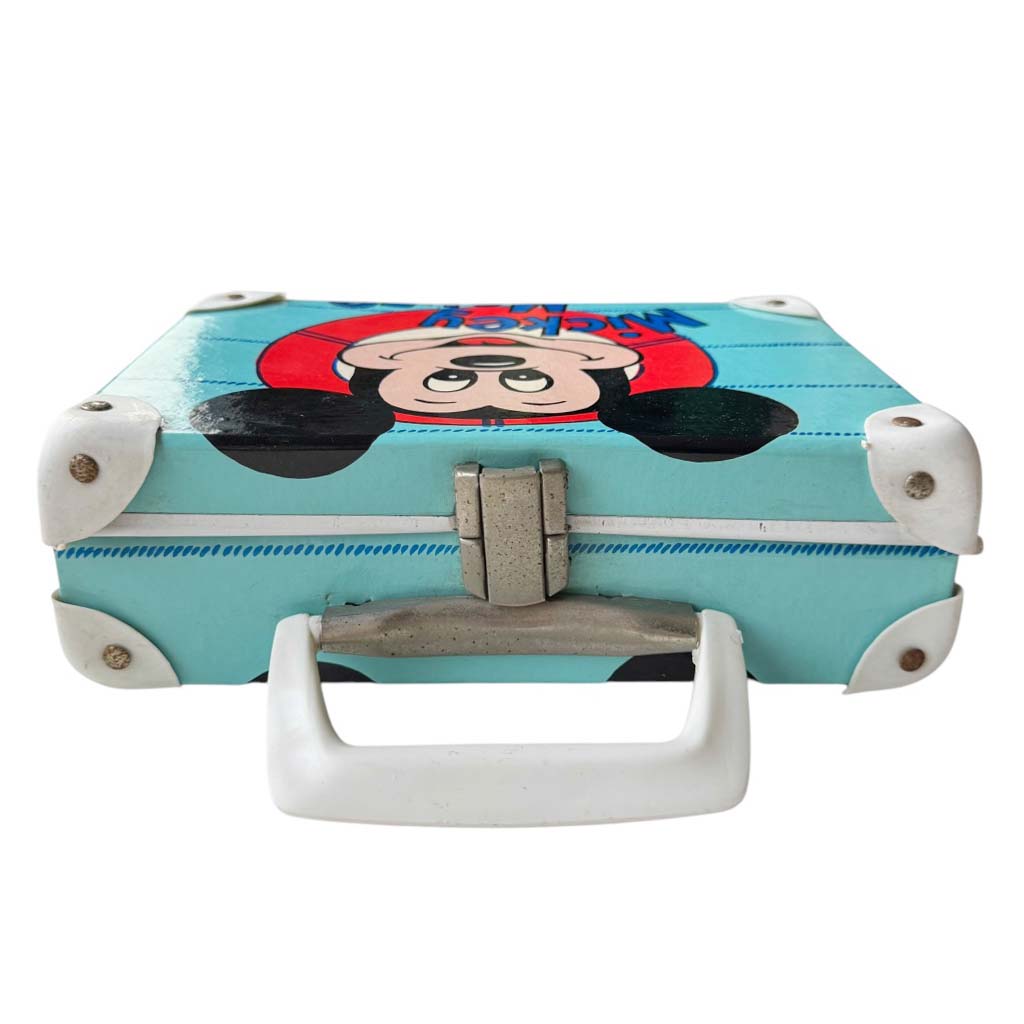 Valisette Mickey Walt Disney Elephant Paris Vintage Petite valise en carton à l’effigie de Mickey Mouse, la poignée et les quatre coins sont en plastique, vintage des années 70 Dimensions : 25 cm X 17 cm, Hauteur 7 cm, Profondeur 7 cm, bon état général malgré deux trous (voir photos) à signaler
