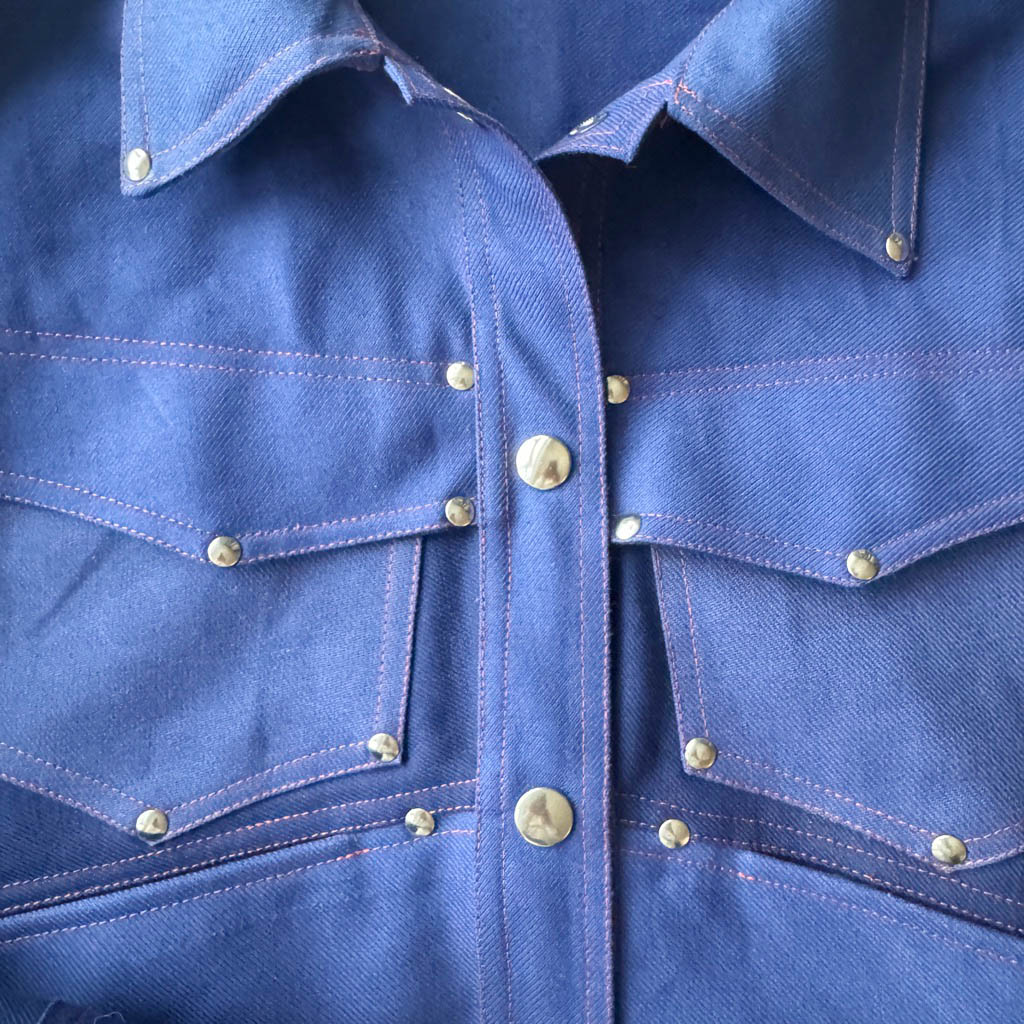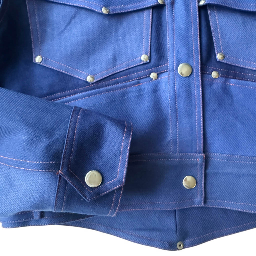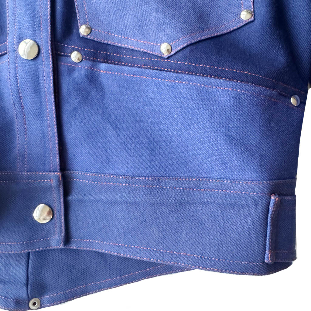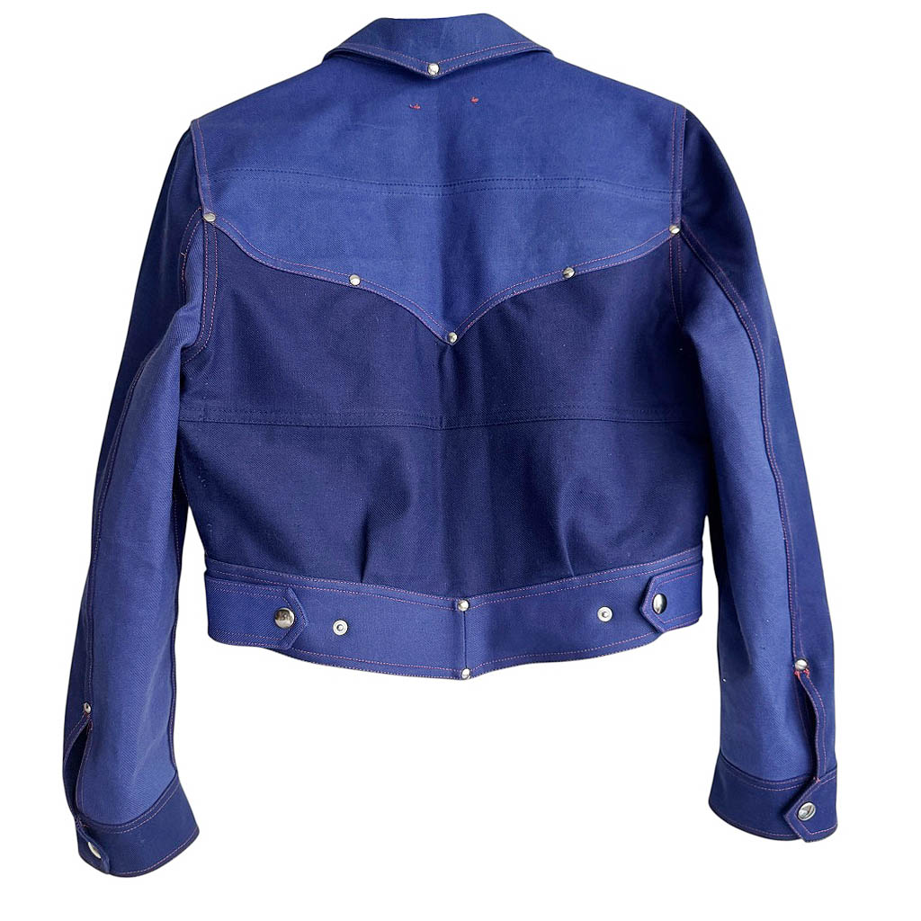 Vegas Jacket blue worker N26 Elephant Paris Design La veste Vegas mixte est une pièce emblématique et numérotée, la NS26 est réalisée en pluri toiles de coton, dites “bleus de chauffe” aux bleus différends, issus de plusieurs chutes de belles toiles anciennes de travail en pur coton.Les finitions sont gansées au biais de coton couleur orange fluo, elles soulignent la coupe et mettent en valeur le travail artisanal. Ce modèle permet d’utiliser de nombreux morceaux de tissus, dans une logique de zéro déchet et de valorisation des matériaux existants. Une démarche à la fois écologique et esthétique, au cœur de la philosophie d’Elephant Paris. Les rivets et…
