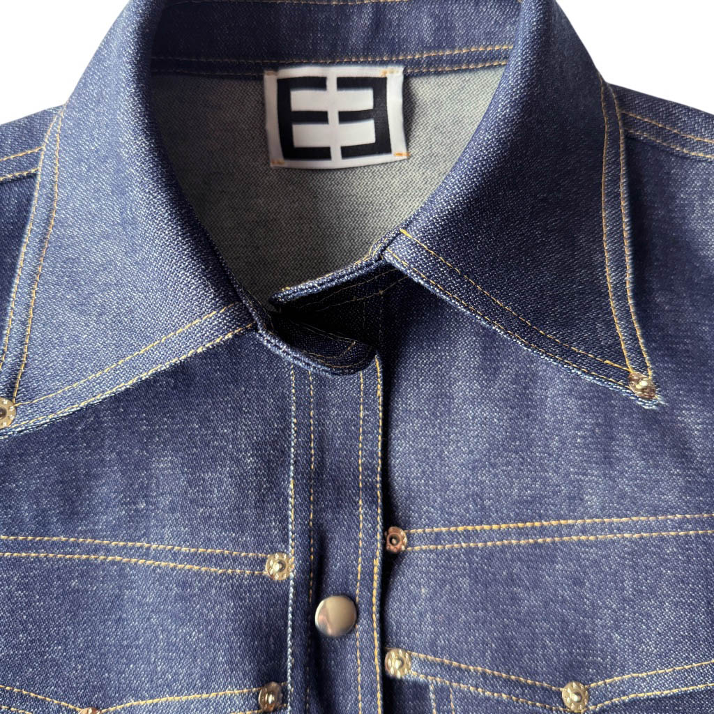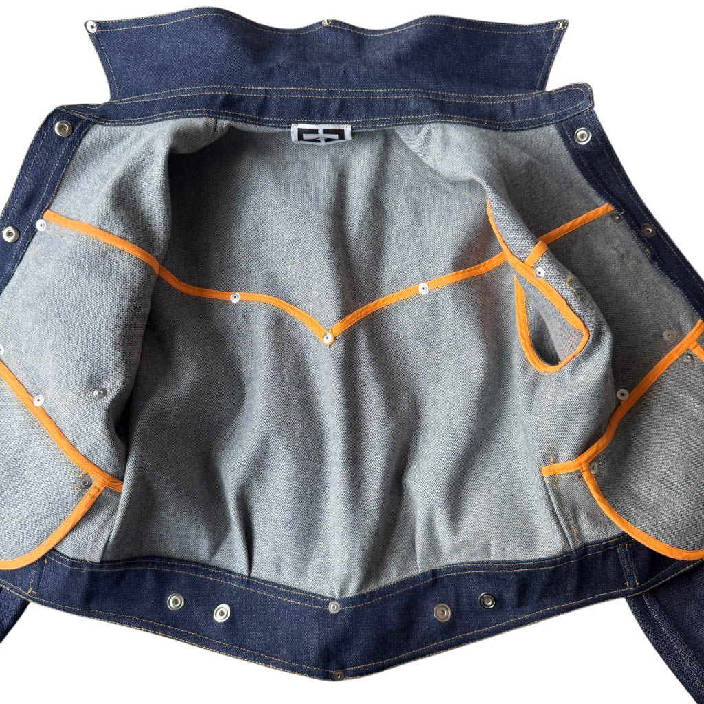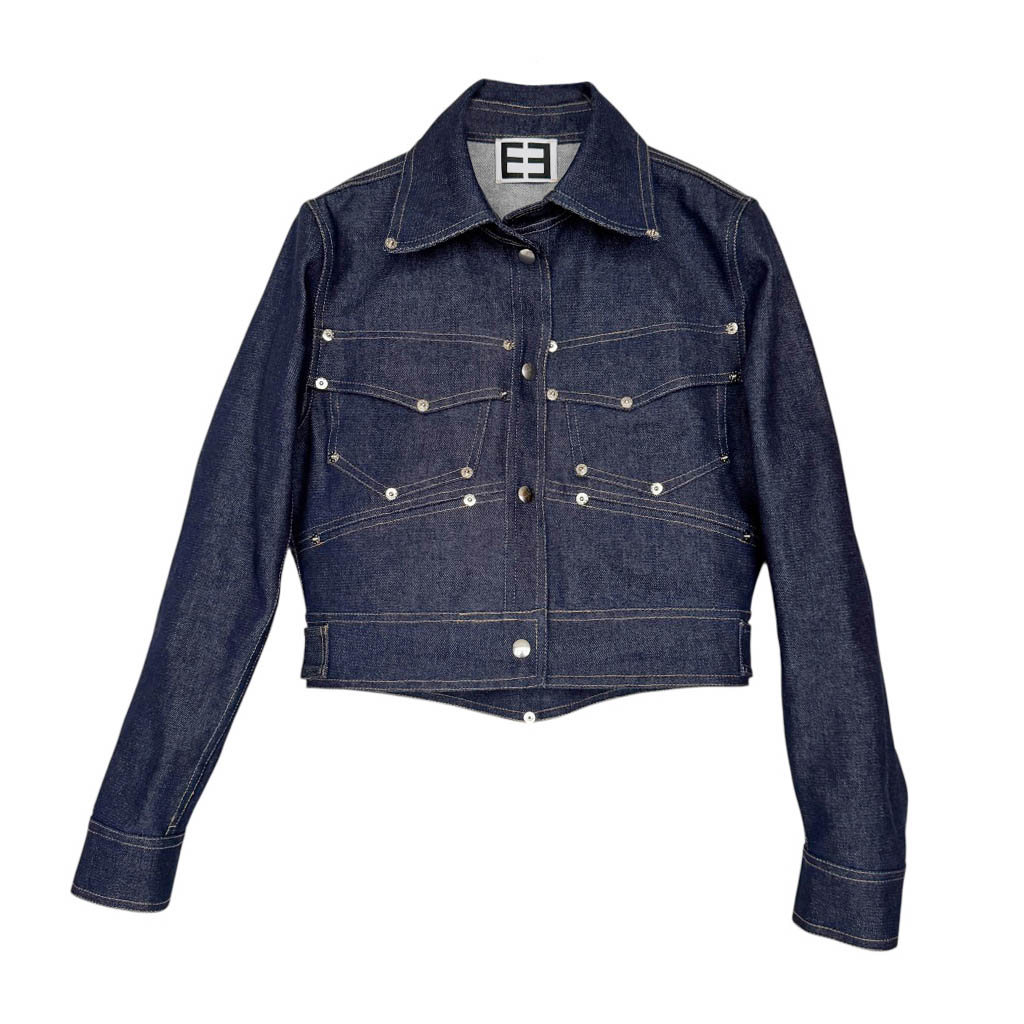 Vegas Jacket Fureur de vivre Denim N22 Elephant Paris Design La veste Vegas mixte est une pièce emblématique et numérotée, la NS22 est réalisée en denim épais 1 0 0 % coton Les finitions sont gansées au biais de coton couleur orange, elles soulignent la coupe et mettent en valeur le travail artisanal. Ce modèle permet d’utiliser de nombreux morceaux de tissus, dans une logique de zéro déchet et de valorisation des matériaux existants. Une démarche à la fois écologique et esthétique, au cœur de la philosophie d’Elephant Paris. Les rivets et pressions en métal couleur argent, sont fabriqués en Italie, et sont posés à…