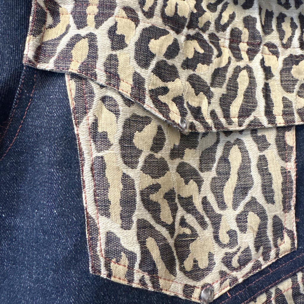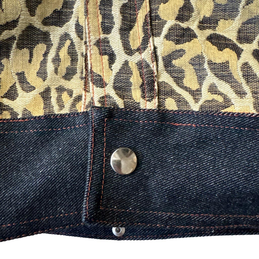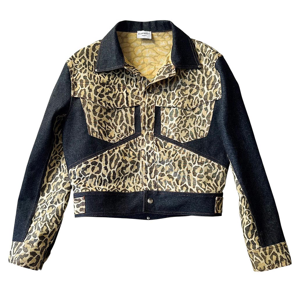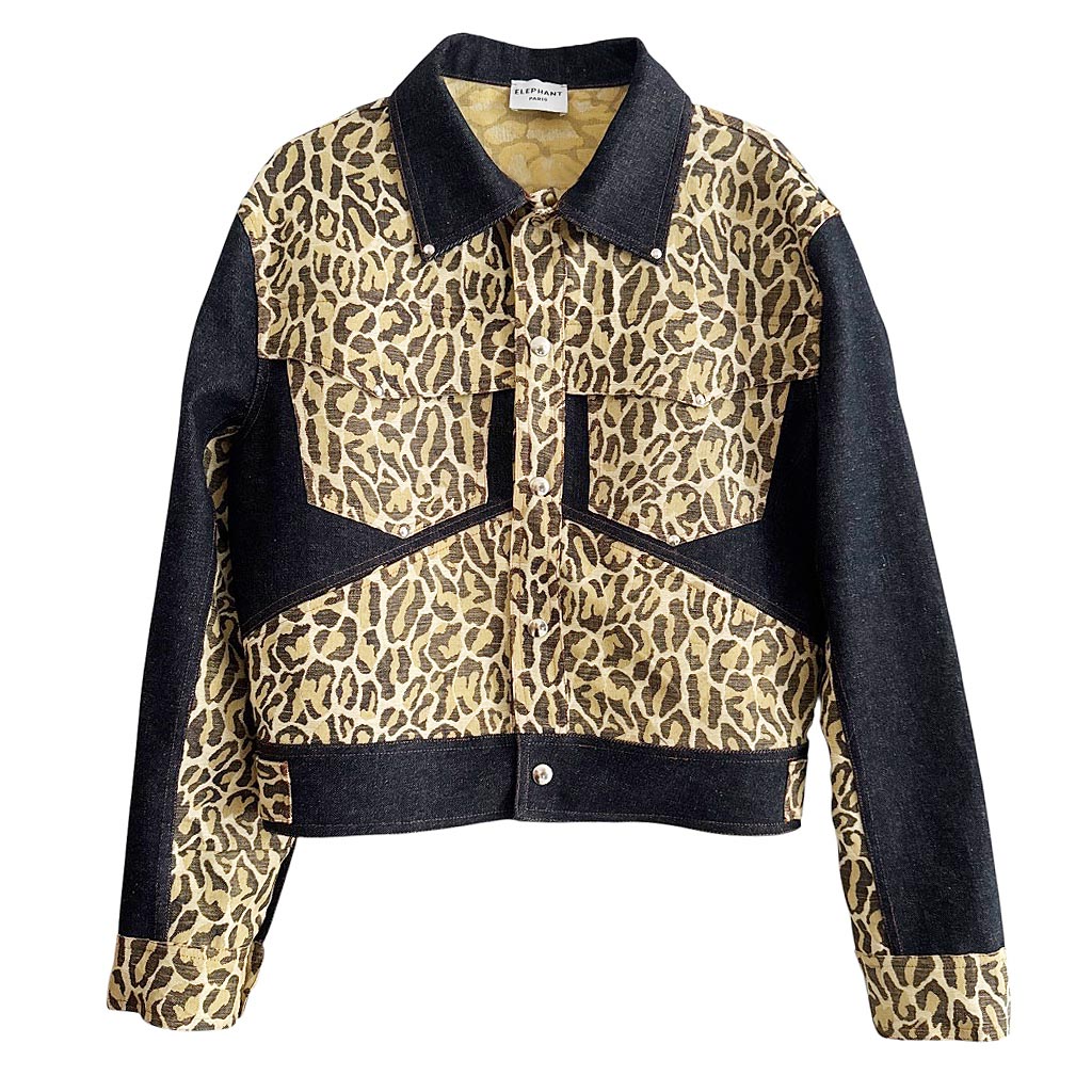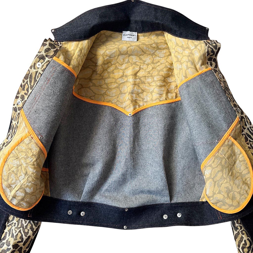 Vegas Jacket Leopard Denim T48 Elephant Paris Design Ce design est réalisé avec une toile épaisse de denim ancien et une toile d’ameublement tissée léopard, 1 0 0 % coton, les finitions sont gansées au biais de coton orange Cette pièce unique est entièrement fabriquée à Paris, les rivets et les pressions sont en métal argenté, fabriquées en Italie et posées à la main à Paris Mesures prises à plat : Epaules : 4 8 c m, Poitrine : 5 5 c m, Longueur dos : 5 9 c m, Longueur devant : 4 9 c m, Taille globale 4…
